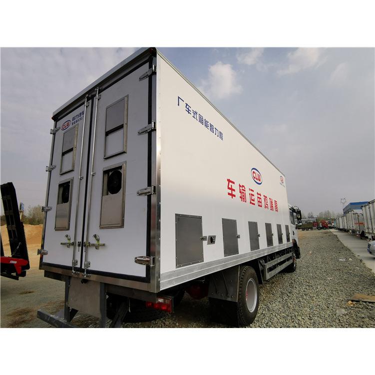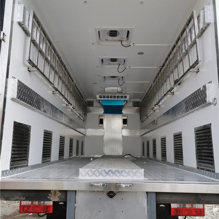 Vehículo Especial para Transporte de Ganado y Aves de CorralEl dispositivo dedicado es una caja,Esta carrocería está hecha de material de aleación de aluminio, utilizada principalmente para el transporte de ganado y aves de corral, donde la longitud interior de la caja de carga delantera (mm): 1200, utilizada para instalar la unidad de refrigeración y el tanque de agua, la longitud interior de la caja trasera (mm): 8080; cuando sin la caja delantera, la longitud interior de la carrocería (mm): 9350, el material de la carrocería adopta aleación de aluminio 6061-T5, las dimensiones de la sección transversal de los pilares laterales de la carrocería son solo 200x45mm; el chasis puede equiparse con una cabina, y puede equiparse con estructuras de corrales de dos, tres o cuatro pisos con o sin particiones, puede equiparse con una estructura de aire acondicionado en la parte delantera, puede equiparse con una estructura de doble puerta trasera para la carrocería, puede equiparse con diferentes estilos de plataformas elevadoras hidráulicas, la longitud horizontal de la plataforma elevadora hidráulica en estado retraído es de 280mm; dimensiones generales del vehículo longitud(mm) 12000×2550×3980.