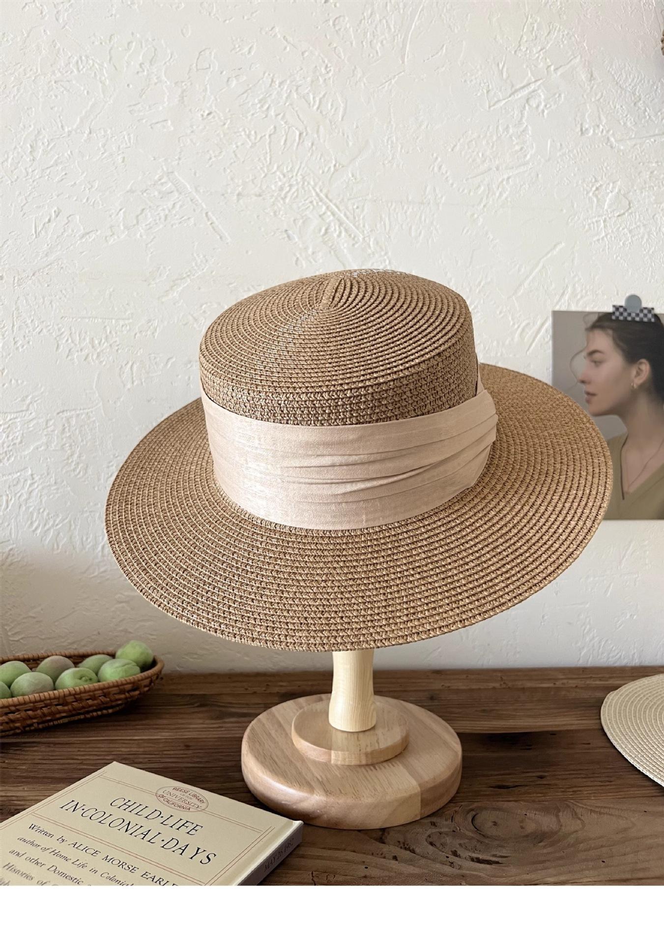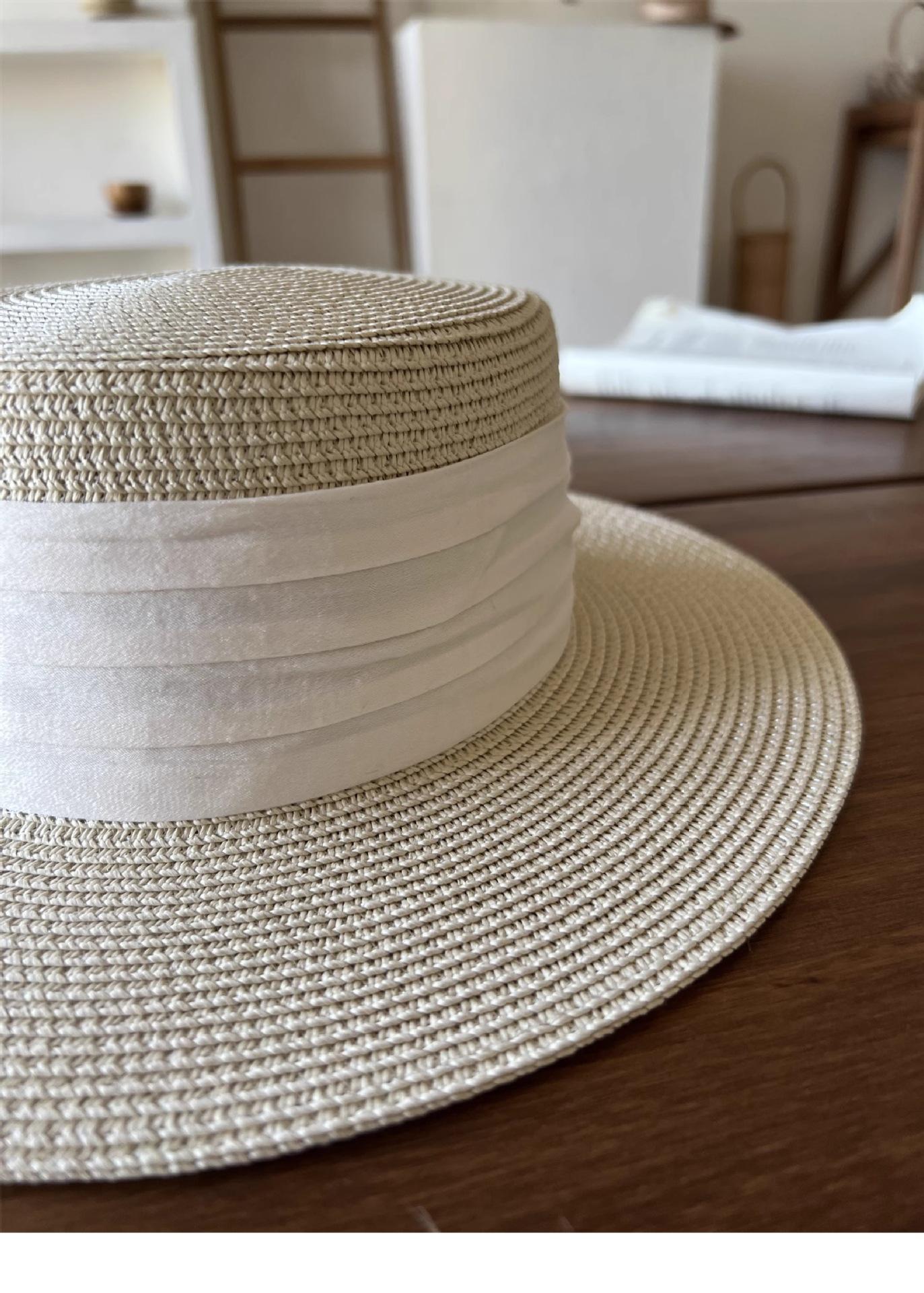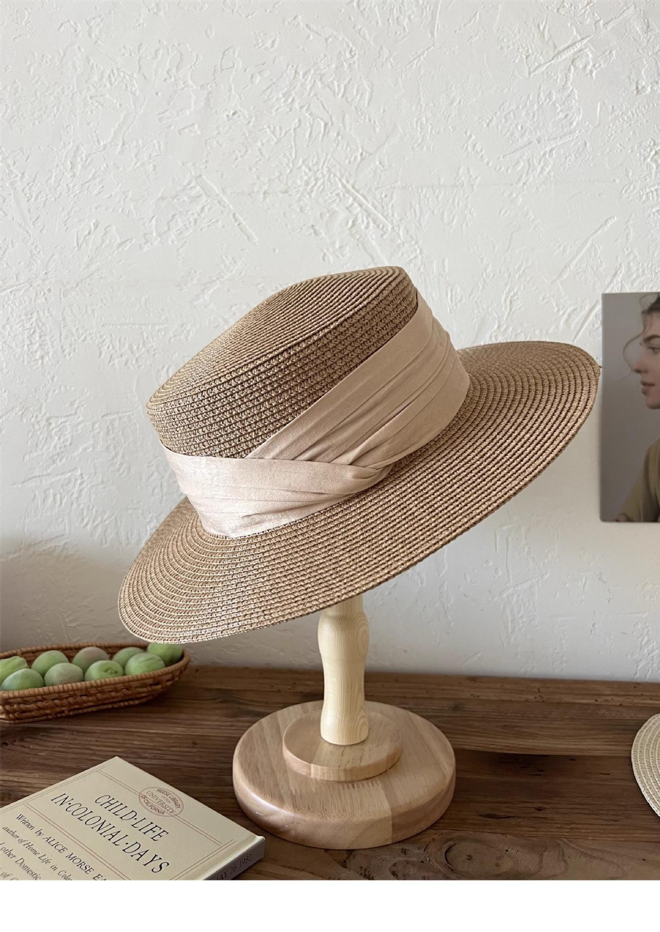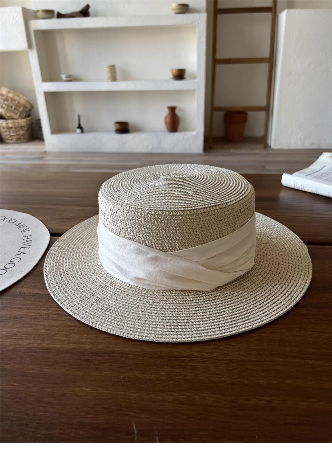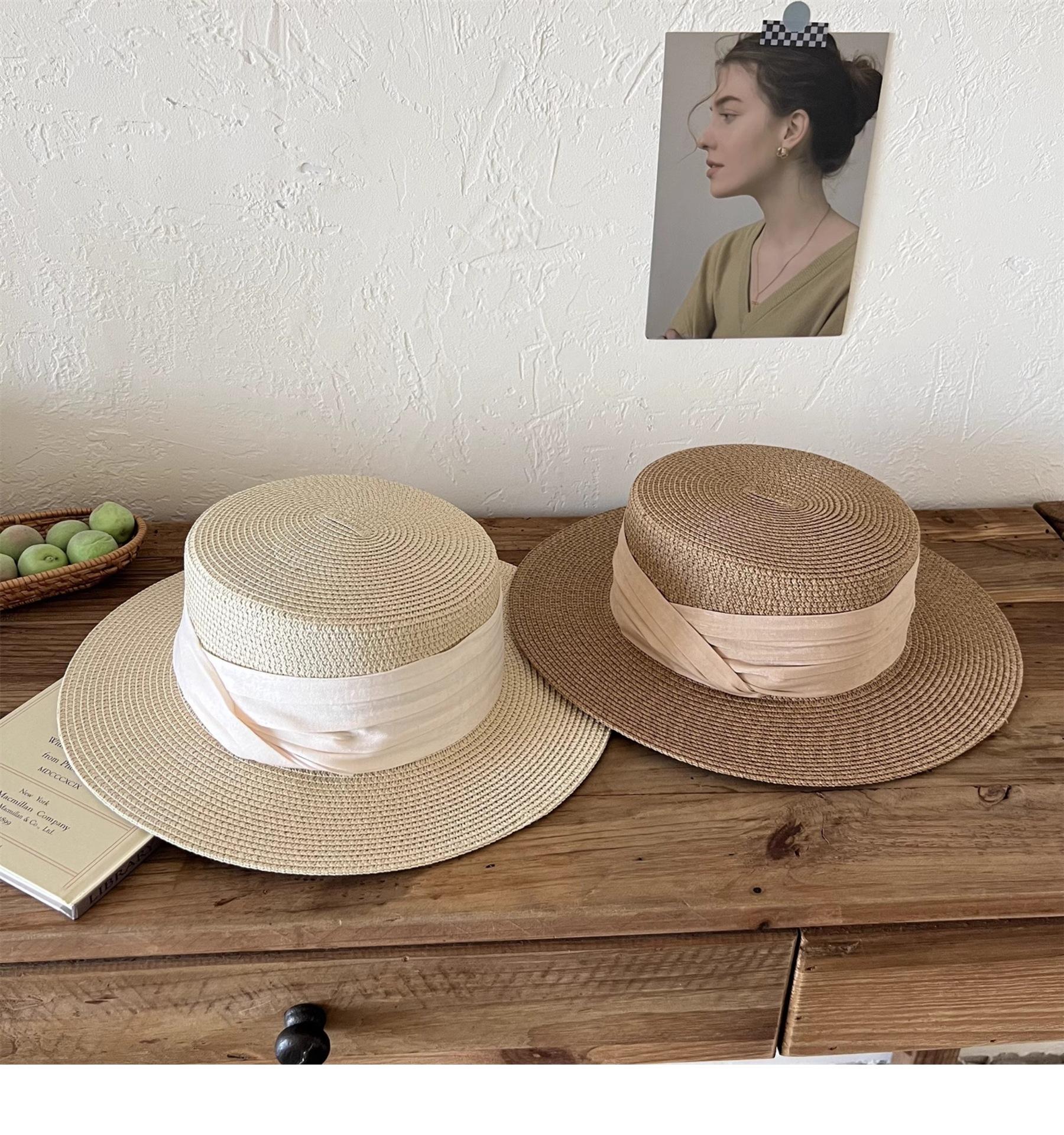 Mismo estilo que la playa, temperamento francés, sombrero de paja retro de copa plana para protección solar para mujer, sombrero de sol para vacaciones de verano junto al mar