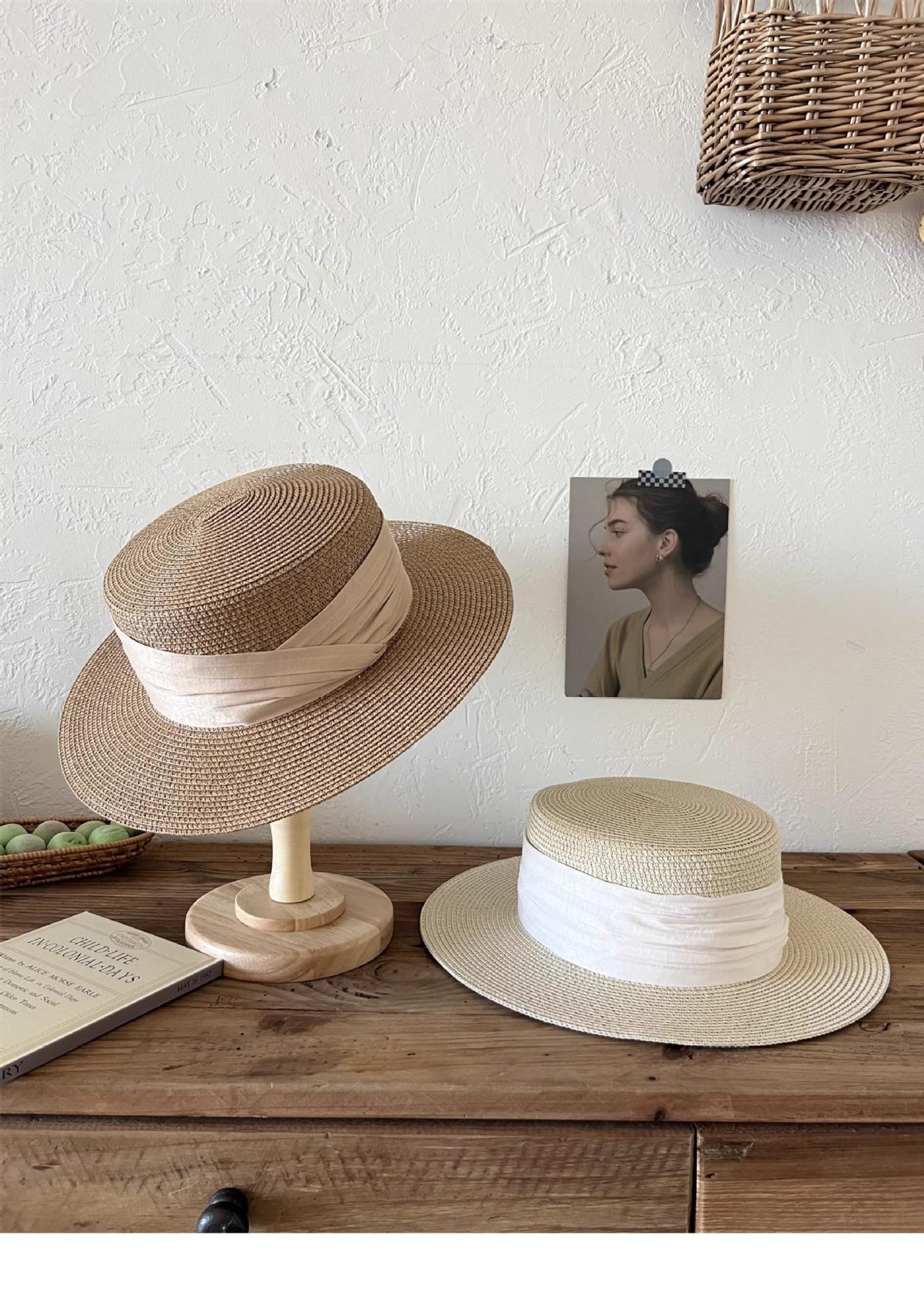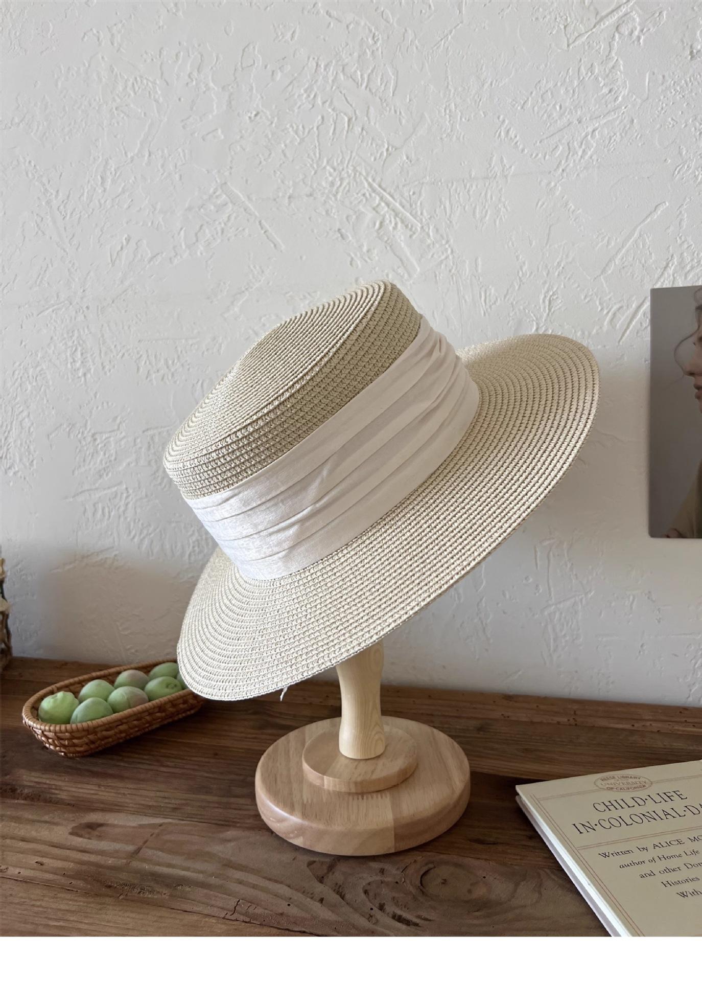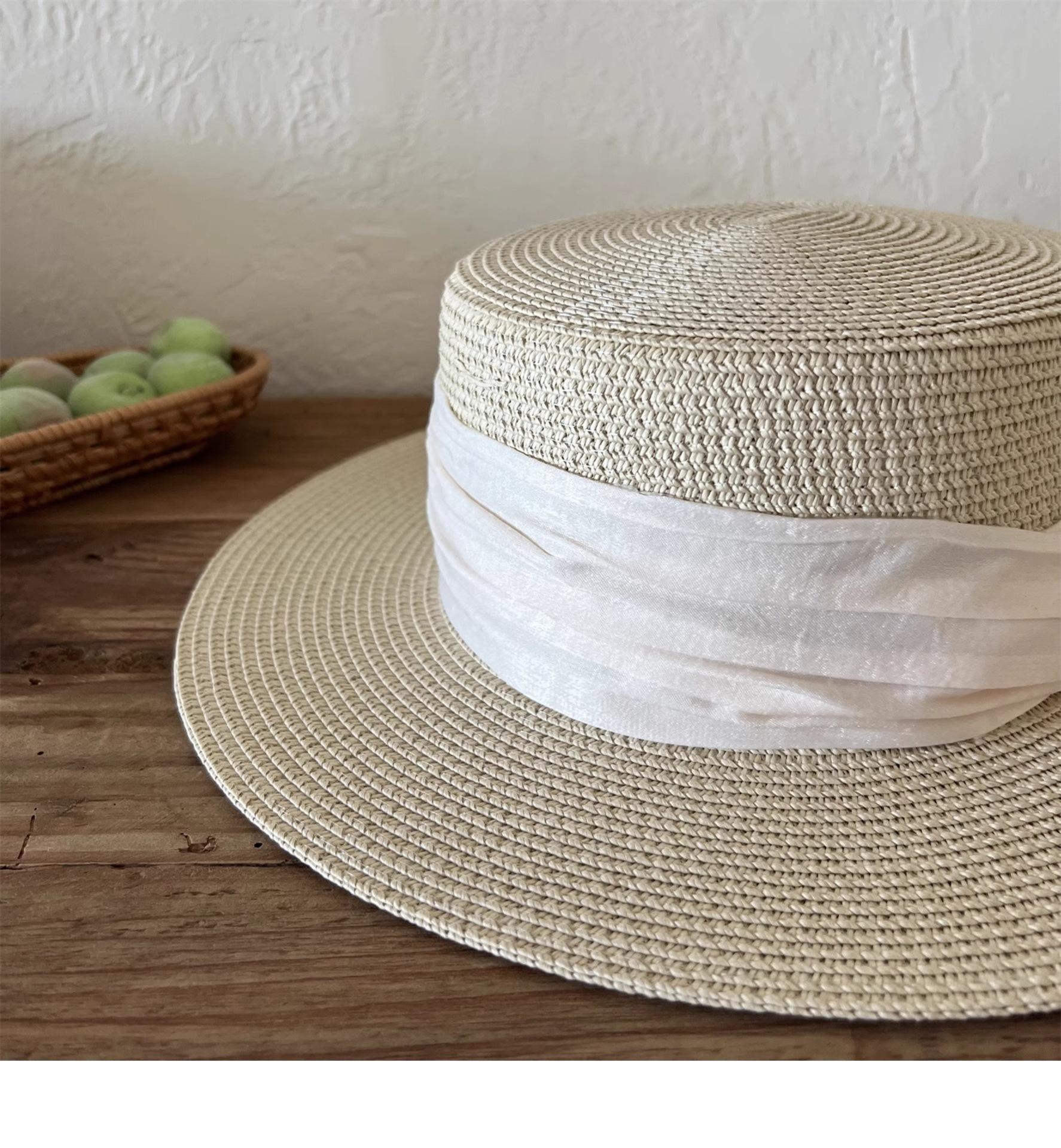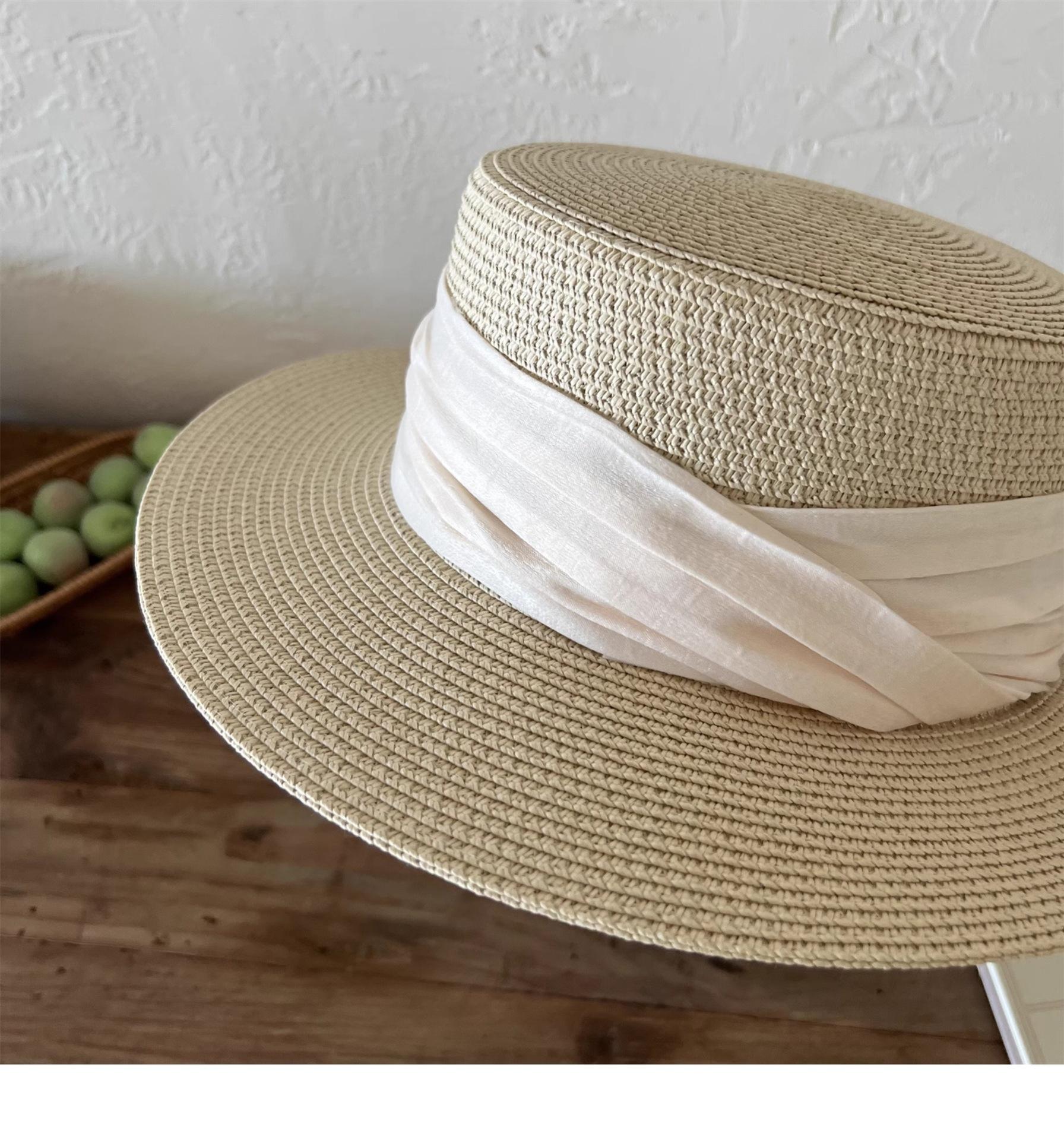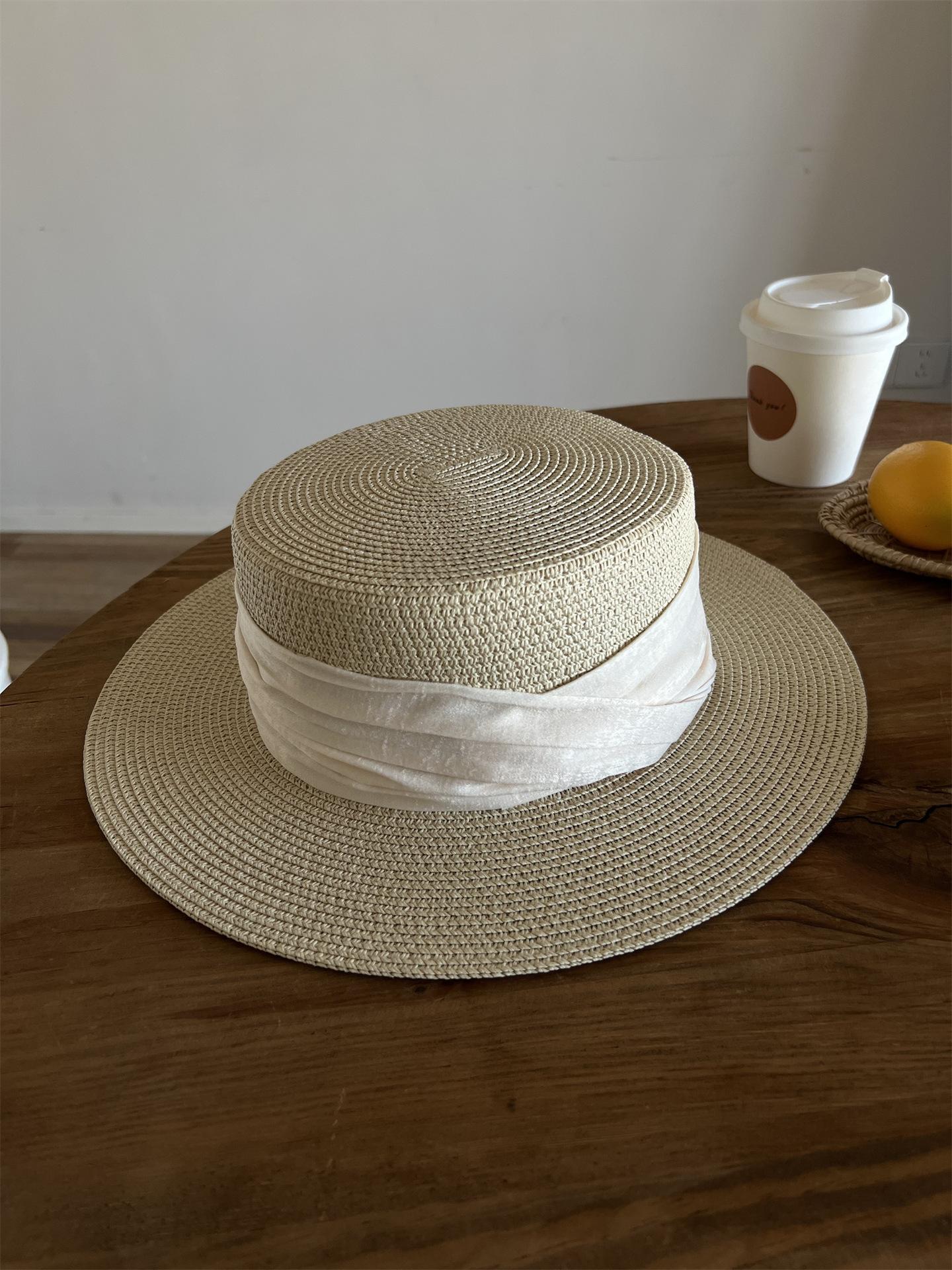 Mismo estilo que la playa, temperamento francés, sombrero de paja retro de copa plana para protección solar para mujer, sombrero de sol para vacaciones de verano junto al mar