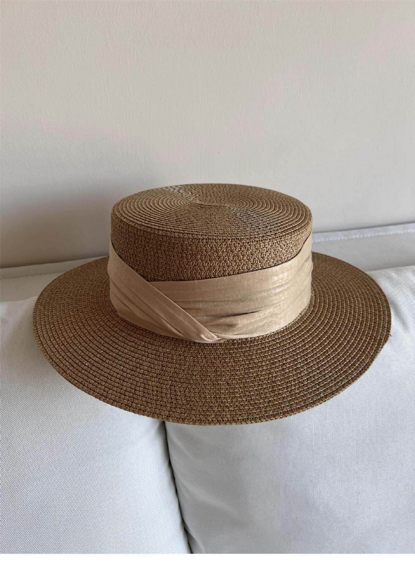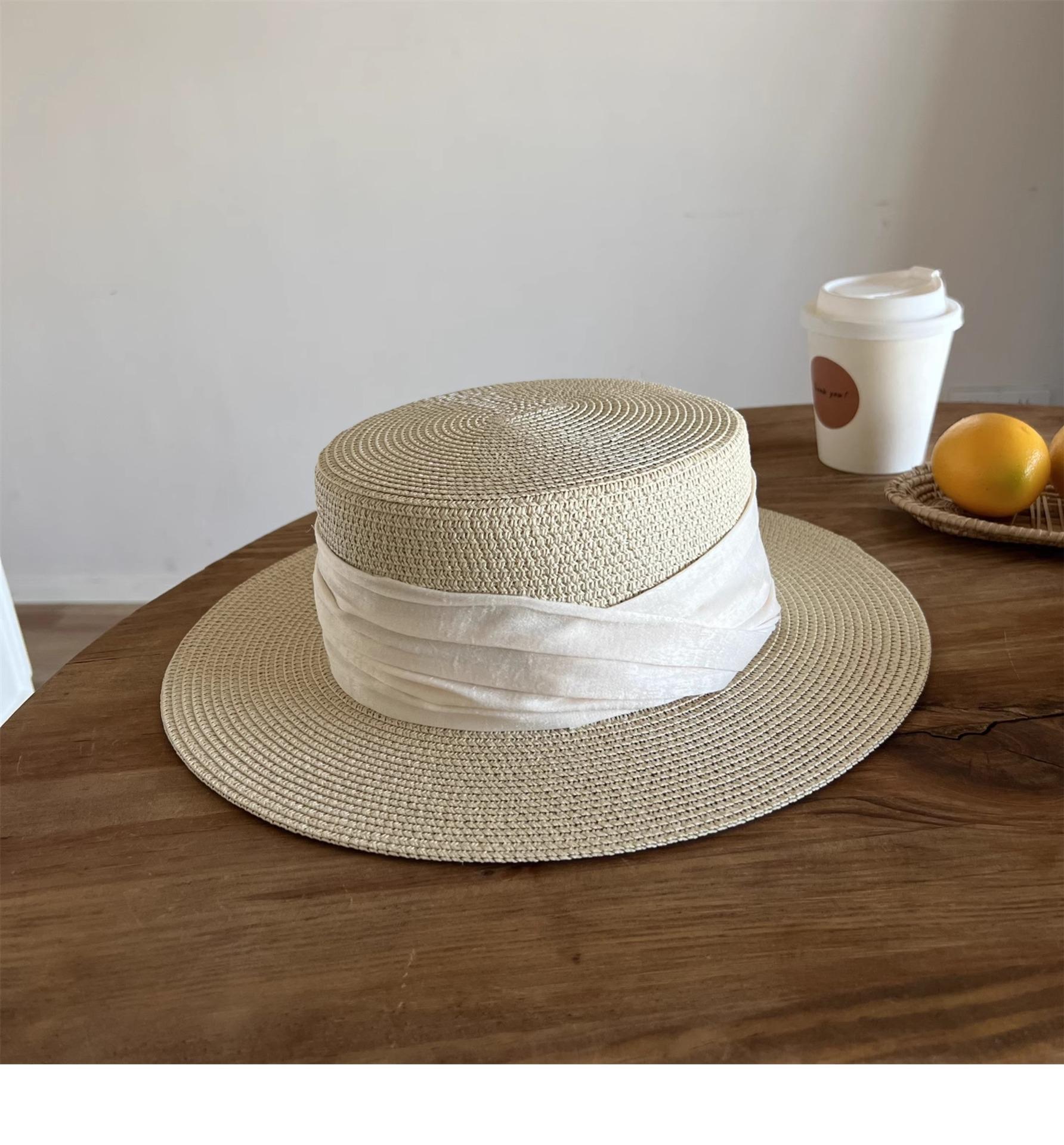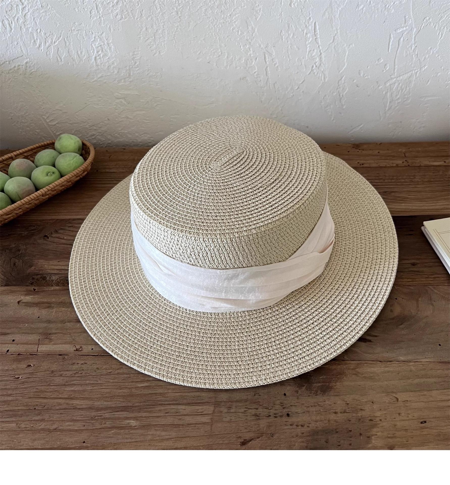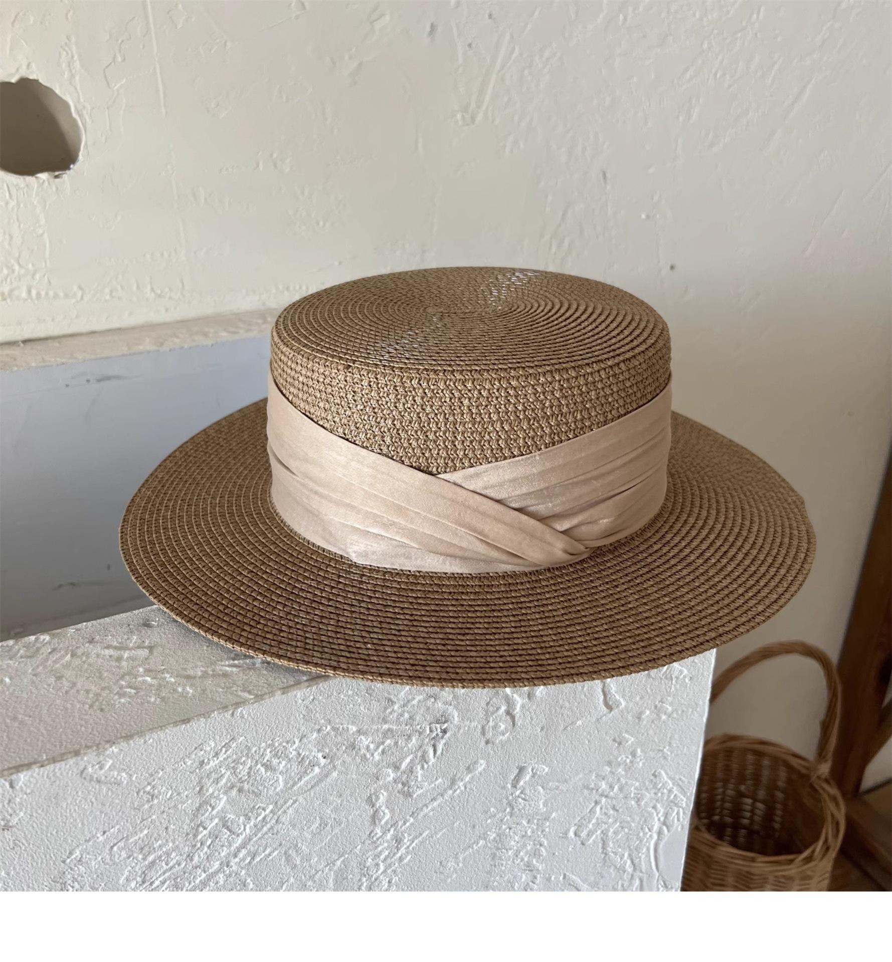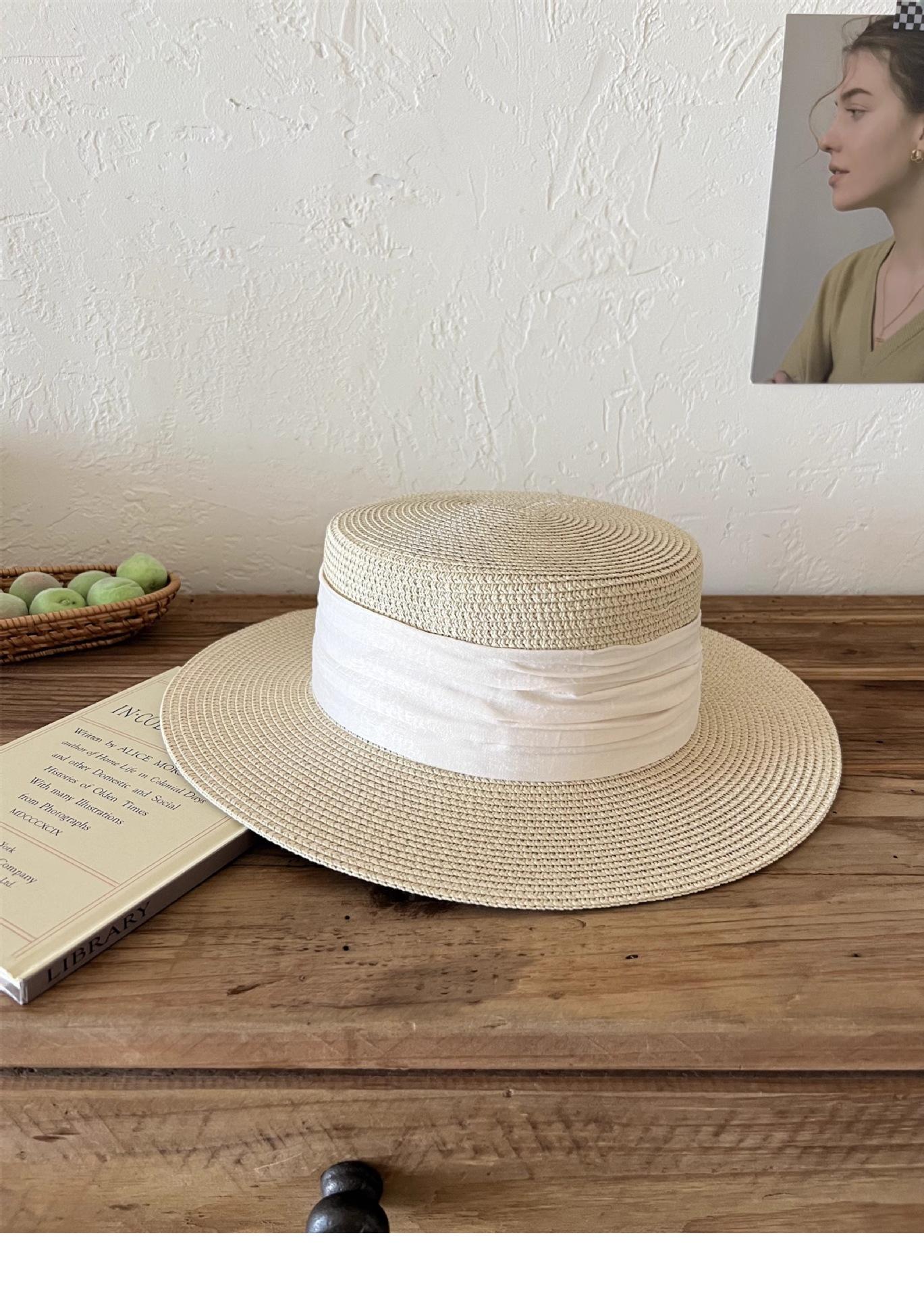 Mismo estilo que la playa, temperamento francés, sombrero de paja retro de copa plana para protección solar para mujer, sombrero de sol para vacaciones de verano junto al mar