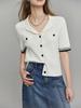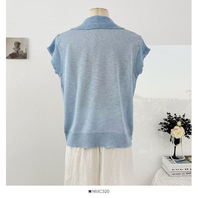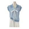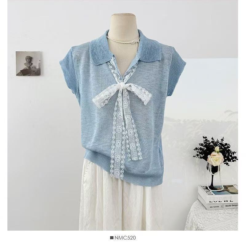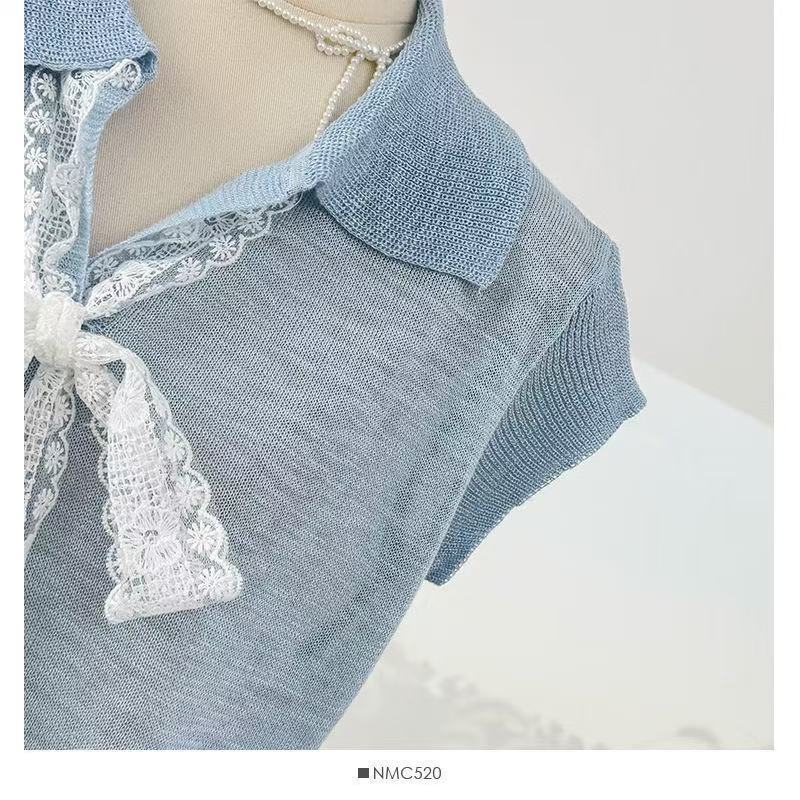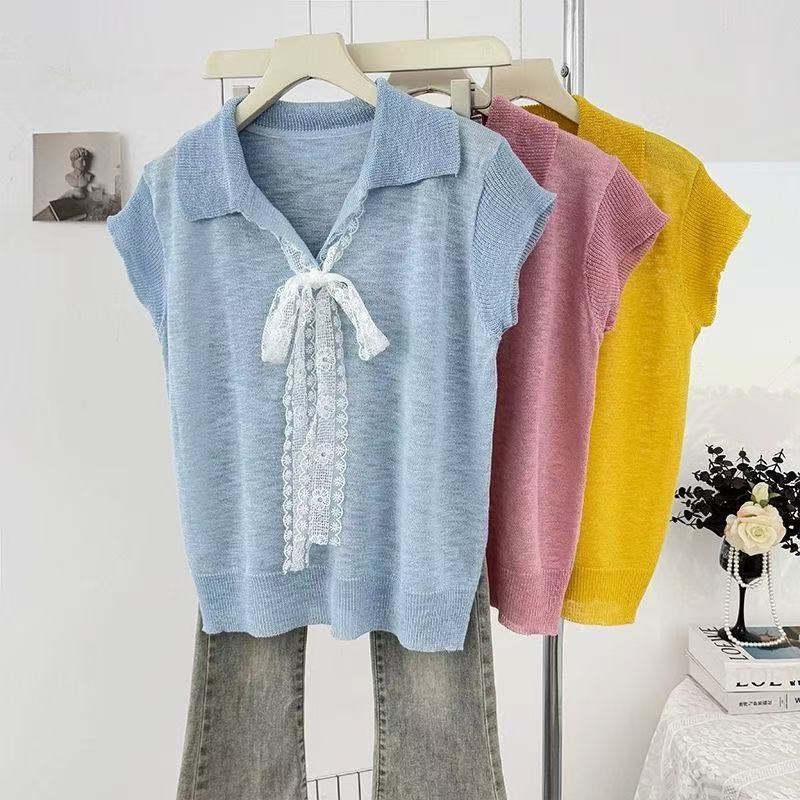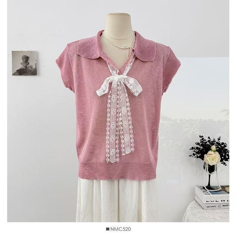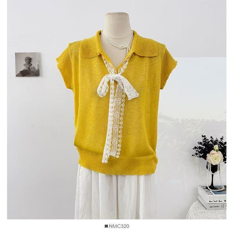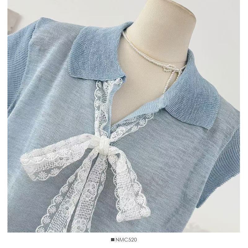 Camiseta de Manga Corta con Cuello Vuelto y Cordones de Diseño Coreano para Mujer Verano 2026 Top de Punto Único con Temperamento Reductor de Edad