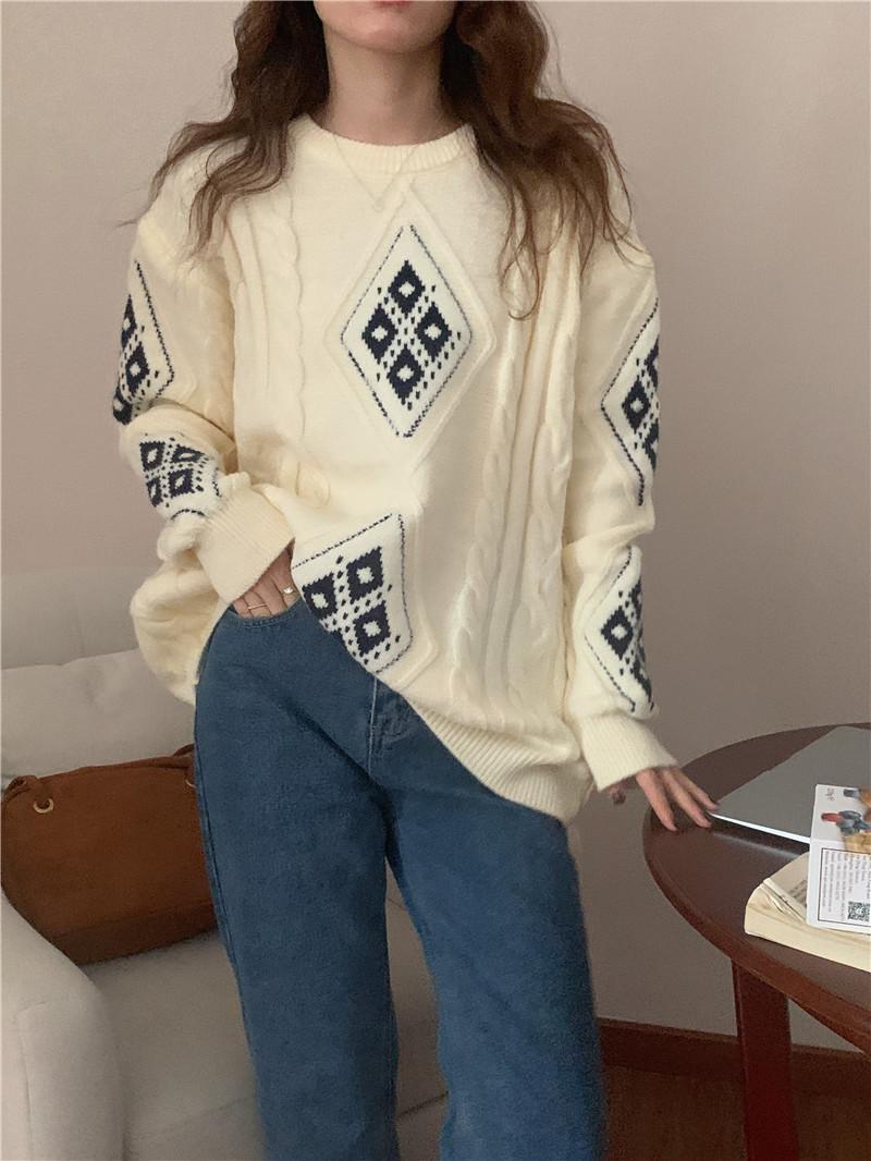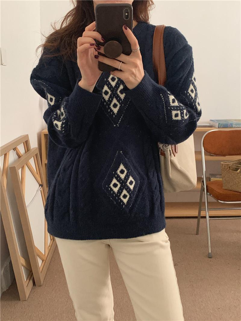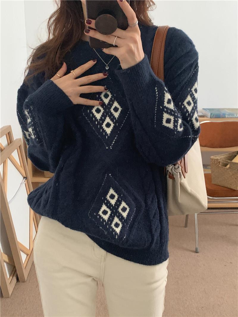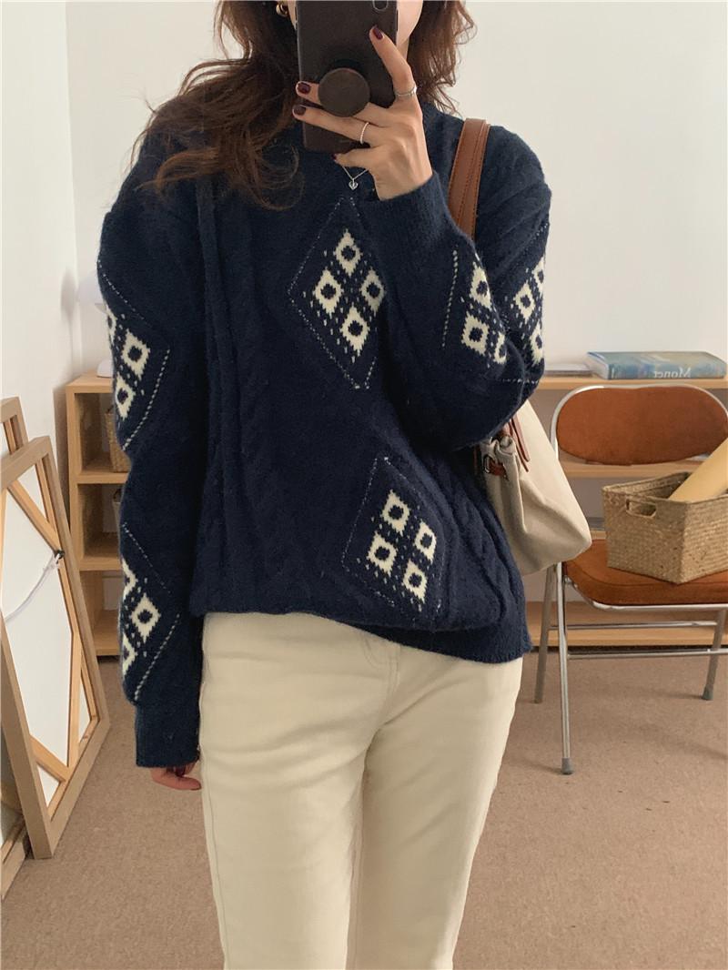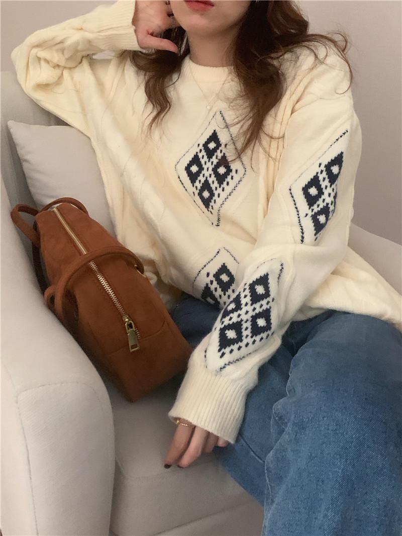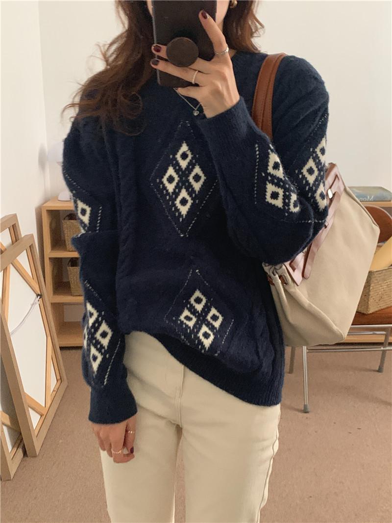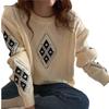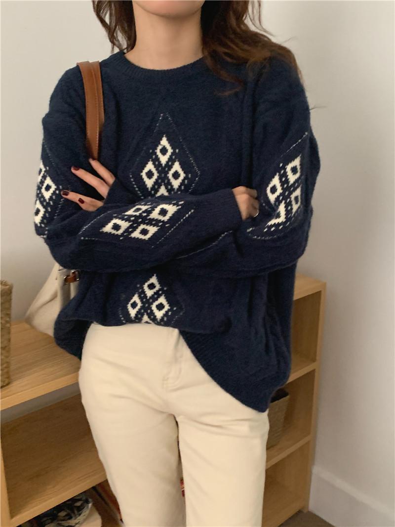 Suéter Pulóver Rómbico Estilo Coreano para Mujer Otoño e Invierno Suave Ceroso Holgado Adelgazante Cuello Redondo Base Exterior Top de Punto