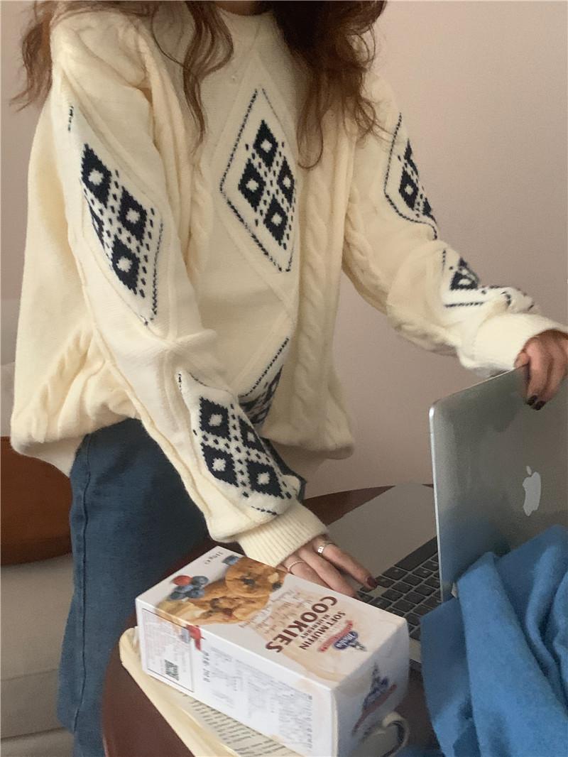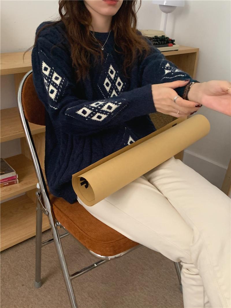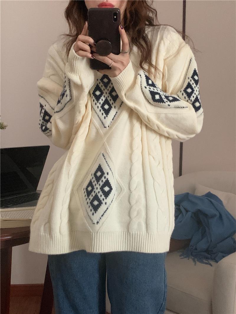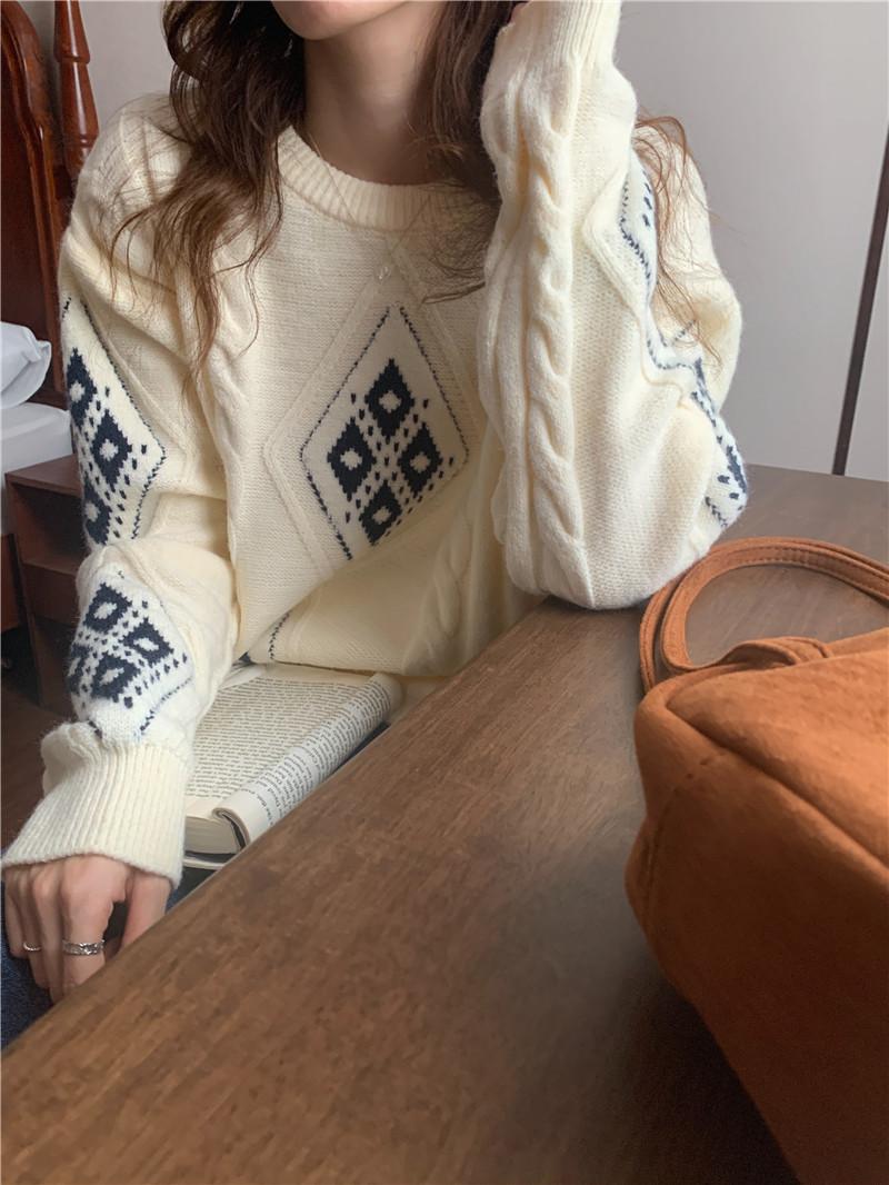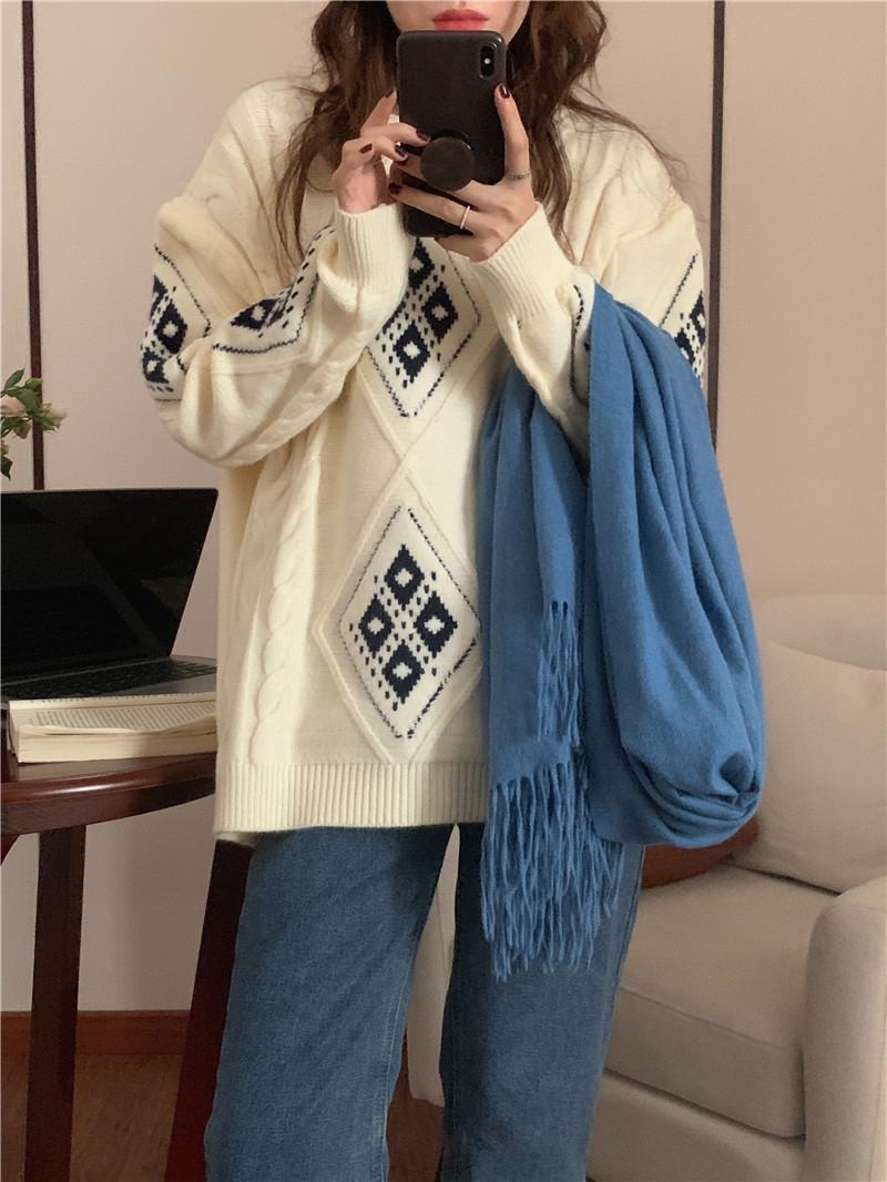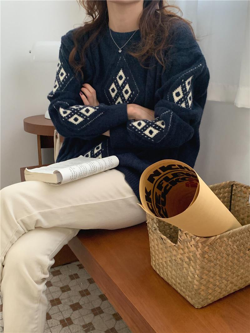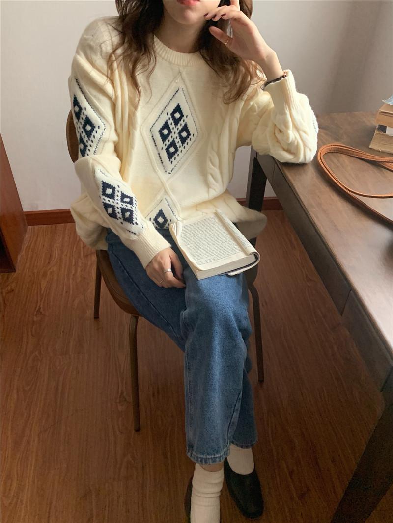 Suéter Pulóver Rómbico Estilo Coreano para Mujer Otoño e Invierno Suave Ceroso Holgado Adelgazante Cuello Redondo Base Exterior Top de Punto