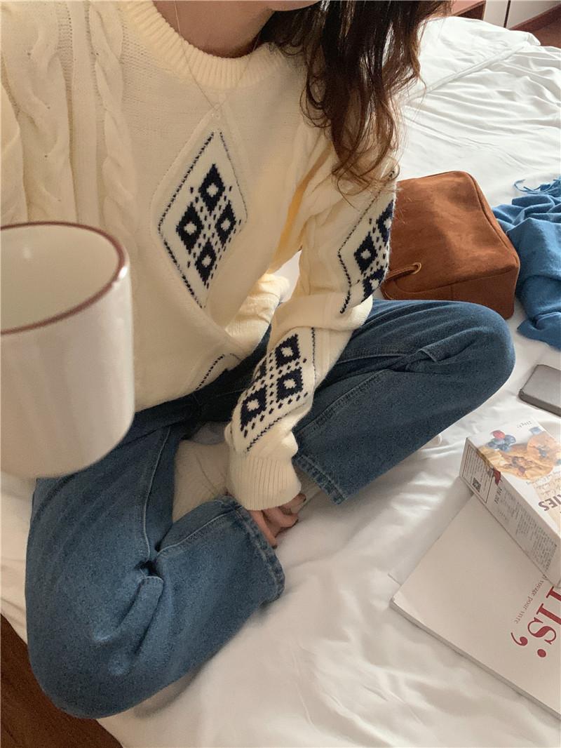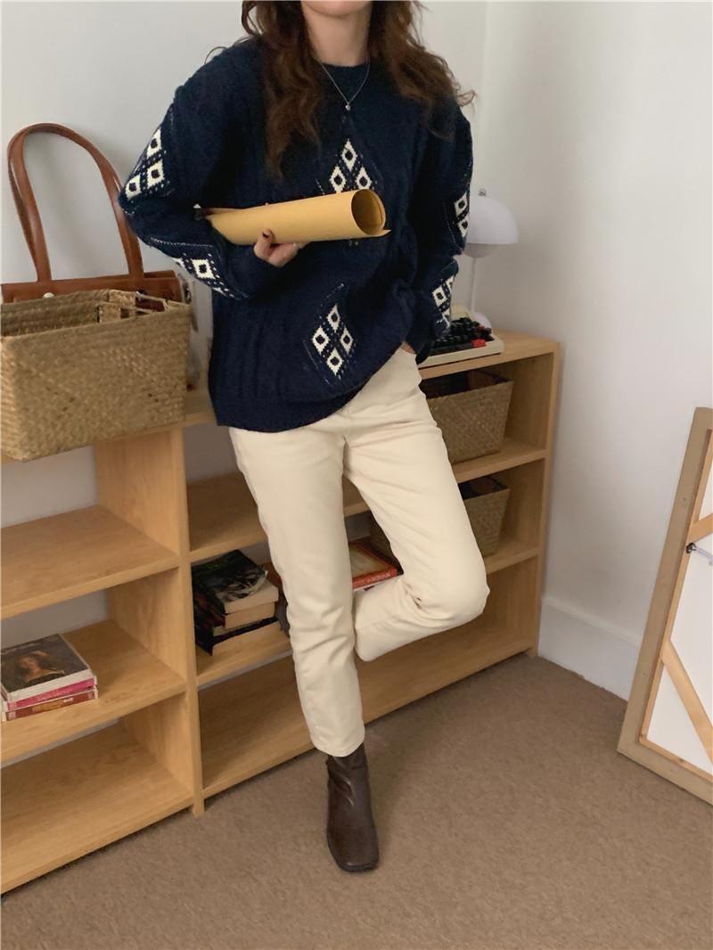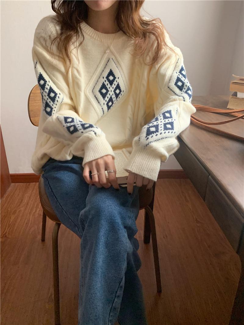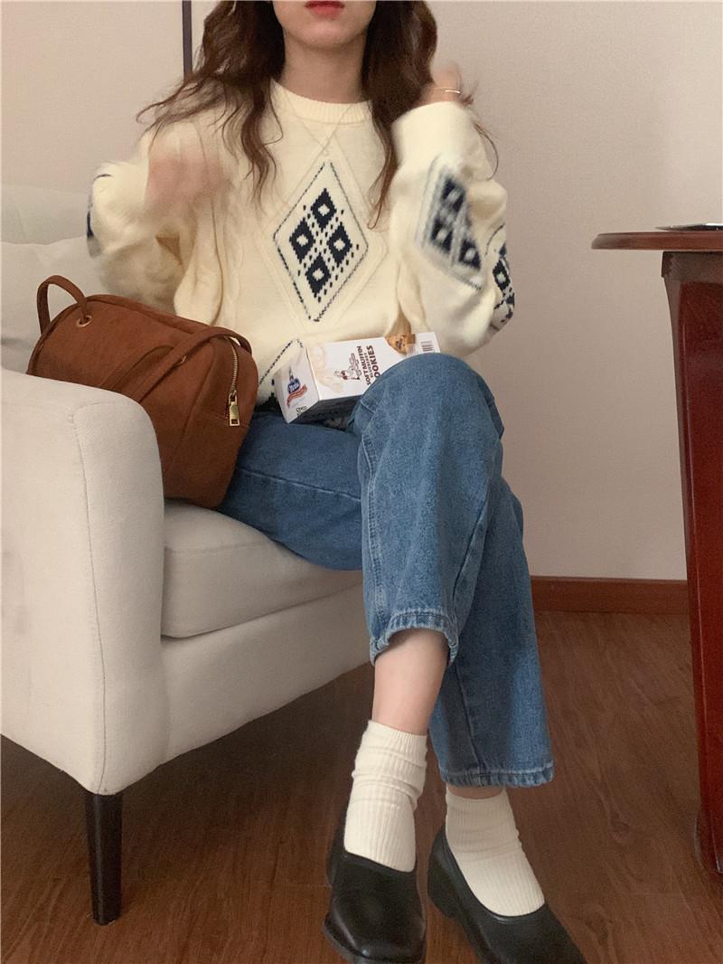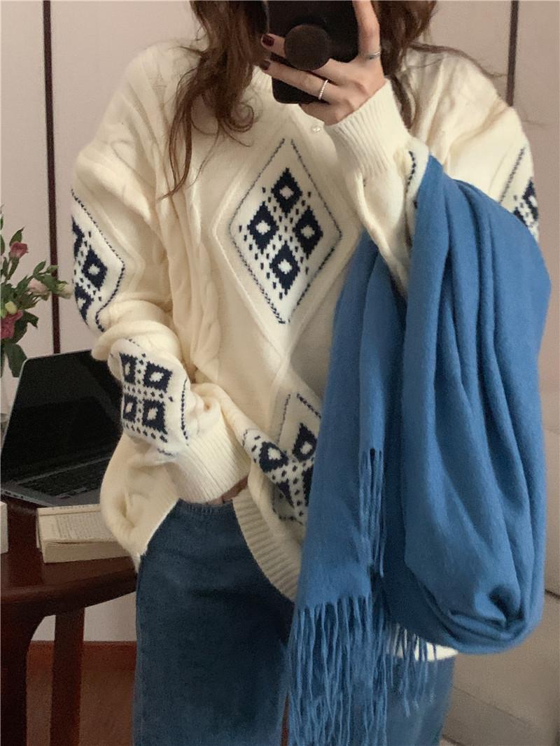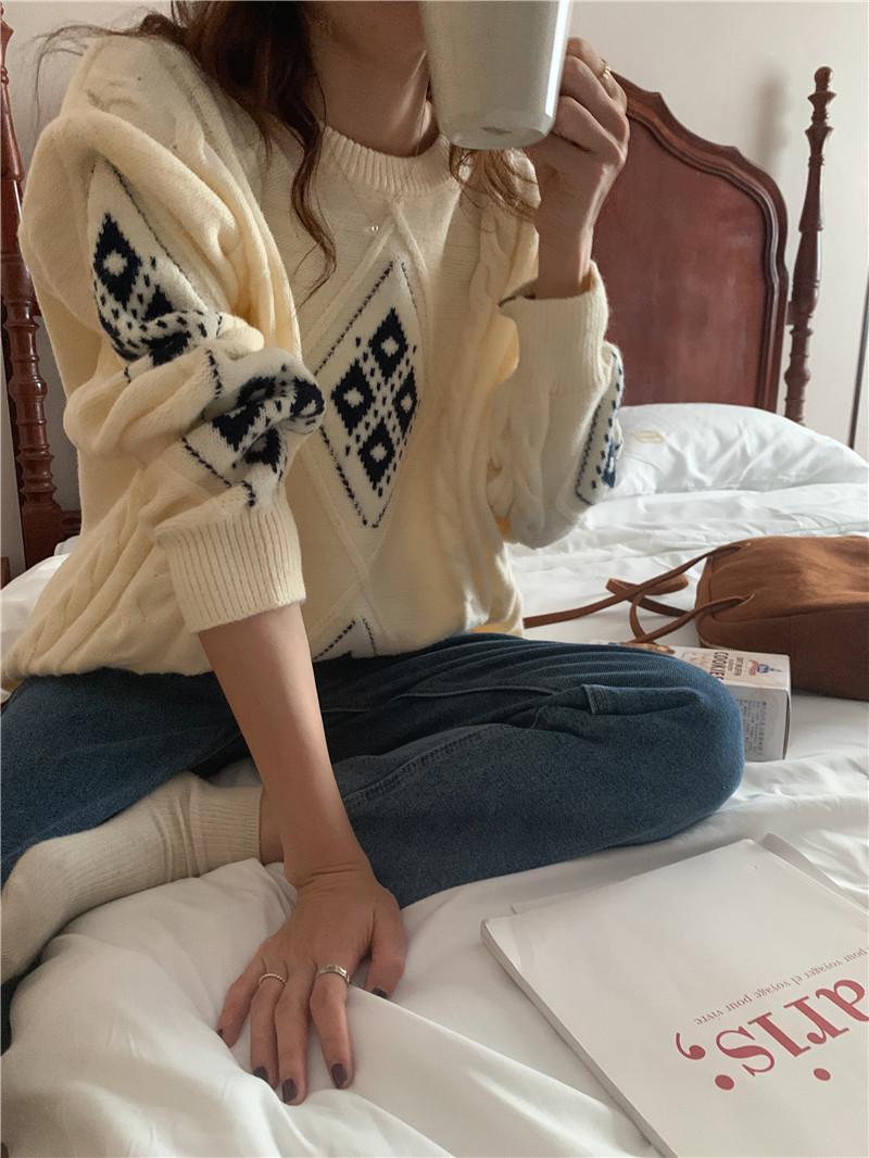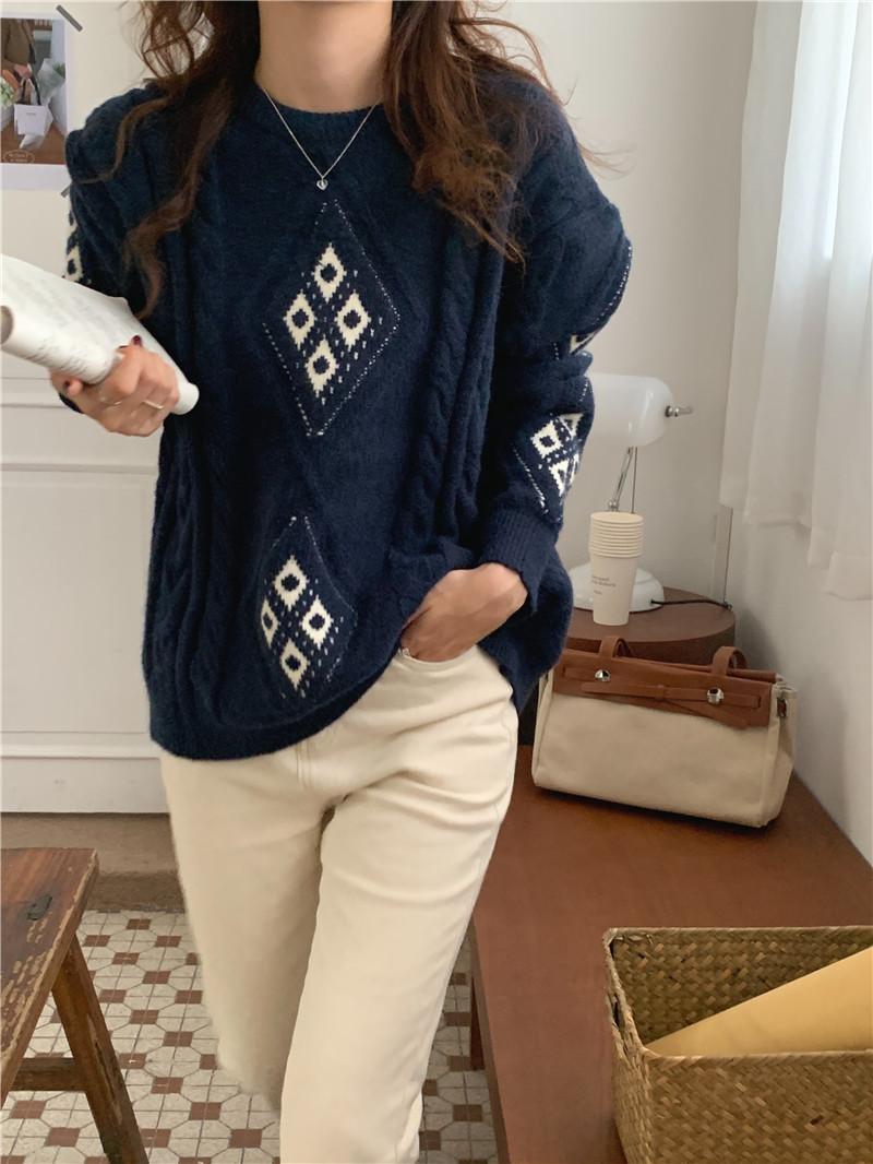 Suéter Pulóver Rómbico Estilo Coreano para Mujer Otoño e Invierno Suave Ceroso Holgado Adelgazante Cuello Redondo Base Exterior Top de Punto