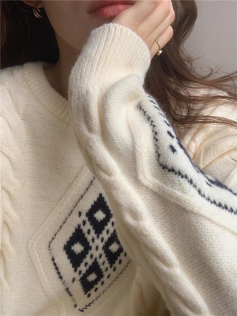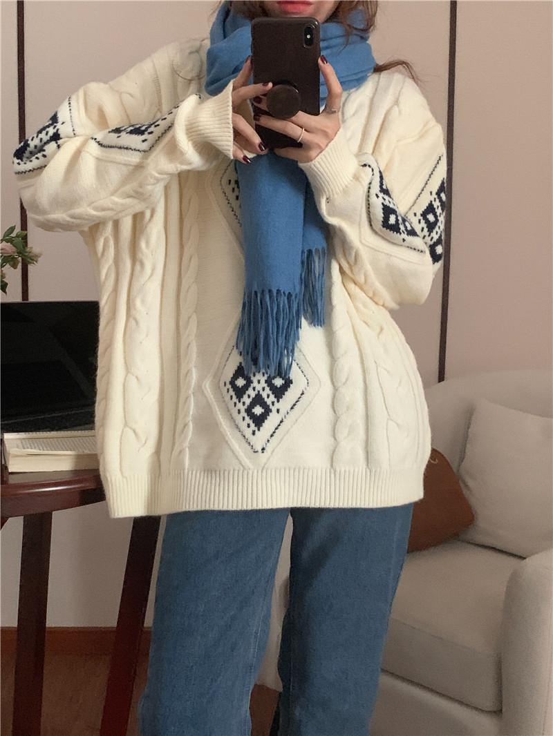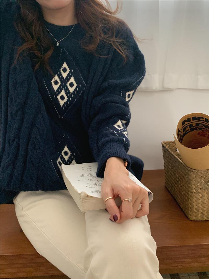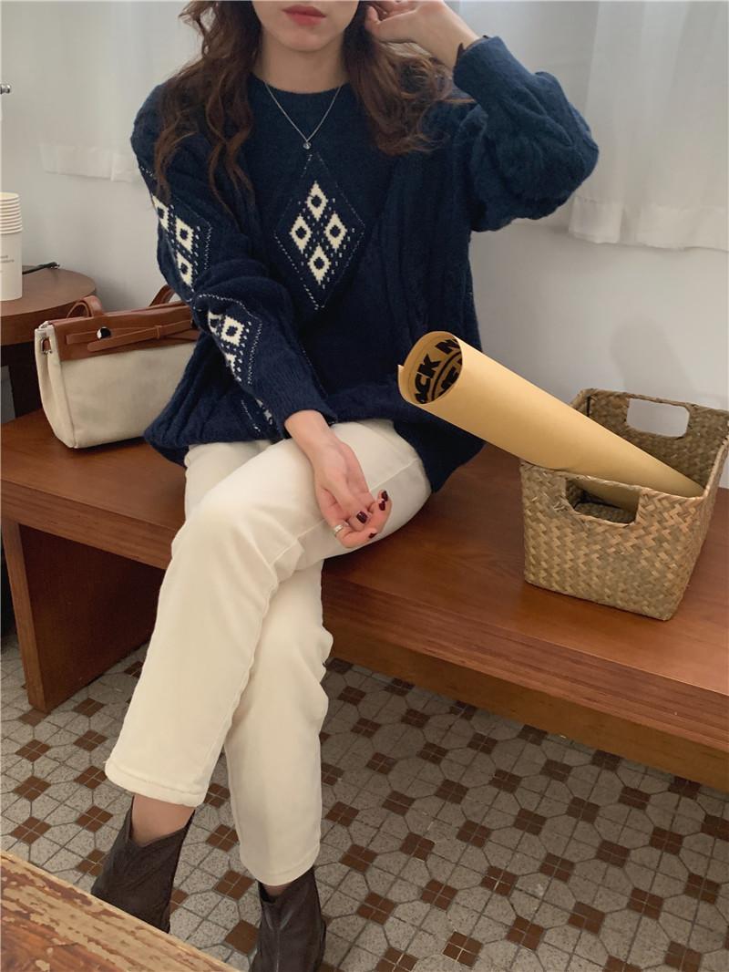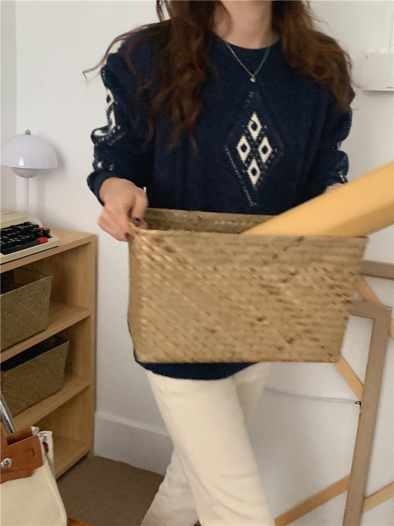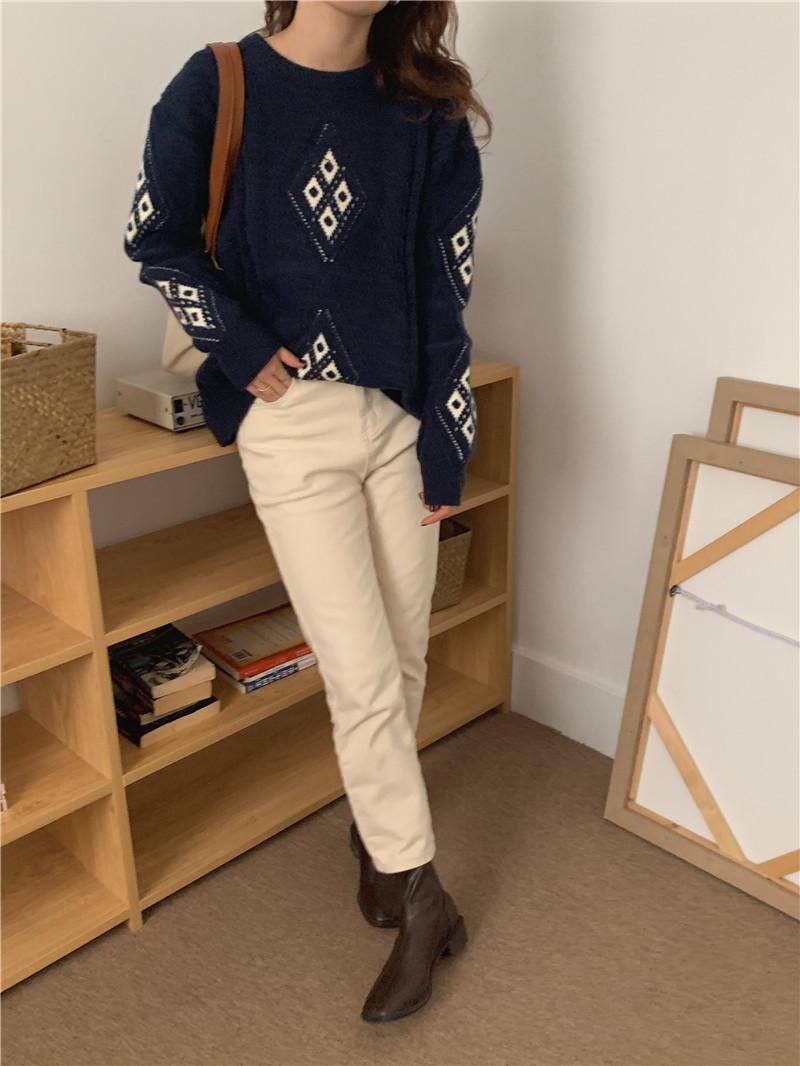 Suéter Pulóver Rómbico Estilo Coreano para Mujer Otoño e Invierno Suave Ceroso Holgado Adelgazante Cuello Redondo Base Exterior Top de Punto