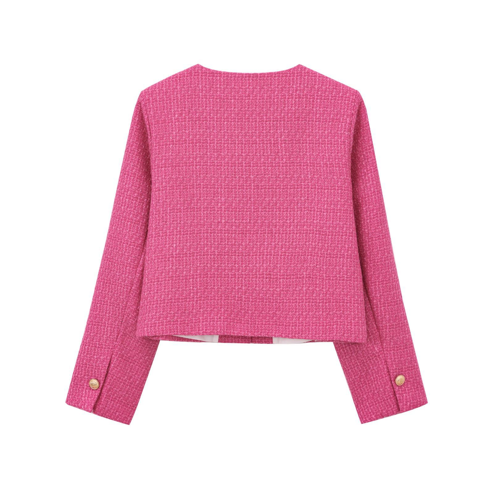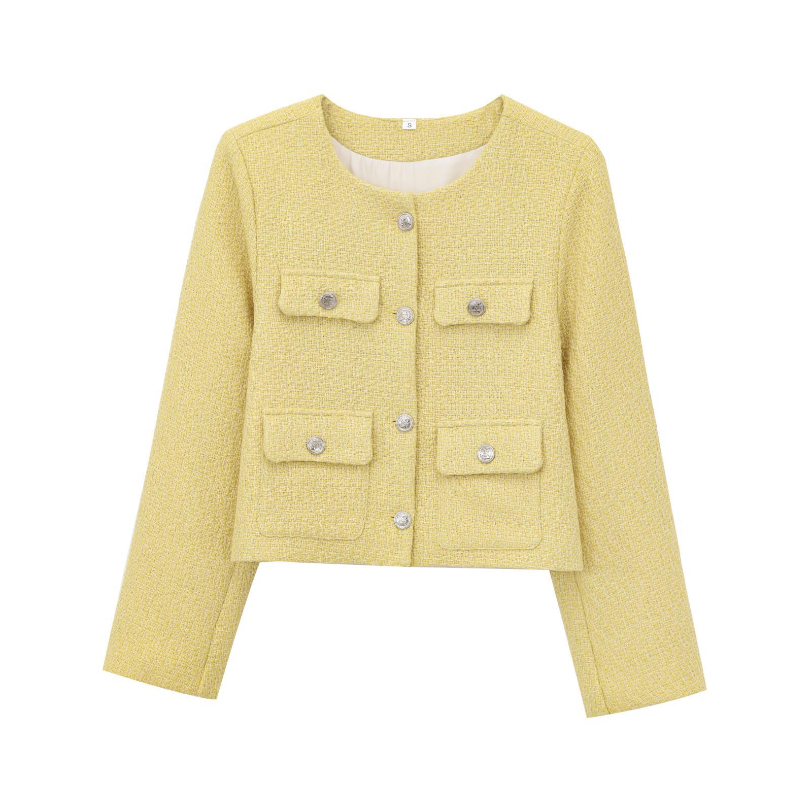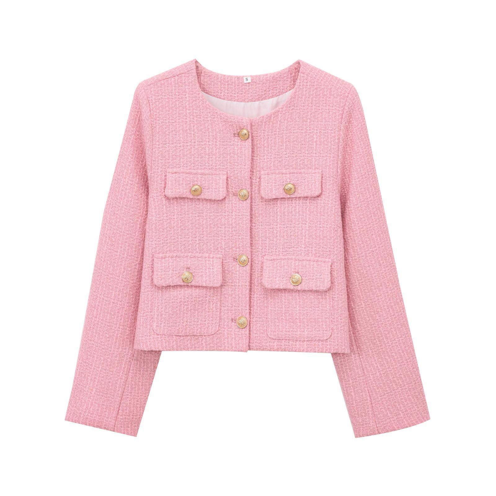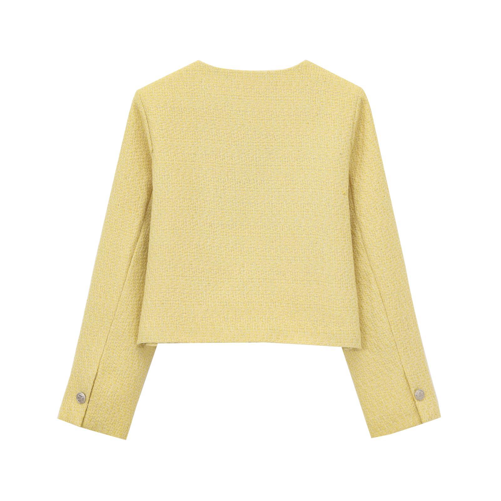 2025 Estilo Europeo y Americano Verano para Mujer Chaqueta Texturizada con Hombreras Cuello Redondo Manga Larga Pequeña Fragancia 2399 Rosa Amarillo Azul Blanco y Negro Verde