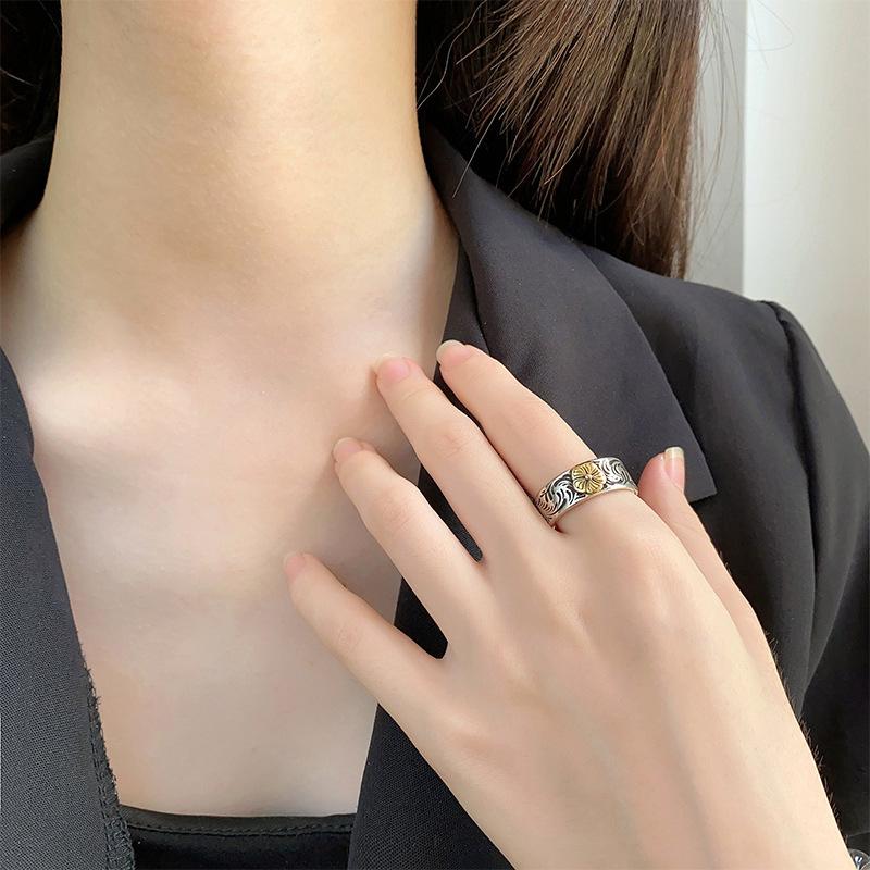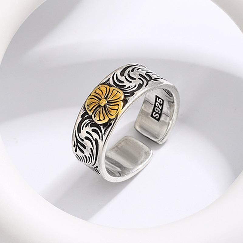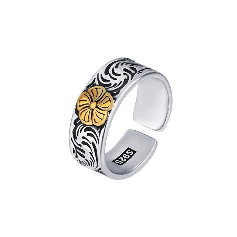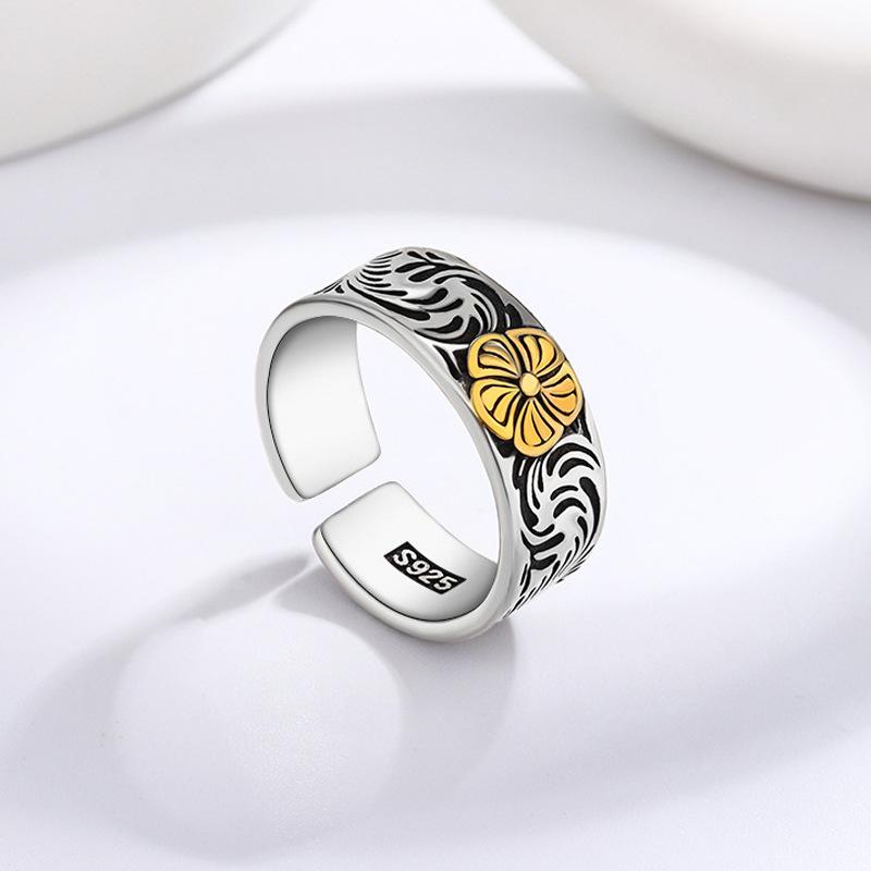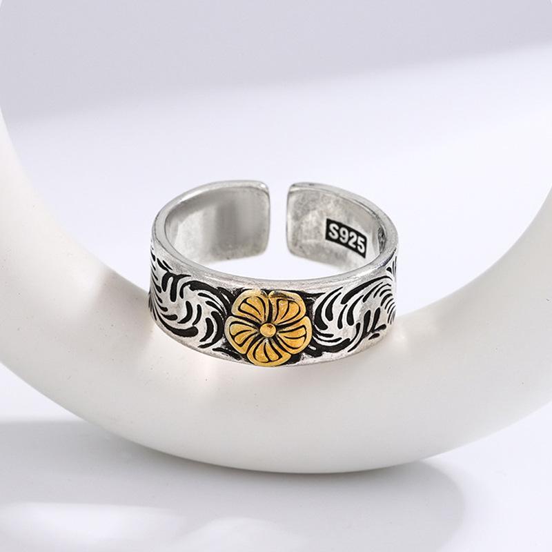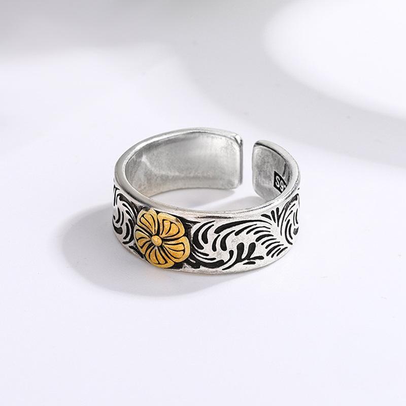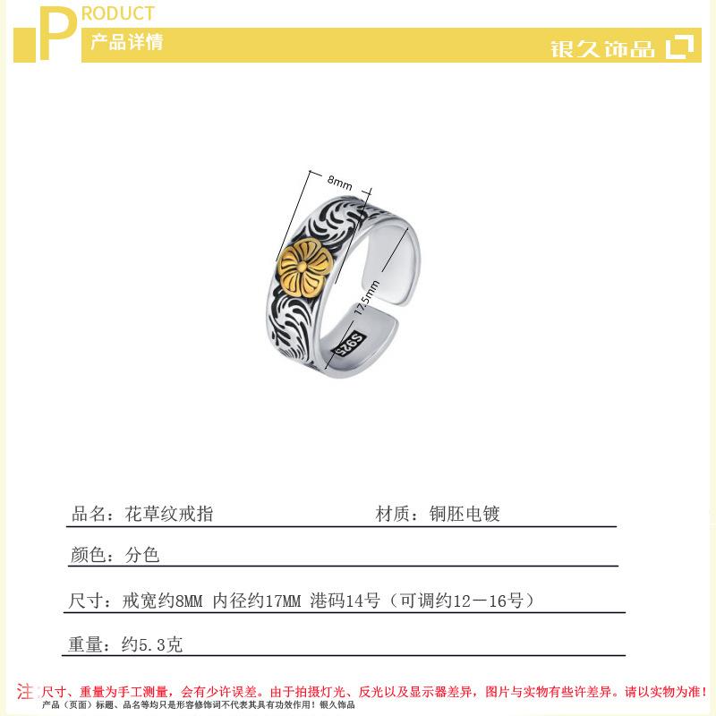 Anillo con patrón de flores y hierba estilo japonés y coreano, celebridad de internet ins estilo frío, moderno, retro, desgastado, patrón de color de contraste, anillo índice al por mayor