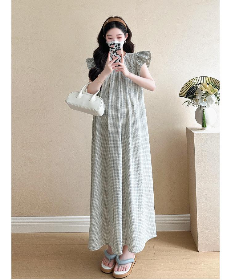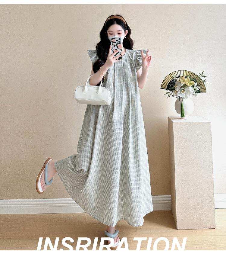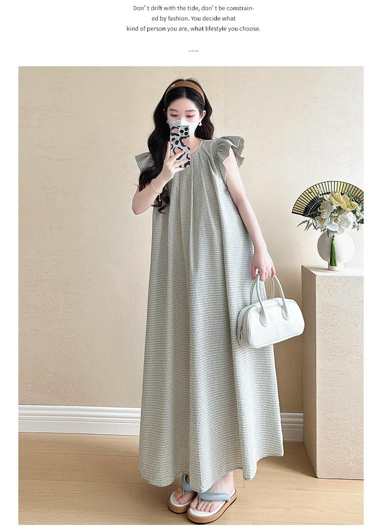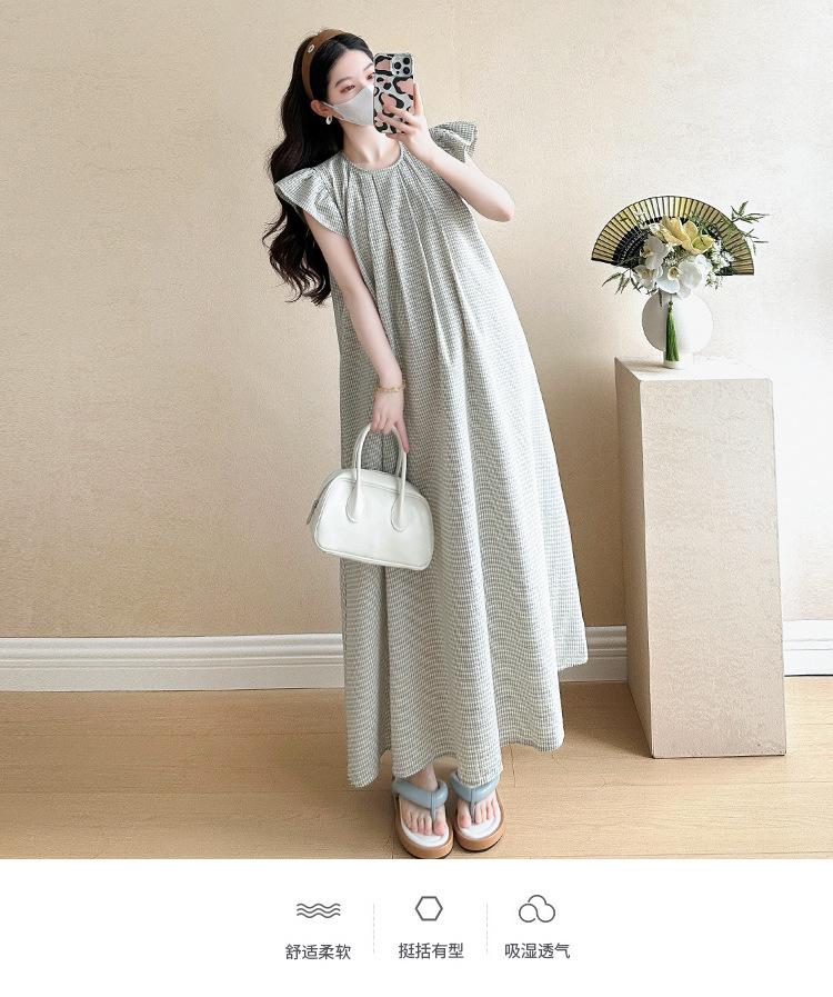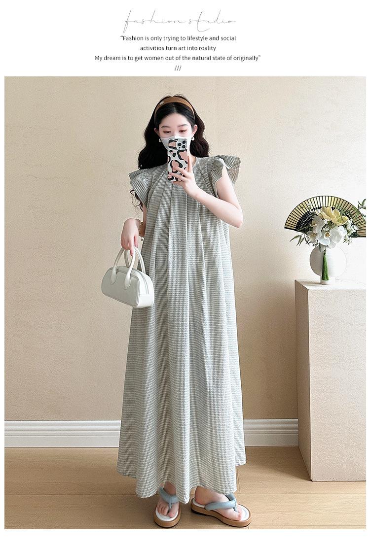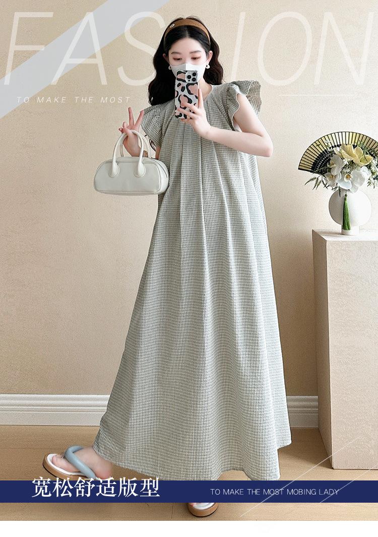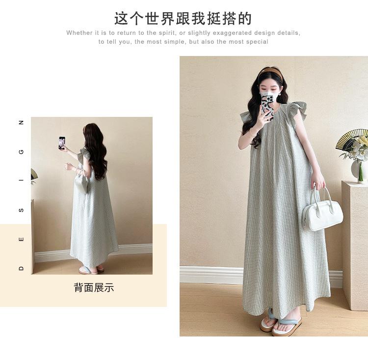Ropa de Maternidad 2025 Verano Nuevo Estilo Coreano Moda Cuadros Mangas Vuelo Suelto Talla Grande Vestido de Maternidad