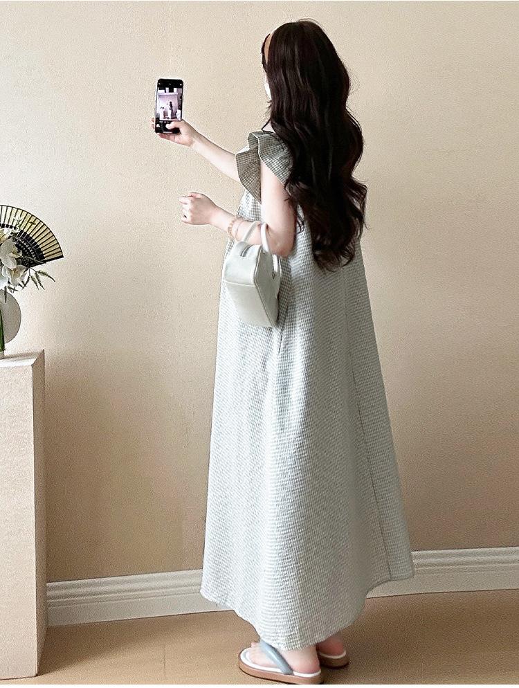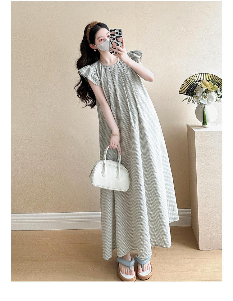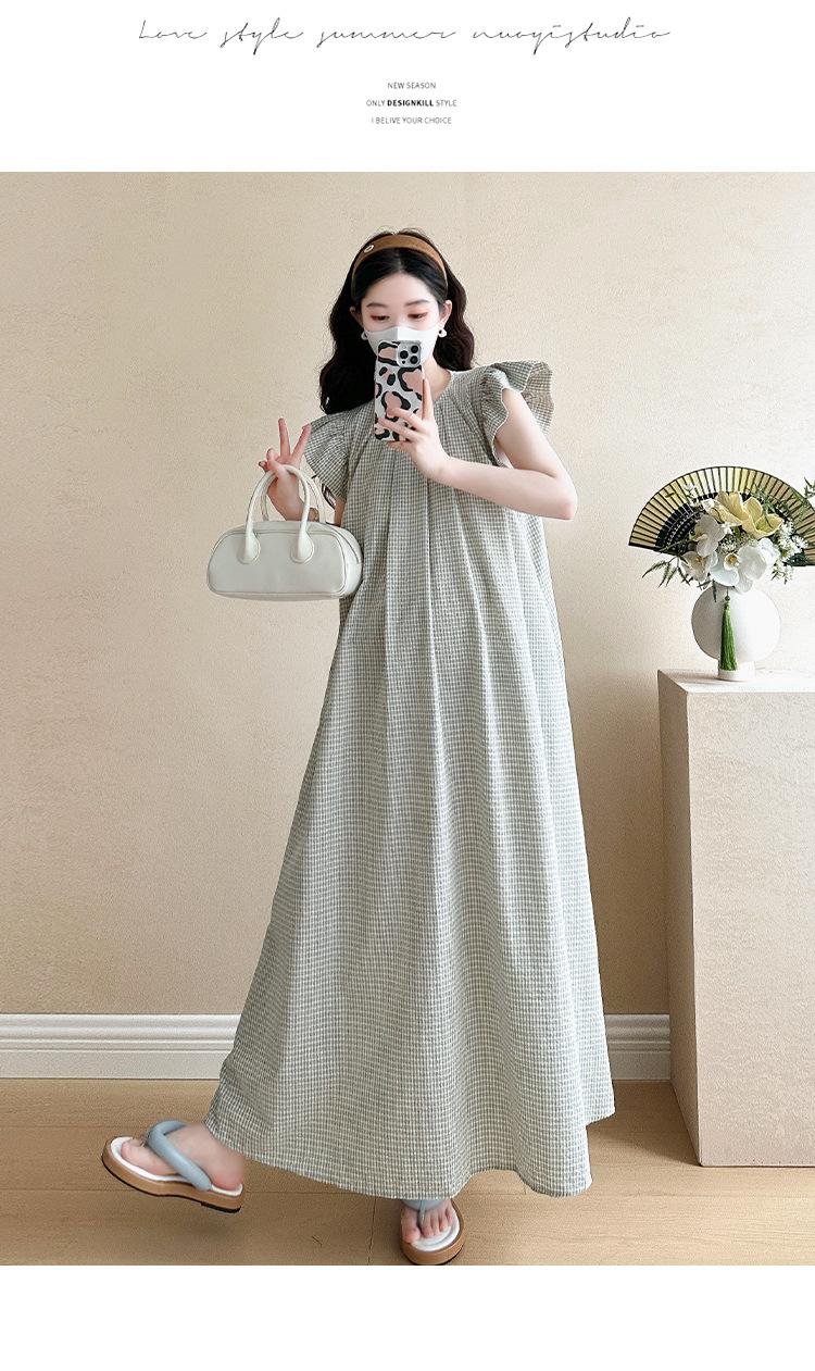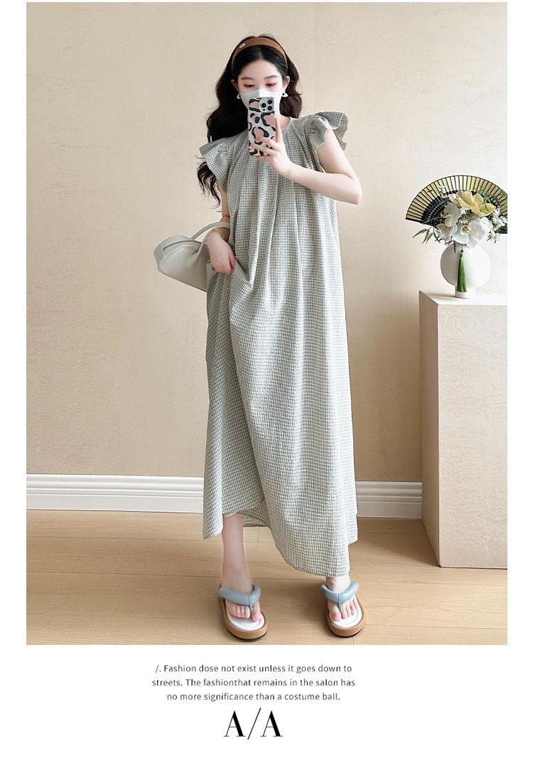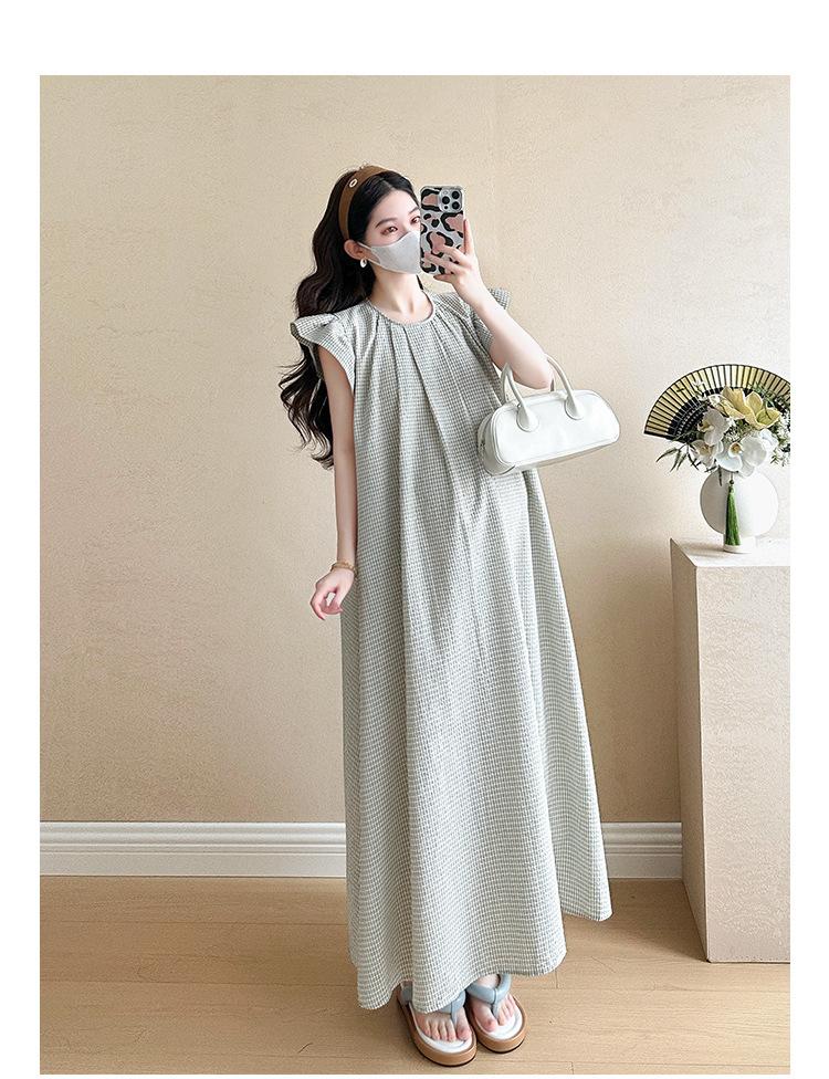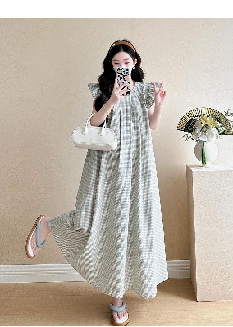 Ropa de Maternidad 2025 Verano Nuevo Estilo Coreano Moda Cuadros Mangas Vuelo Suelto Talla Grande Vestido de Maternidad