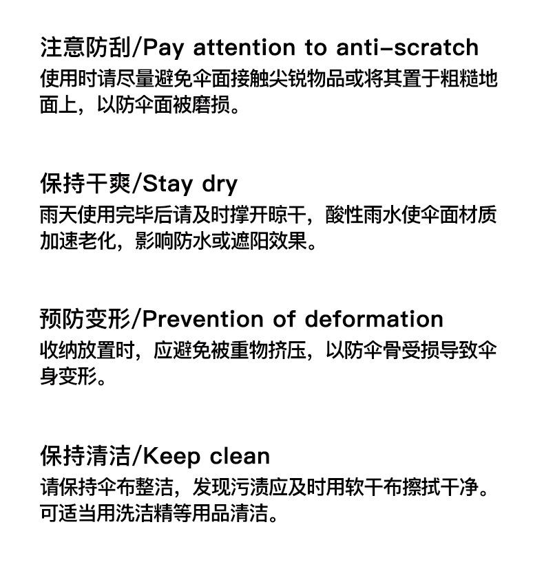 Los paraguas son artículos frágiles y presentan características especiales durante el envío. En ocasiones, pueden sufrir daños internos debido a una carga y descarga bruscas o a problemas de embalaje durante el envío exprés. Por lo tanto, se ruega a los compradores que inspeccionen la mercancía en persona al firmar la recepción. Si observan algún daño, presenten una reclamación de inmediato a la empresa de mensajería o contacten con el personal de atención al cliente para tomar fotos u obtener un certificado del repartidor. Si no se detectan daños tras firmar la recepción, la responsabilidad recaerá sobre la persona que firmó la recepción. Por favor, sean amables y proactivos. Cooperen para evitar molestias mutuas.