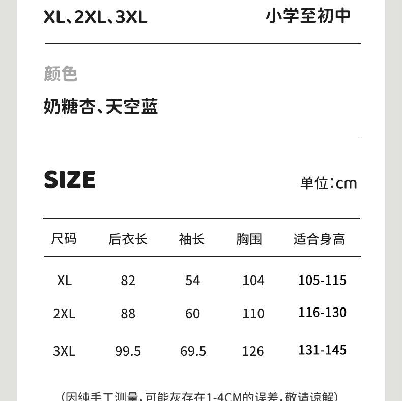Xl (recommended weight 105-115), 2xl (recommended weight 116-130), 3xl (recommended weight 131-145)