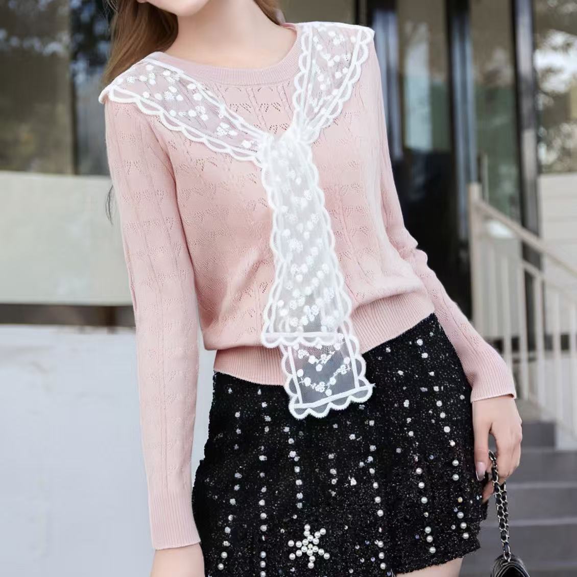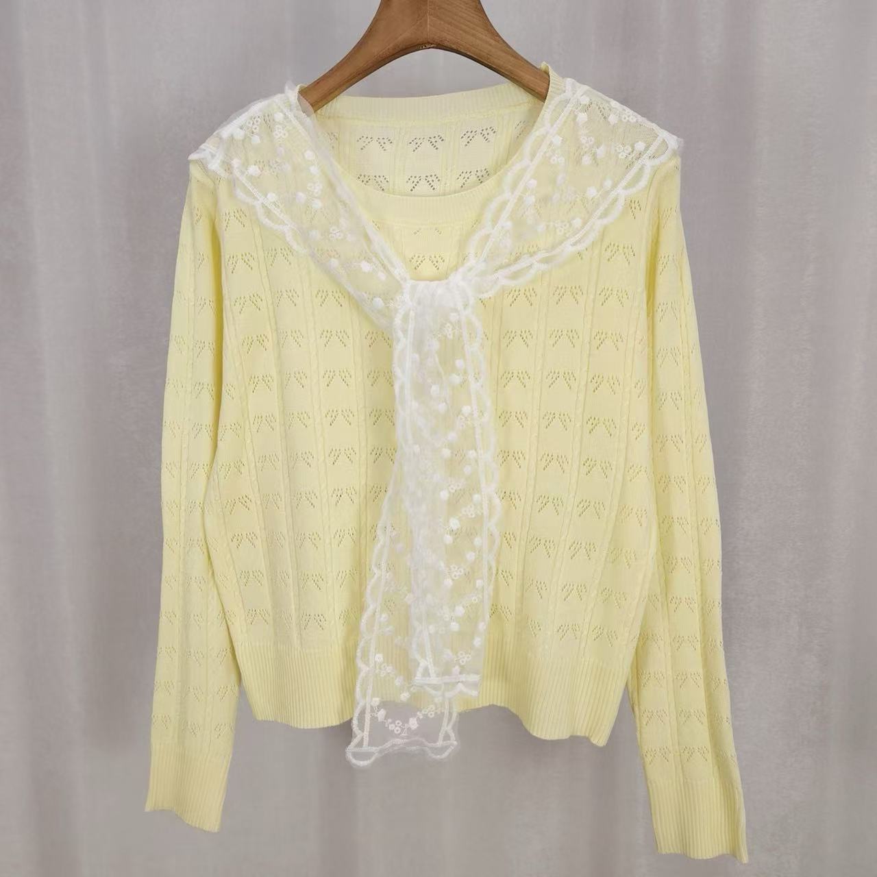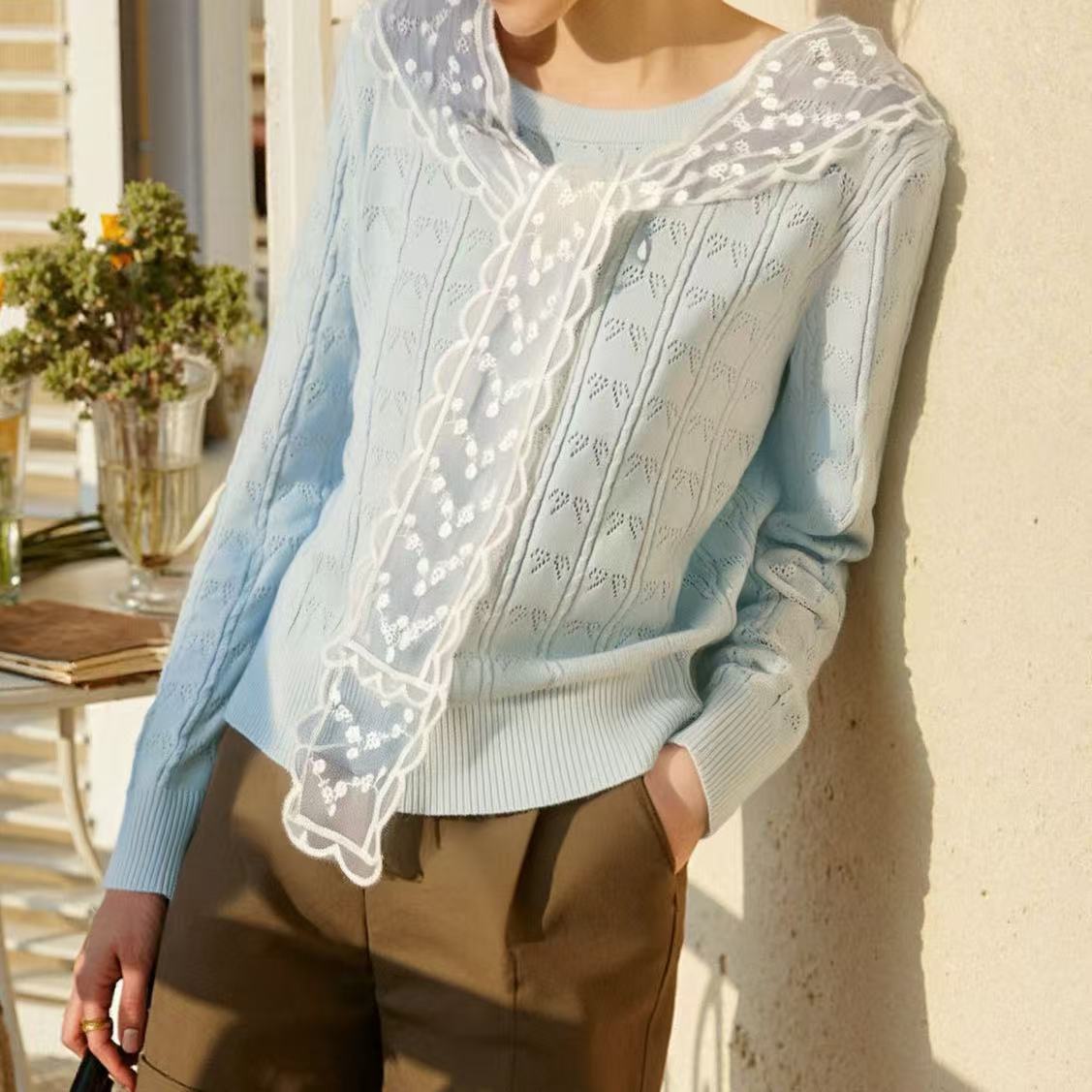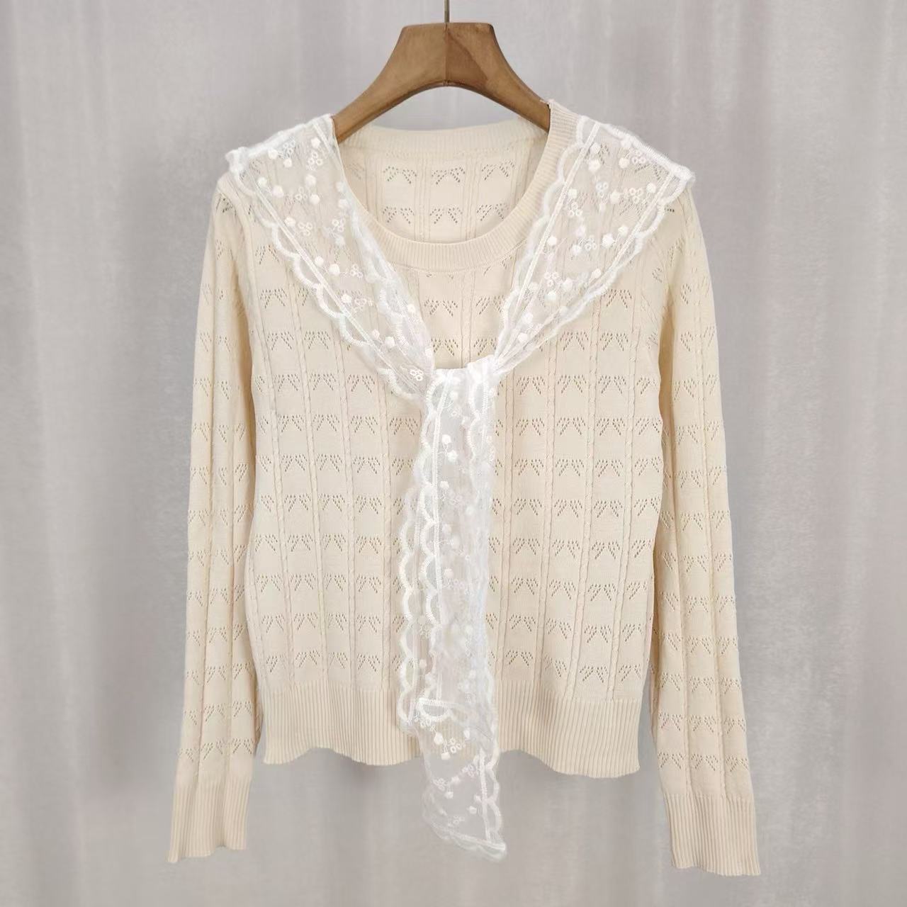 Chal dulce de encaje estilo coreano tejido de cuello redondo prenda exterior camiseta verano sentido del diseño nicho hueco top de crochet ins