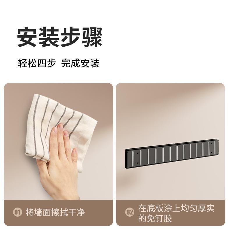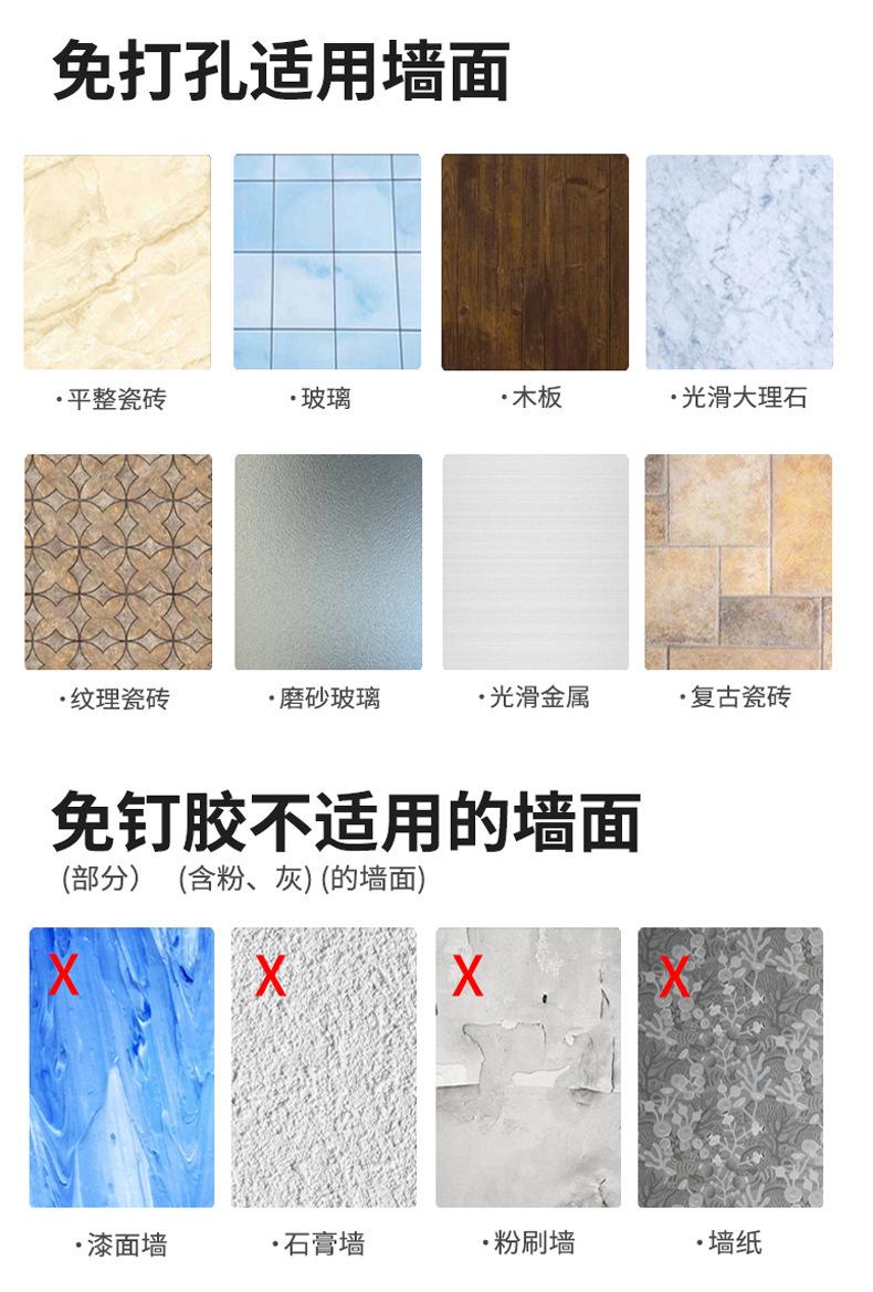 (2) Tenga en cuenta que antes de la instalación, mire el video y la superficie de la pared debe ser plana y sólida, como baldosas de vidrio.No disponible enEn paredes irregulares e inestables como paredes pintadas, papel tapiz, paredes de cal, etc. Después de aplicar el pegamento en la pared, debe esperar de 3 a 5 días para que el pegamento sin clavos se seque completamente antes de usarlo.