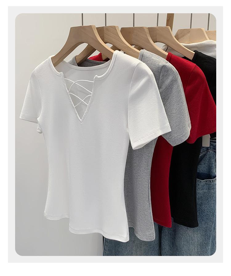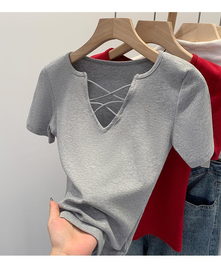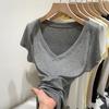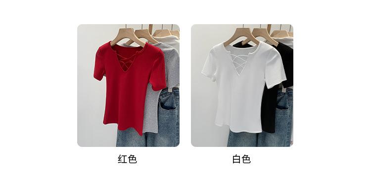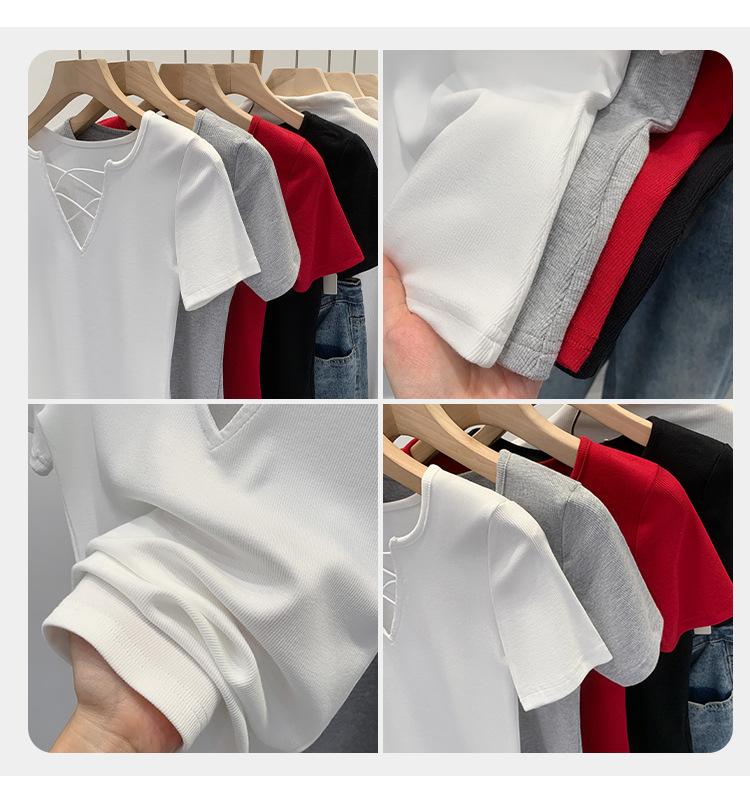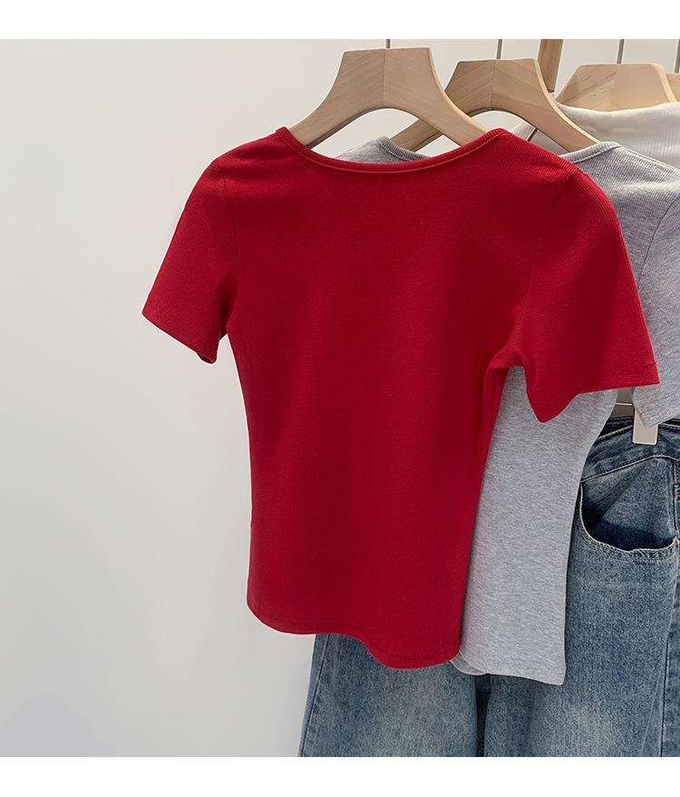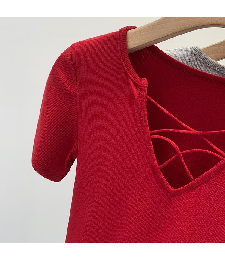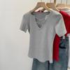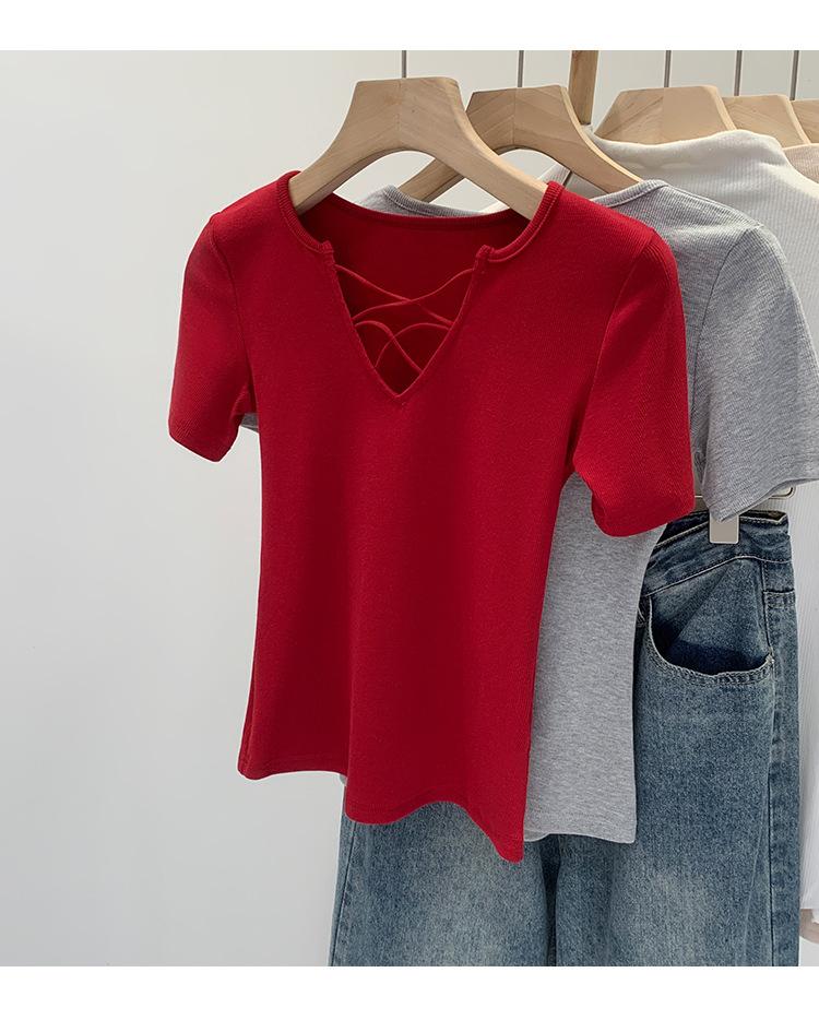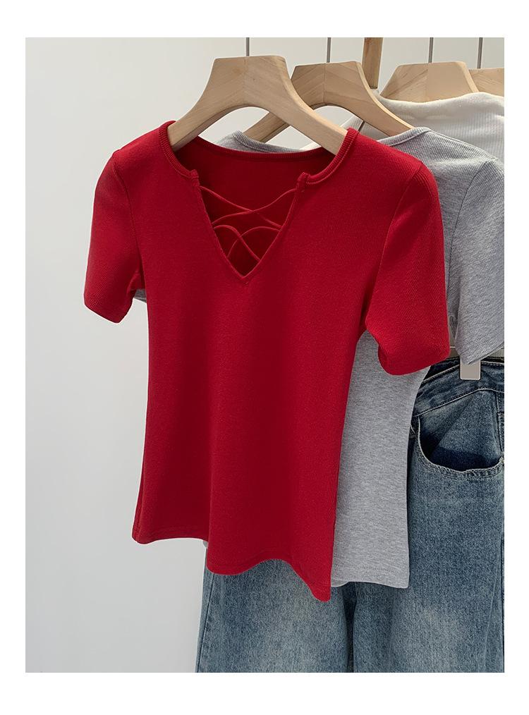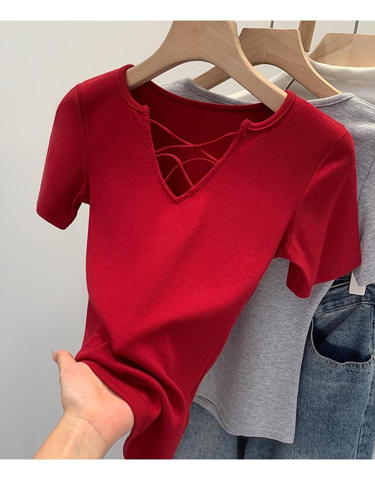 Playera Roja Caliente de Cuello en V con Manga Corta al Hombro Derecho para Mujer Verano 2025 Nuevo Diseño Nicho Estilo Coreano Top Interior