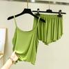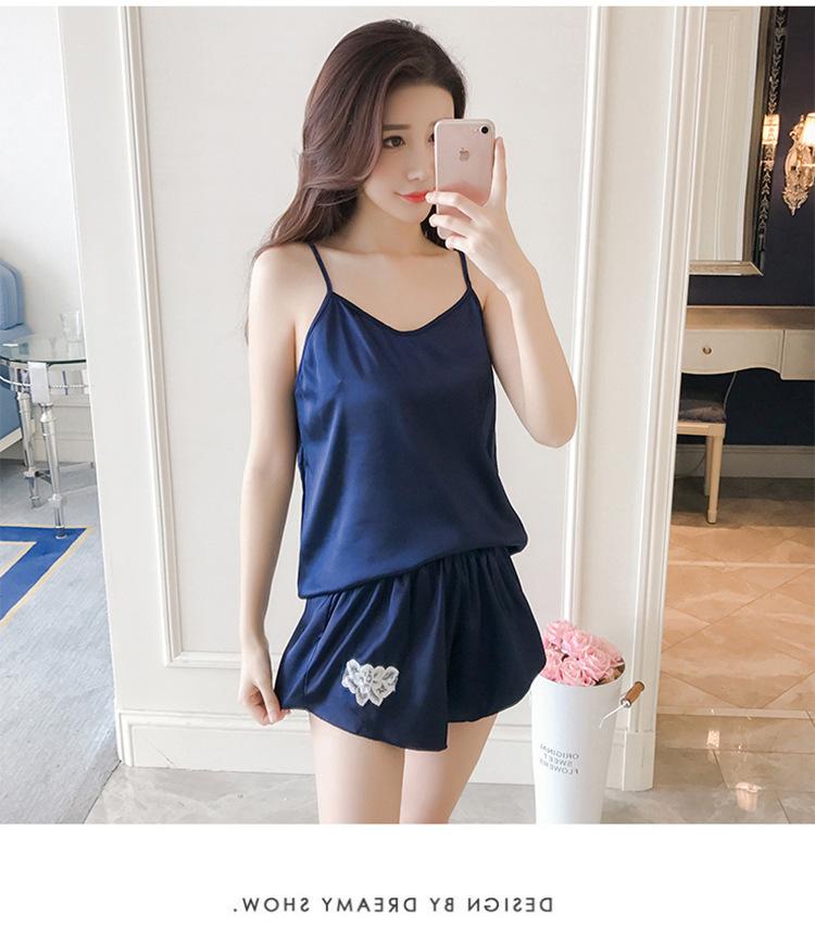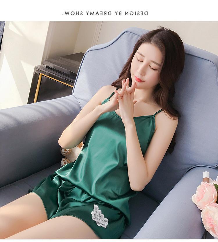 Pijama de Verano para Mujer Sexy Bordado de Tirantes Shorts Conjunto de Dos Piezas Tipo Seda Talla Grande Delgado Estilo Coreano Ropa para el Hogar para Primavera y Otoño