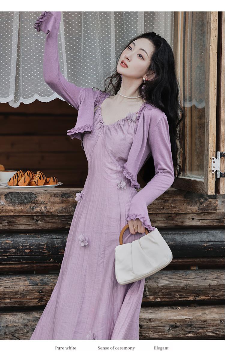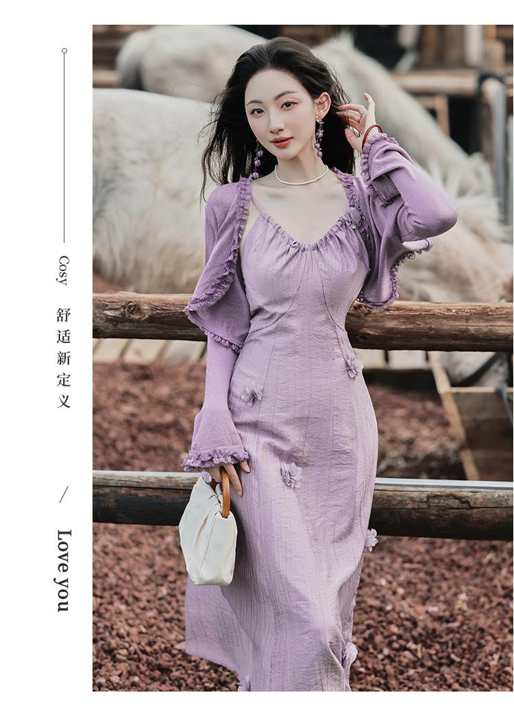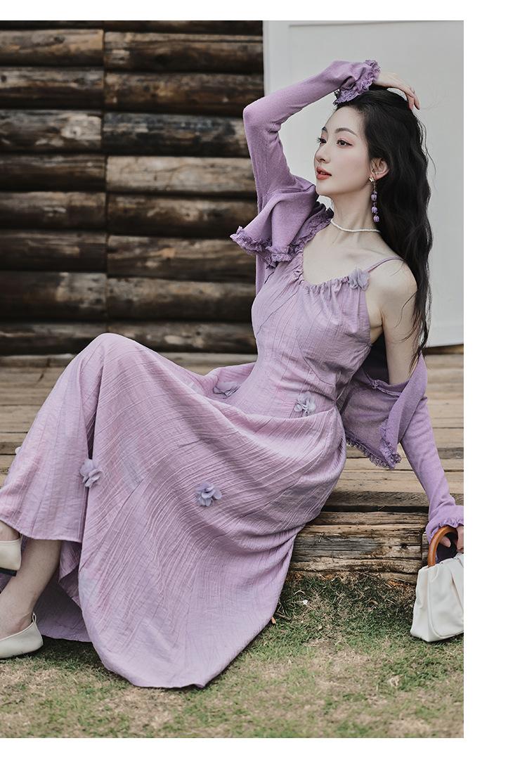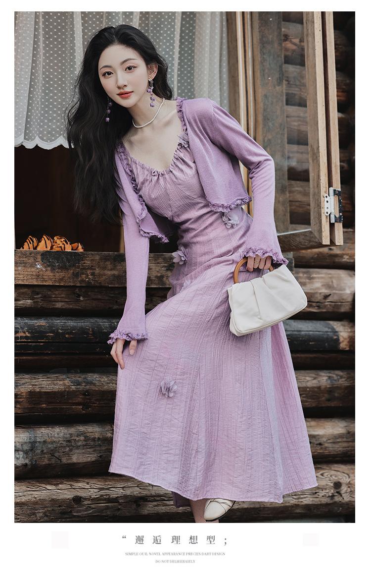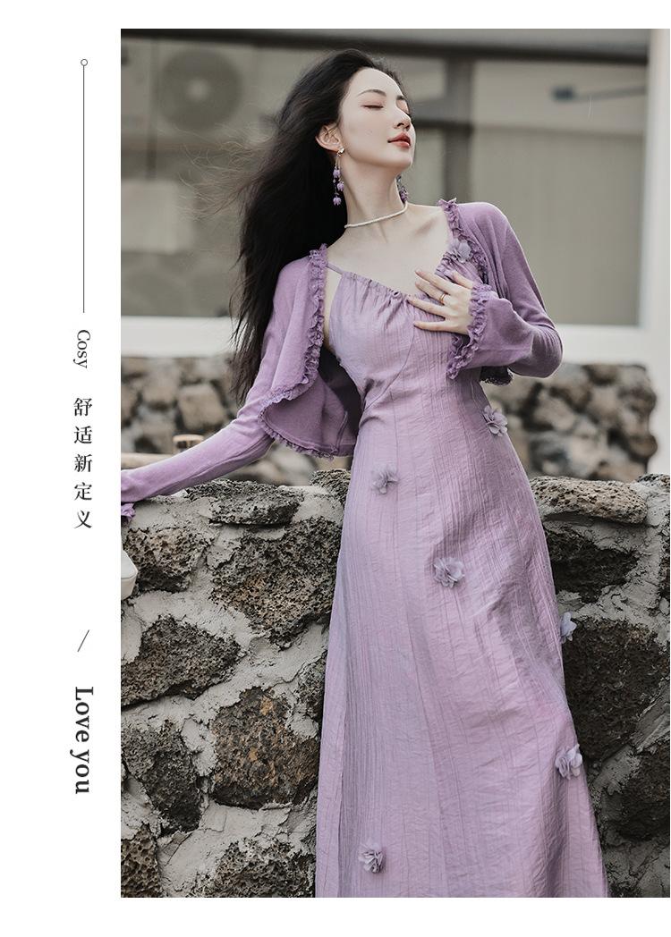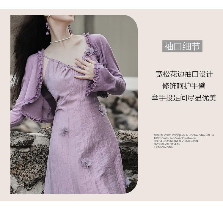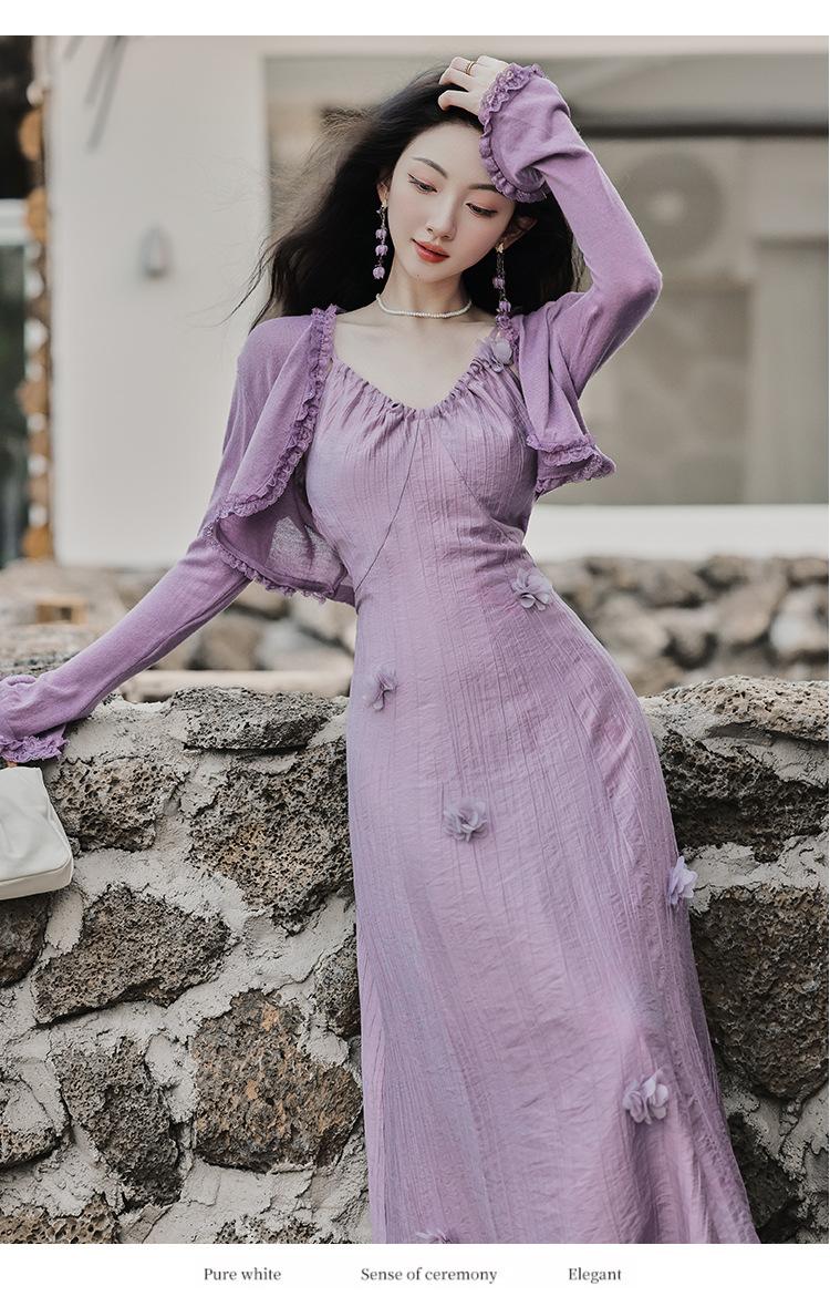 Purple three-dimensional flower suspender skirt, Purple cardigan skirt two-piece set