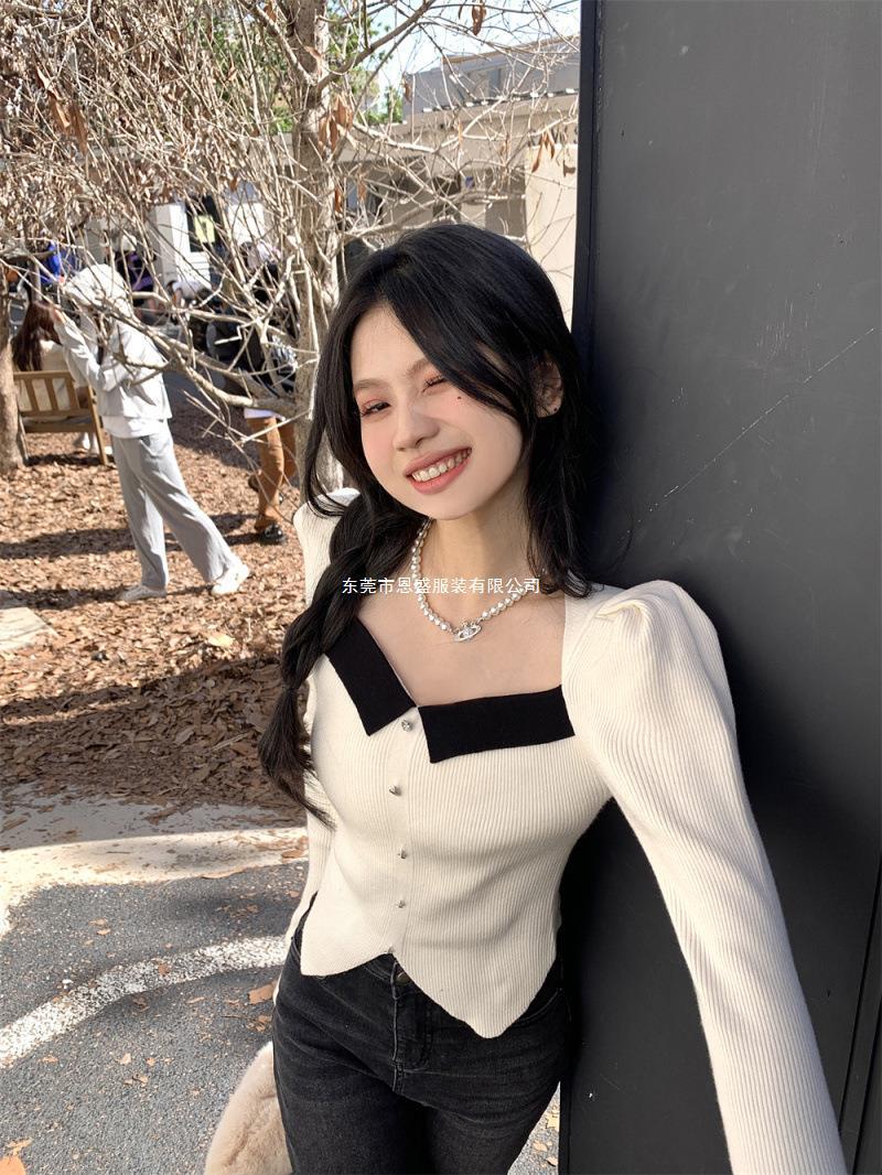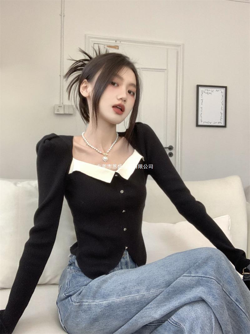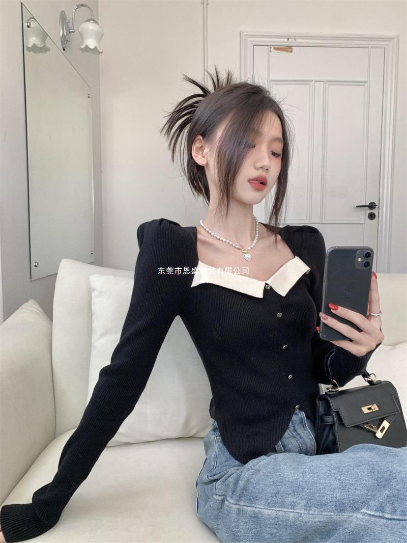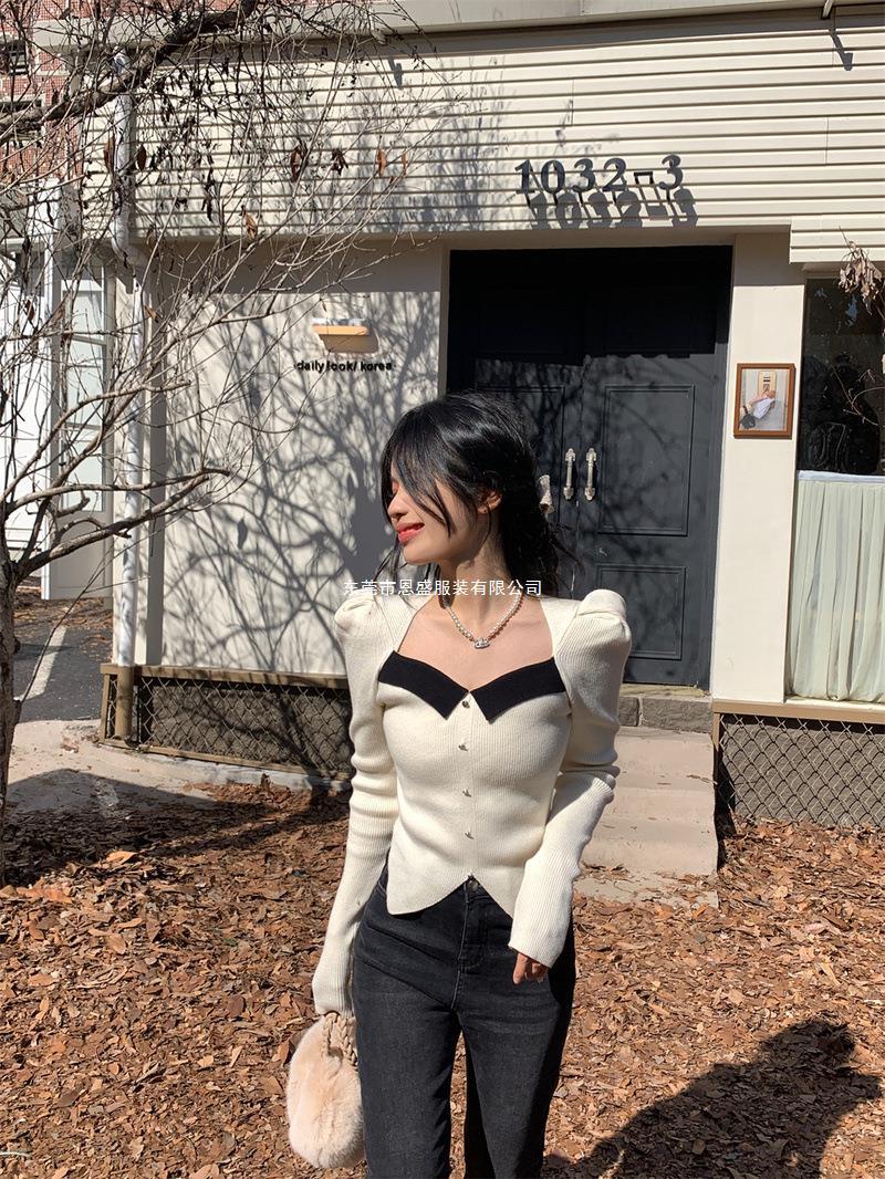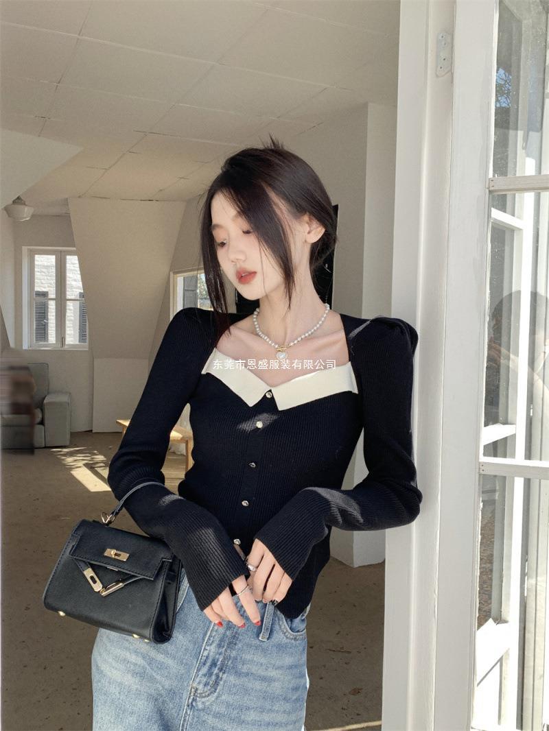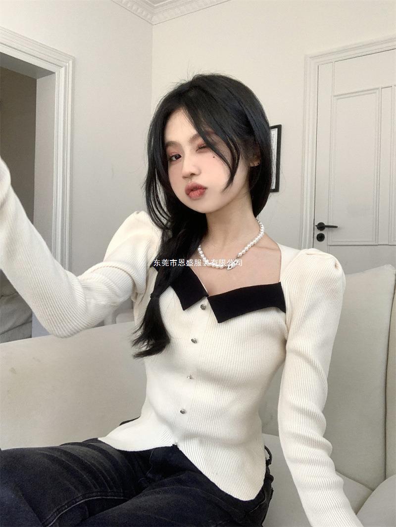 Suéter de Cuello Cuadrado Otoño 2024 Nuevo Diseño Popular de Nicho con Estilo Occidental Falso de Dos Piezas Top de Manga Abullonada para Mujer