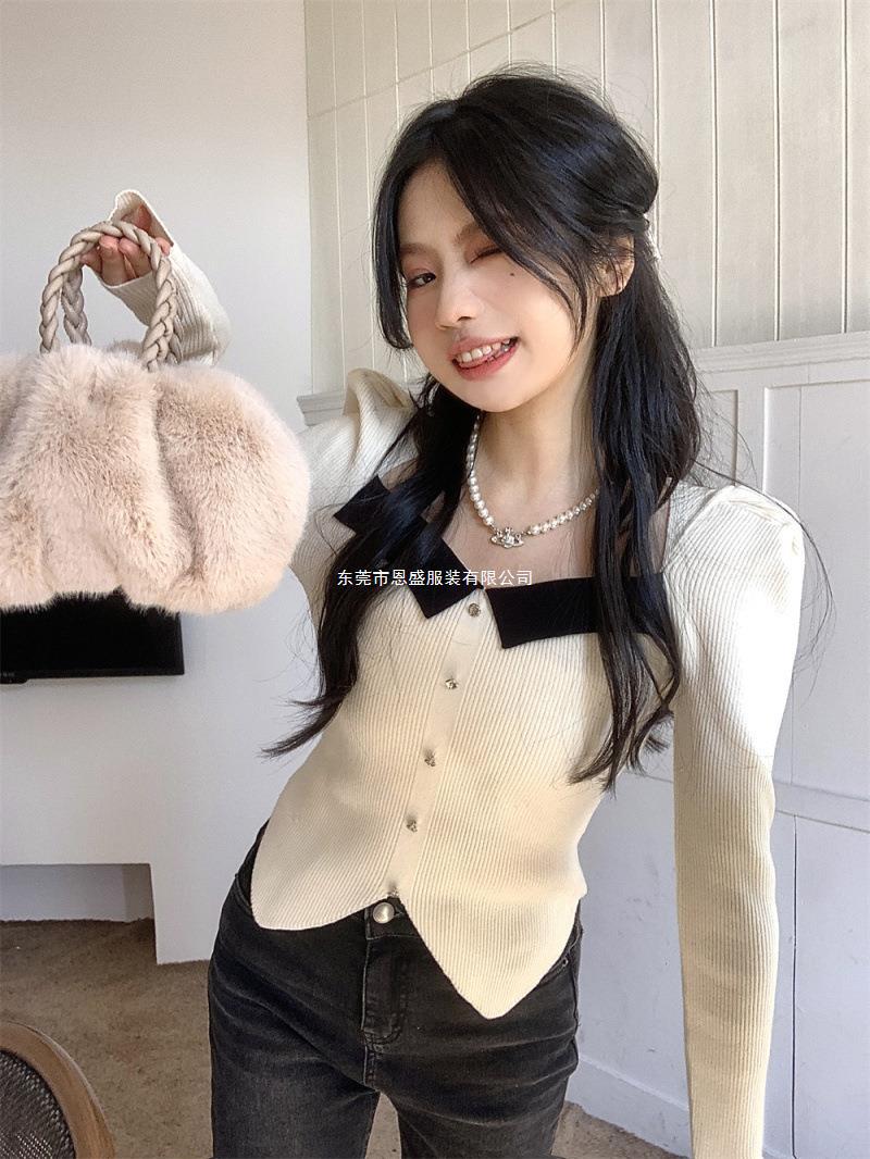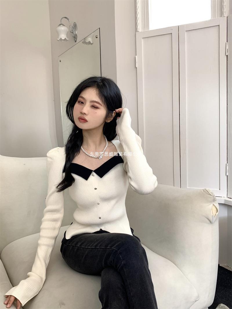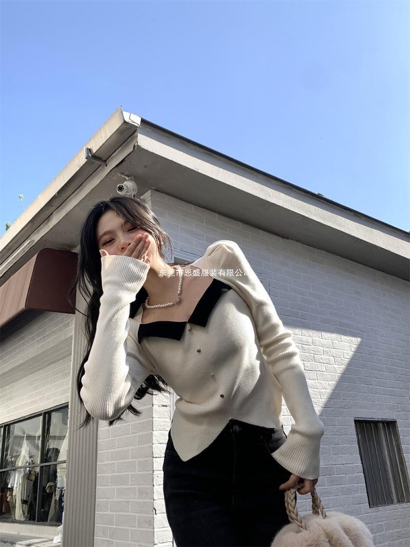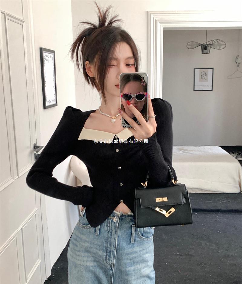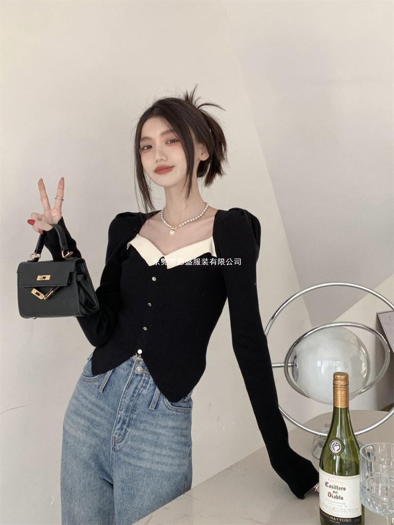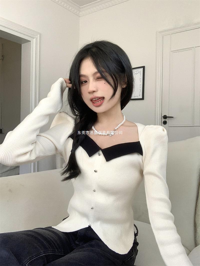 Suéter de Cuello Cuadrado Otoño 2024 Nuevo Diseño Popular de Nicho con Estilo Occidental Falso de Dos Piezas Top de Manga Abullonada para Mujer