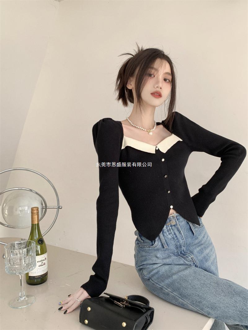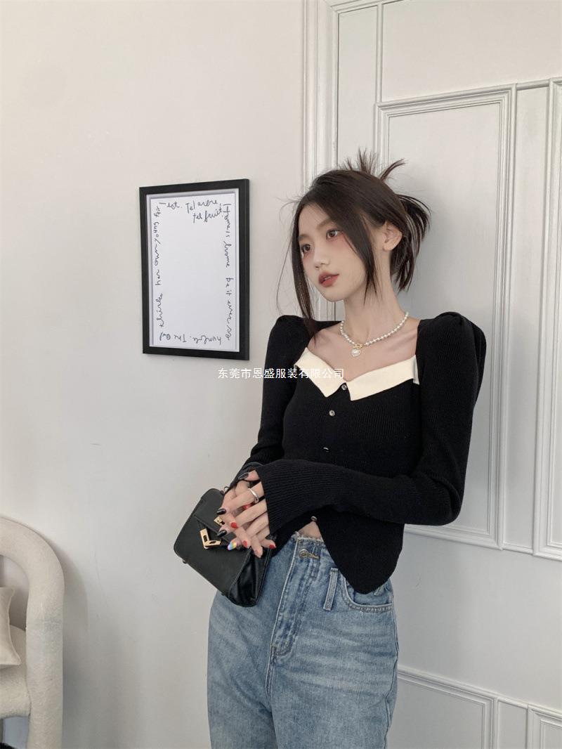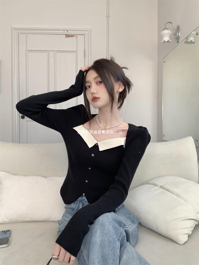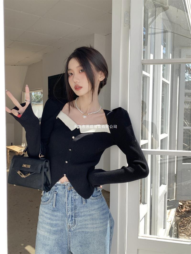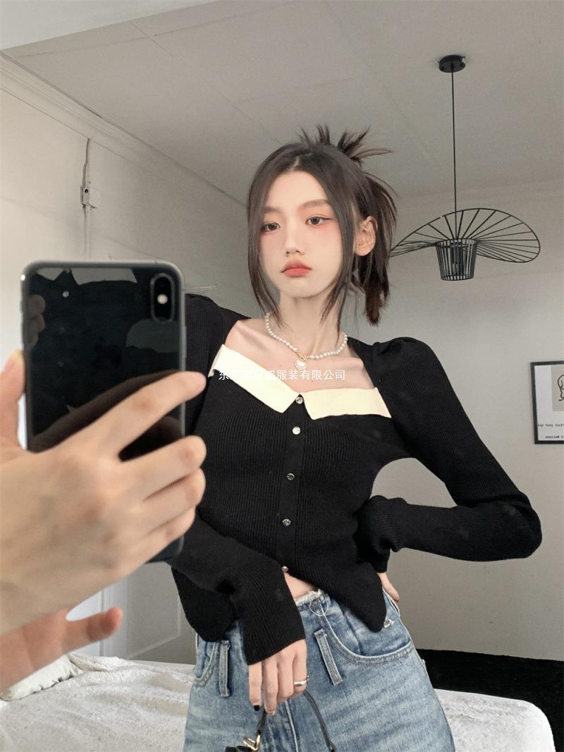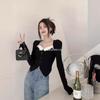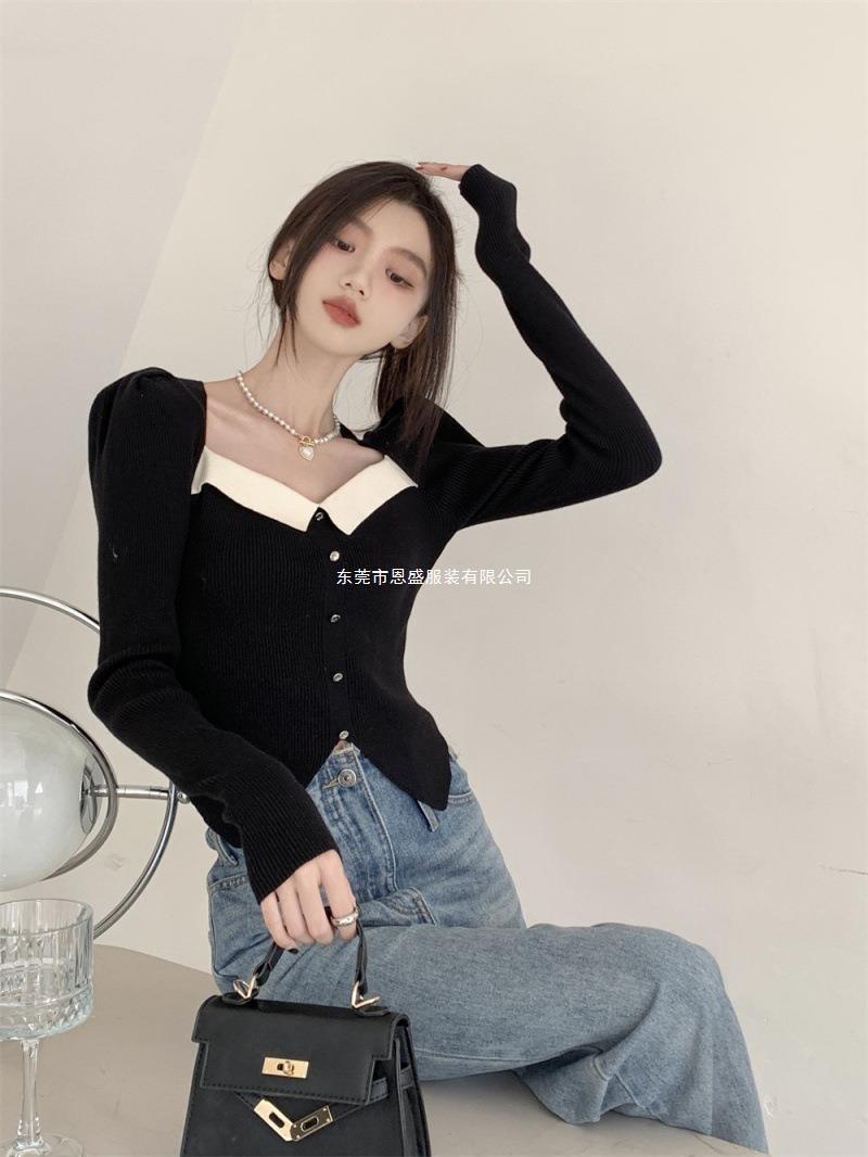 Suéter de Cuello Cuadrado Otoño 2024 Nuevo Diseño Popular de Nicho con Estilo Occidental Falso de Dos Piezas Top de Manga Abullonada para Mujer