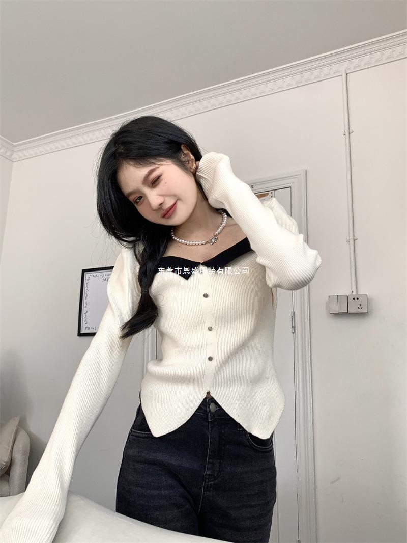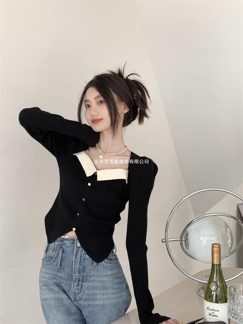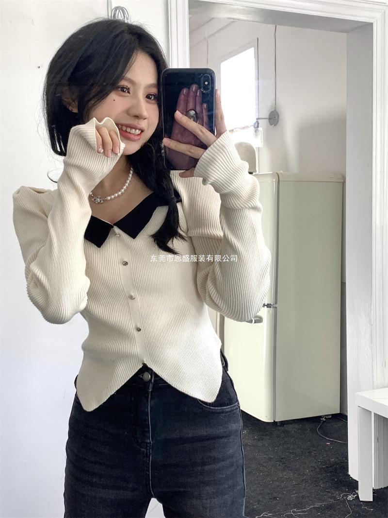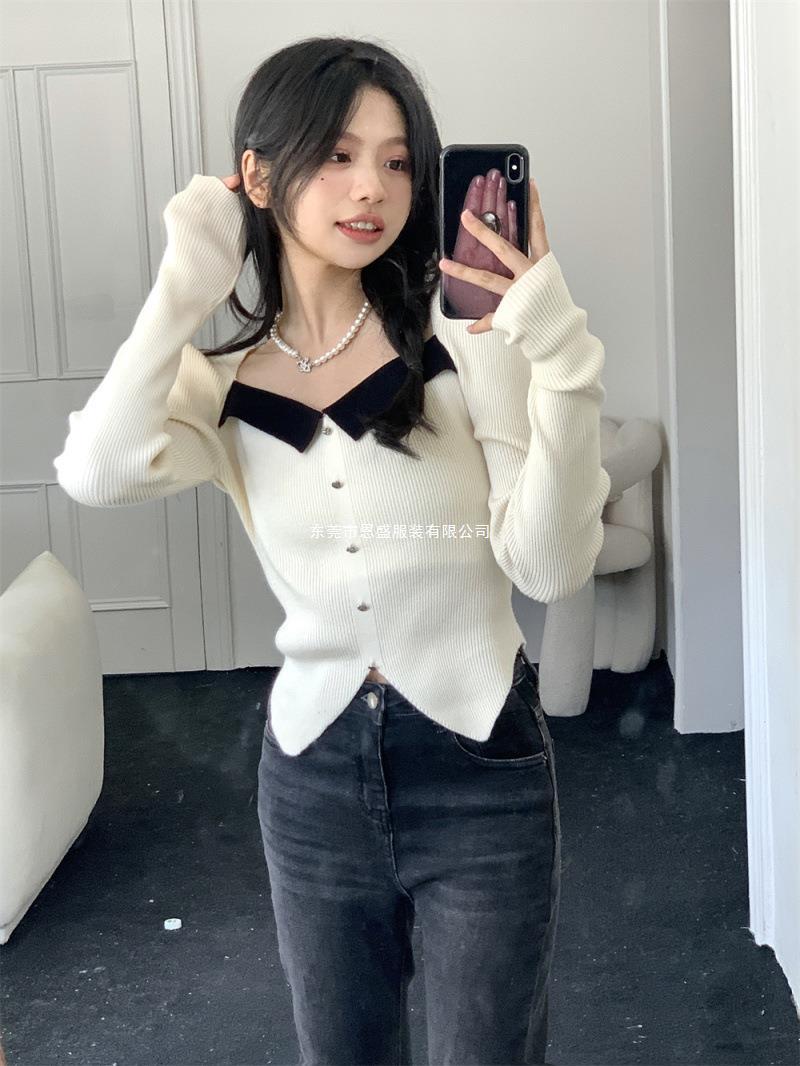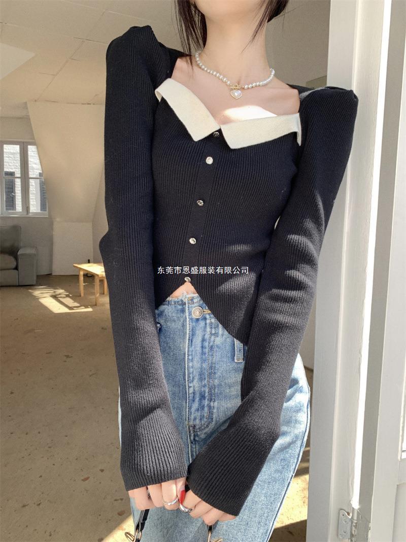 Suéter de Cuello Cuadrado Otoño 2024 Nuevo Diseño Popular de Nicho con Estilo Occidental Falso de Dos Piezas Top de Manga Abullonada para Mujer