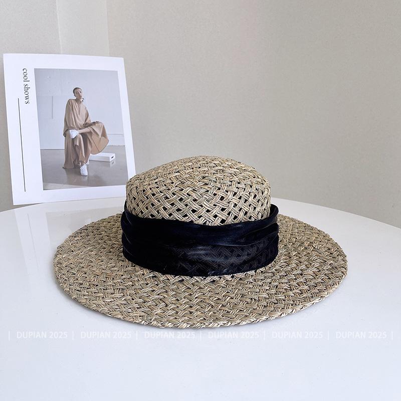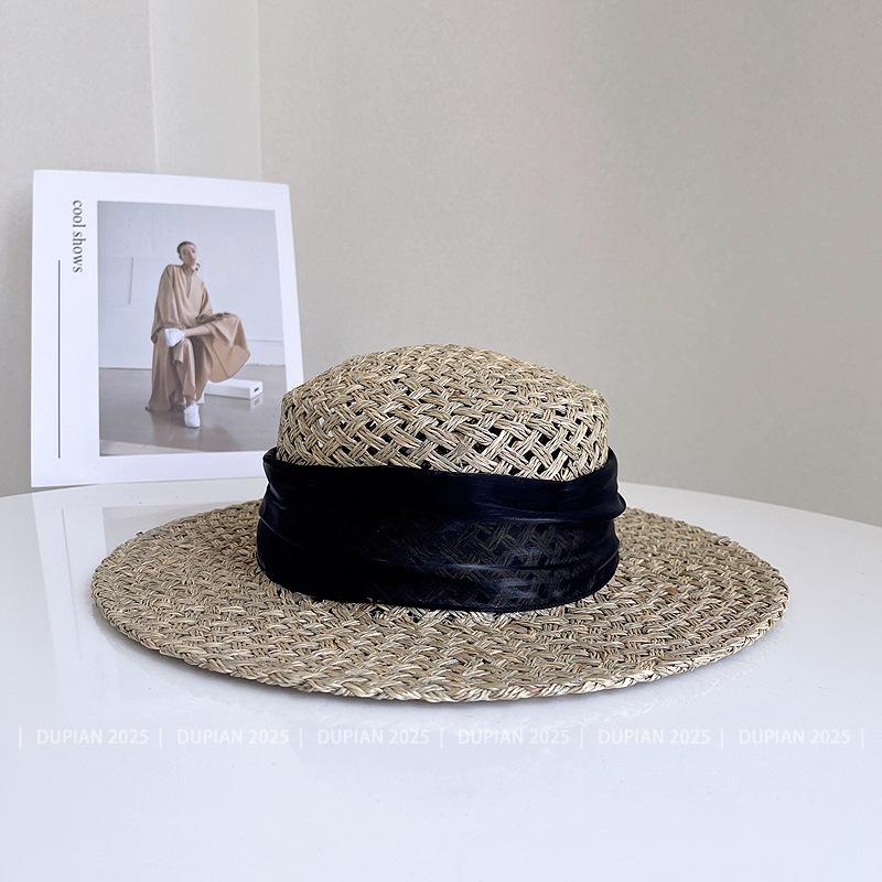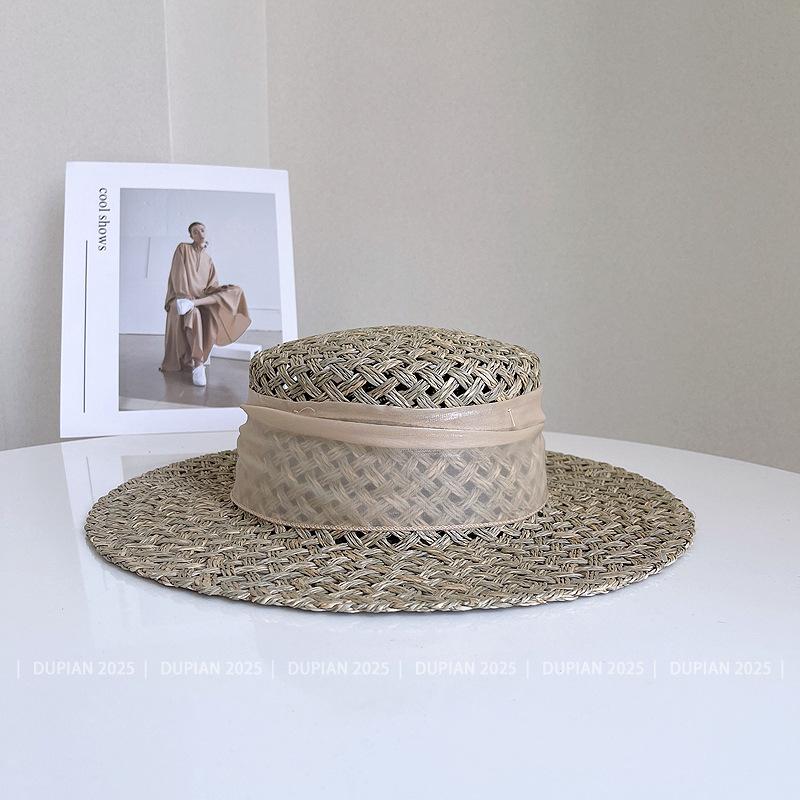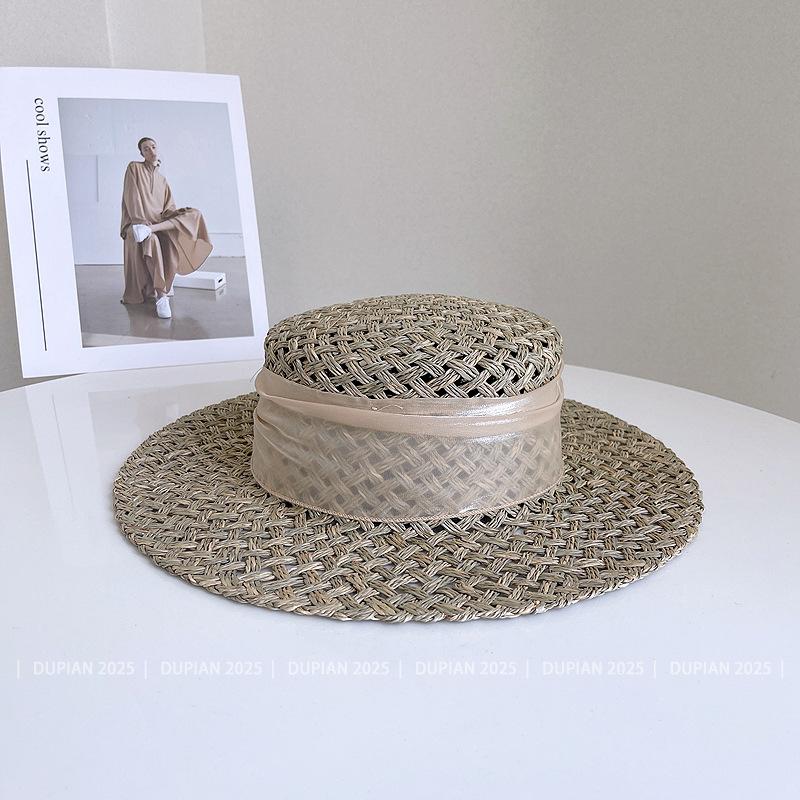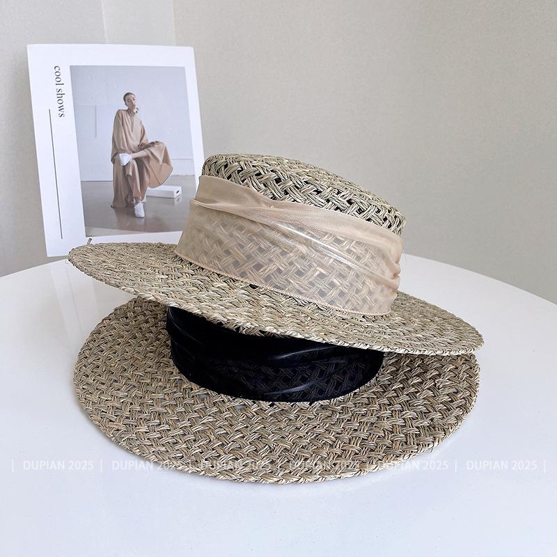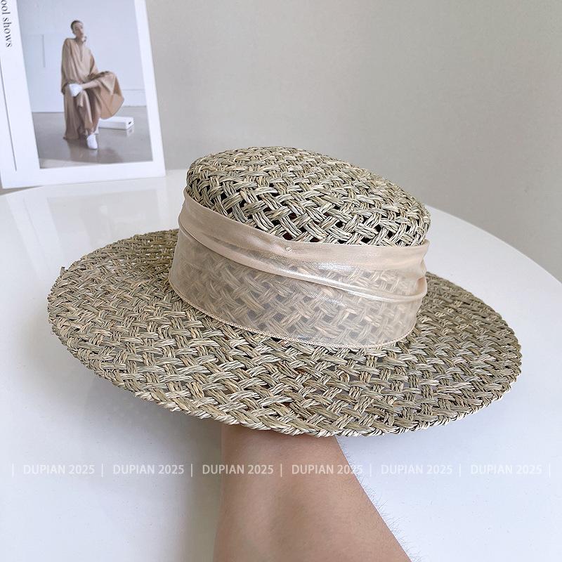 Sombrero de Paja de Satén Mercerizado de Copa Plana para Mujer, Versátil Sombrero de Paja Casual de Verano con Protección Solar para Vacaciones en la Playa, Tendencia Sombrero de Playa