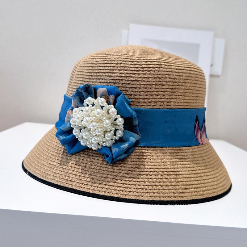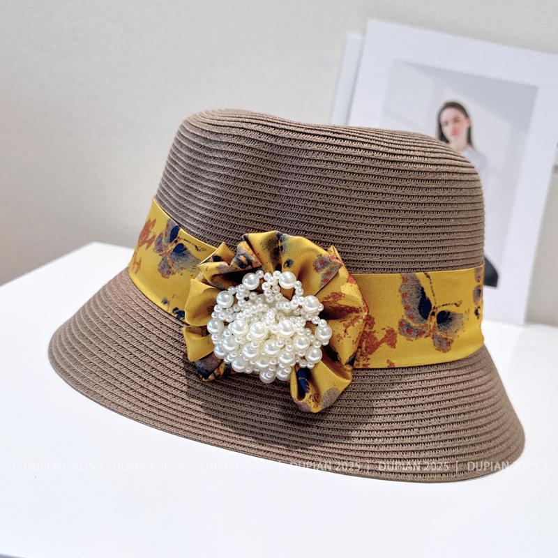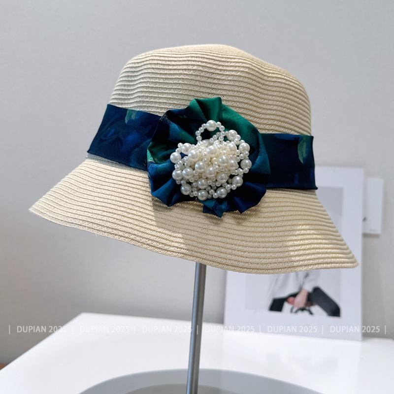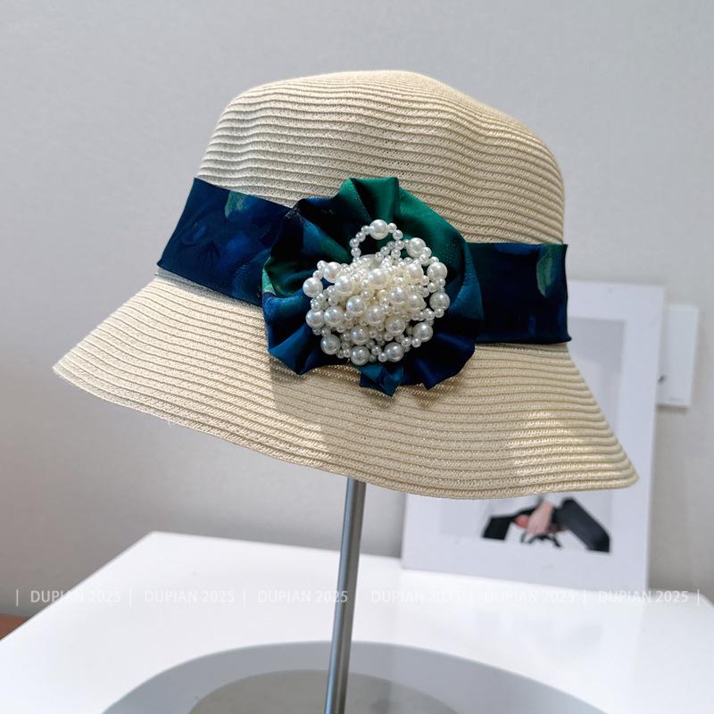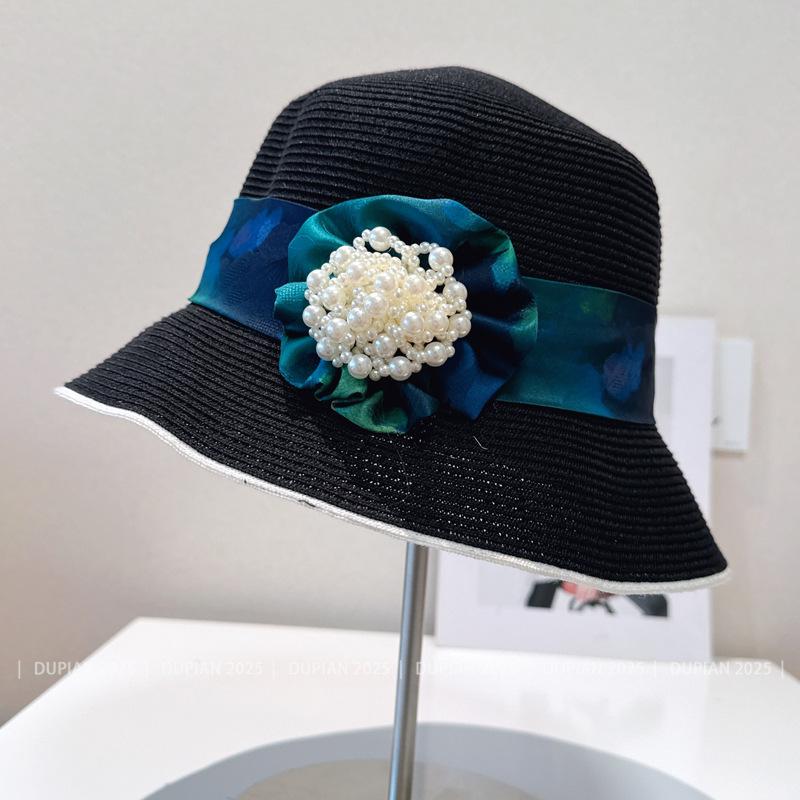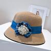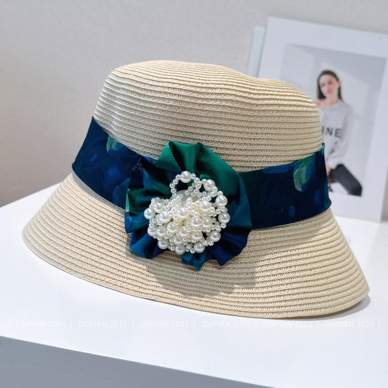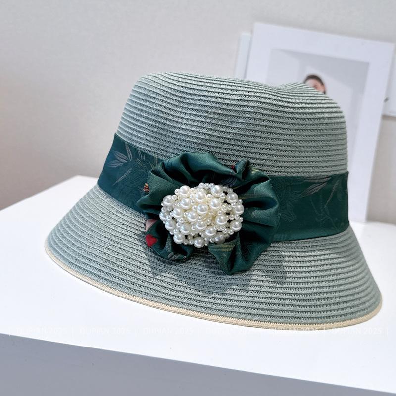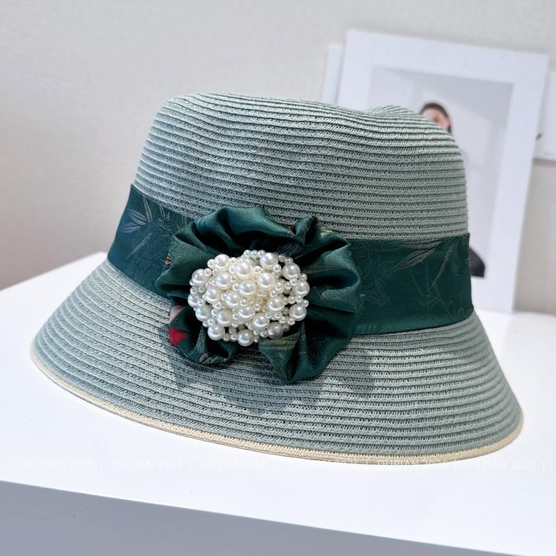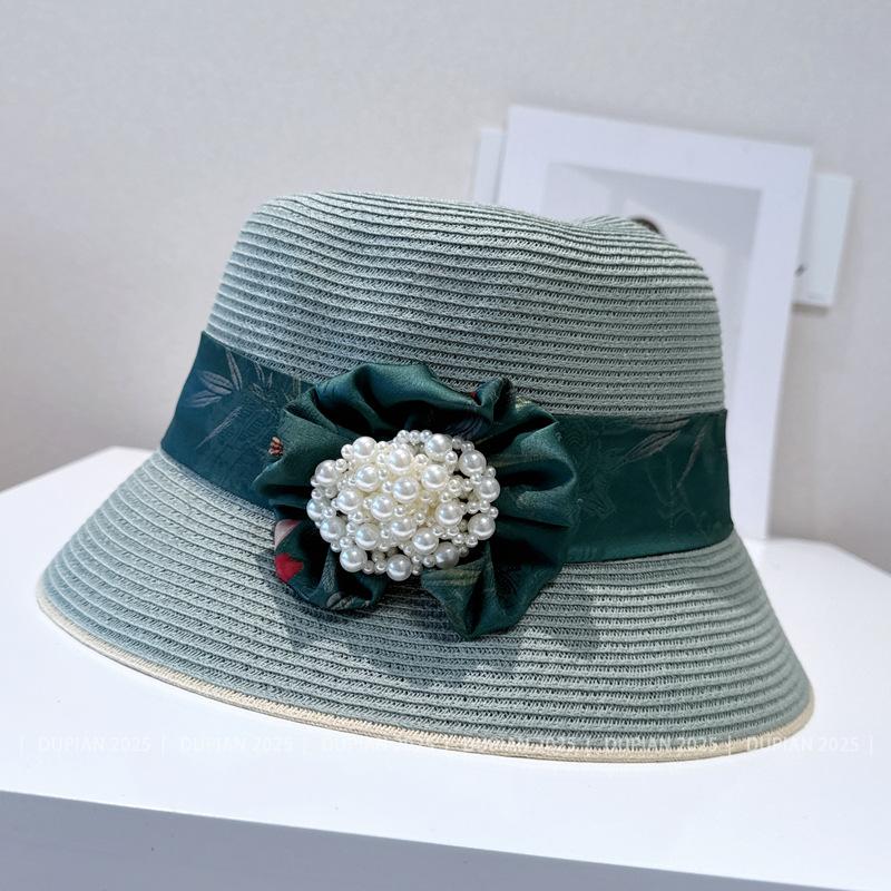 Sombrero de Pescador Bordado de Satén Estilo Chino para Mujer, Sombrero de Paja de Verano para Protección Solar con Bordes Contrastantes, Sombrero de Cubo con Parasol de Flor de Perla Tridimensional