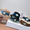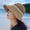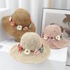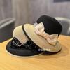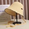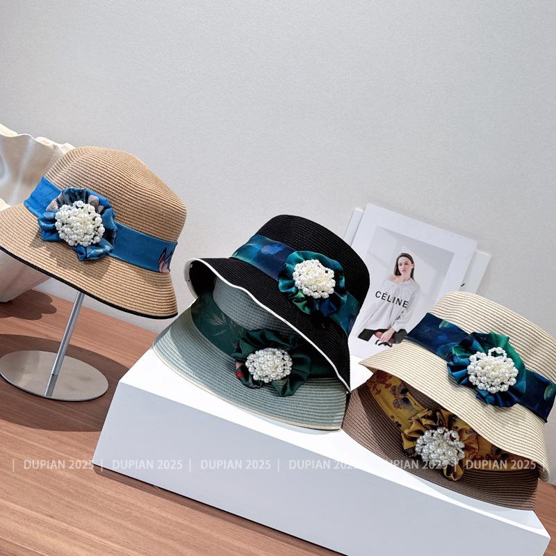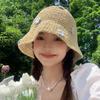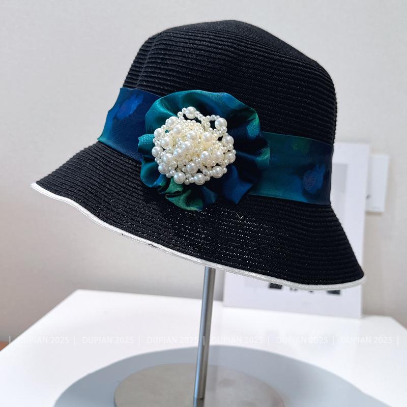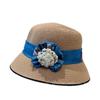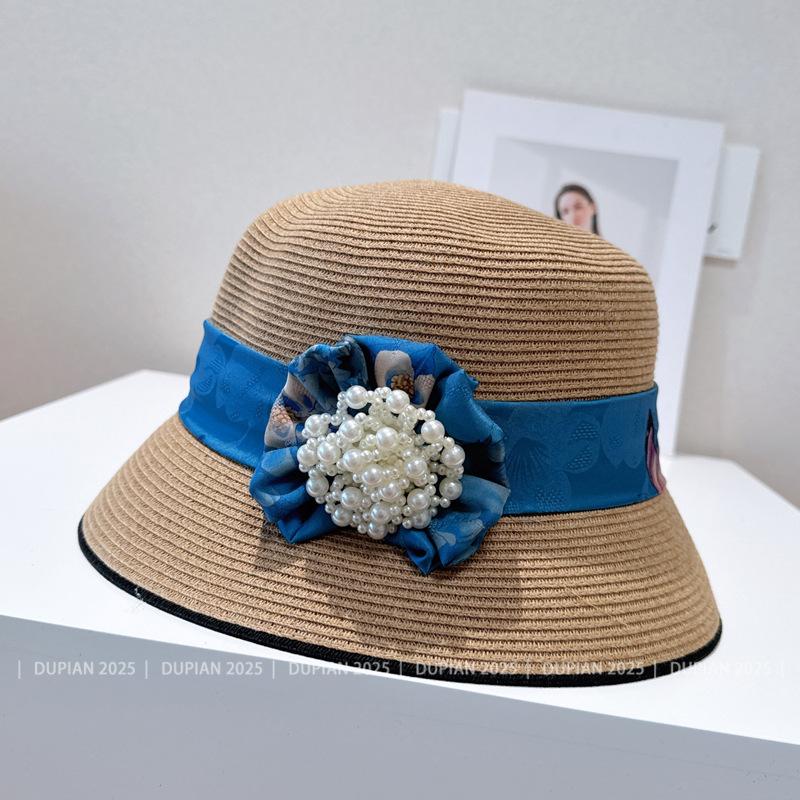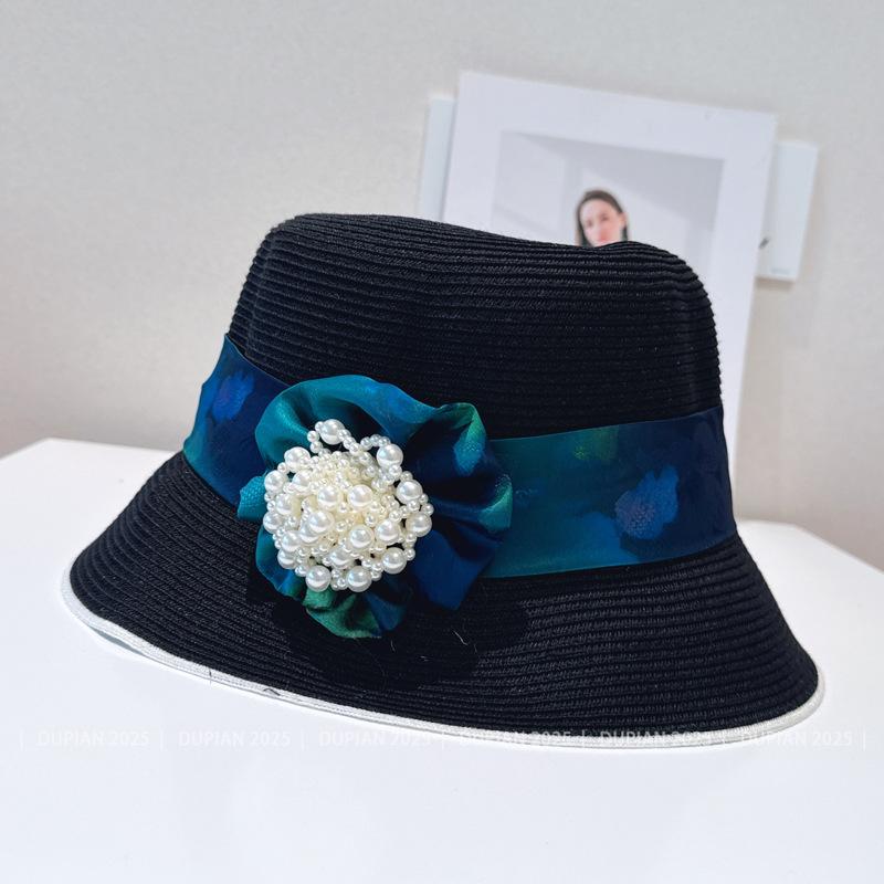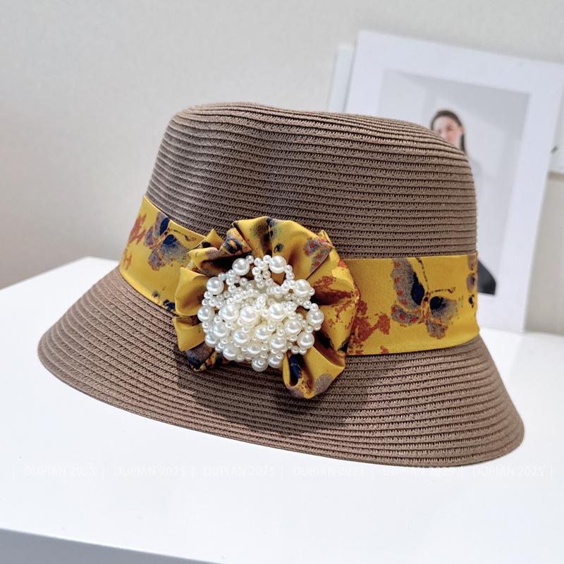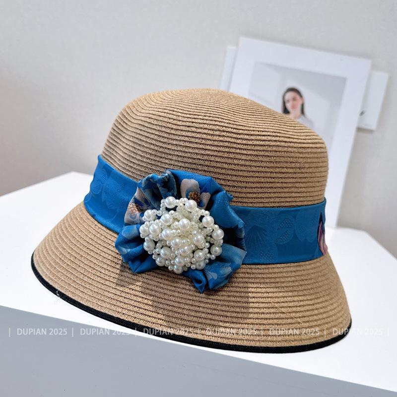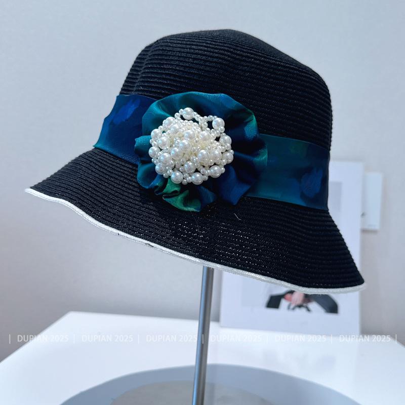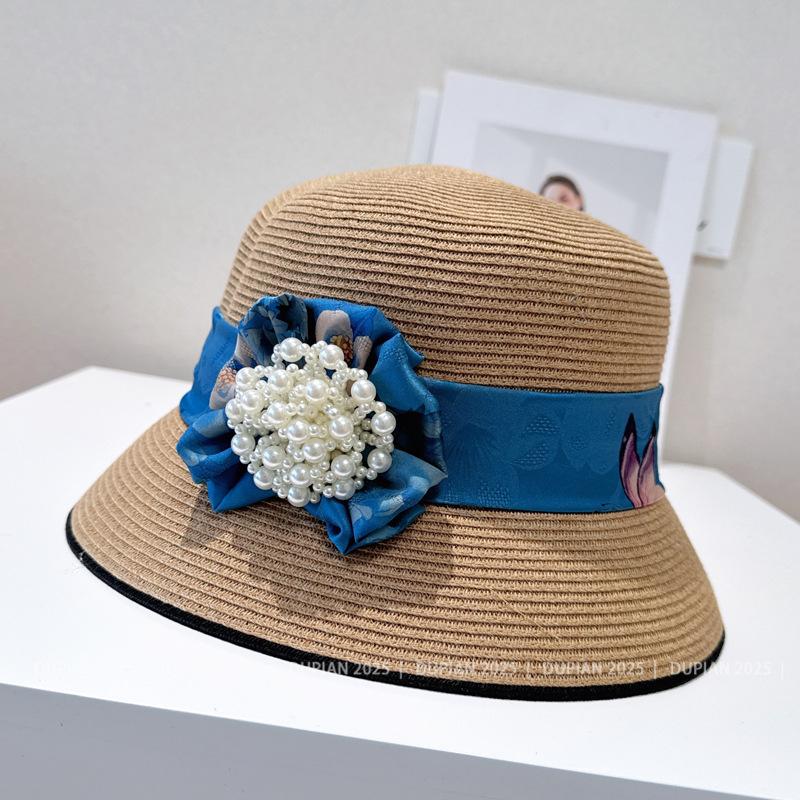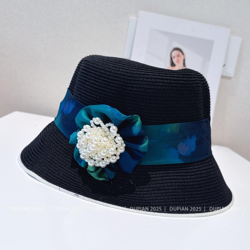 Sombrero de Pescador Bordado de Satén Estilo Chino para Mujer, Sombrero de Paja de Verano para Protección Solar con Bordes Contrastantes, Sombrero de Cubo con Parasol de Flor de Perla Tridimensional