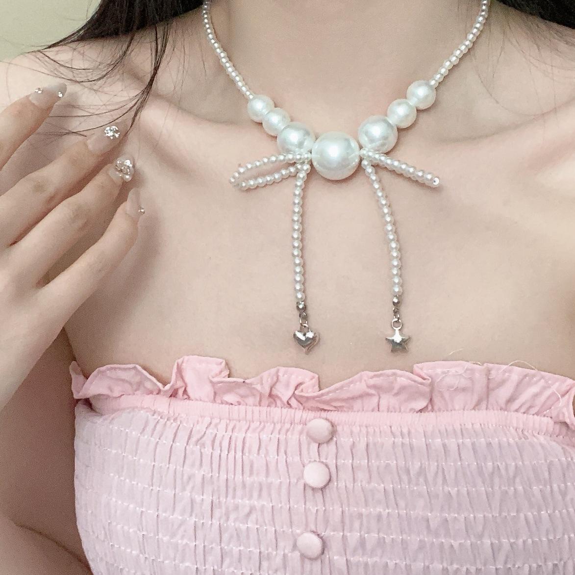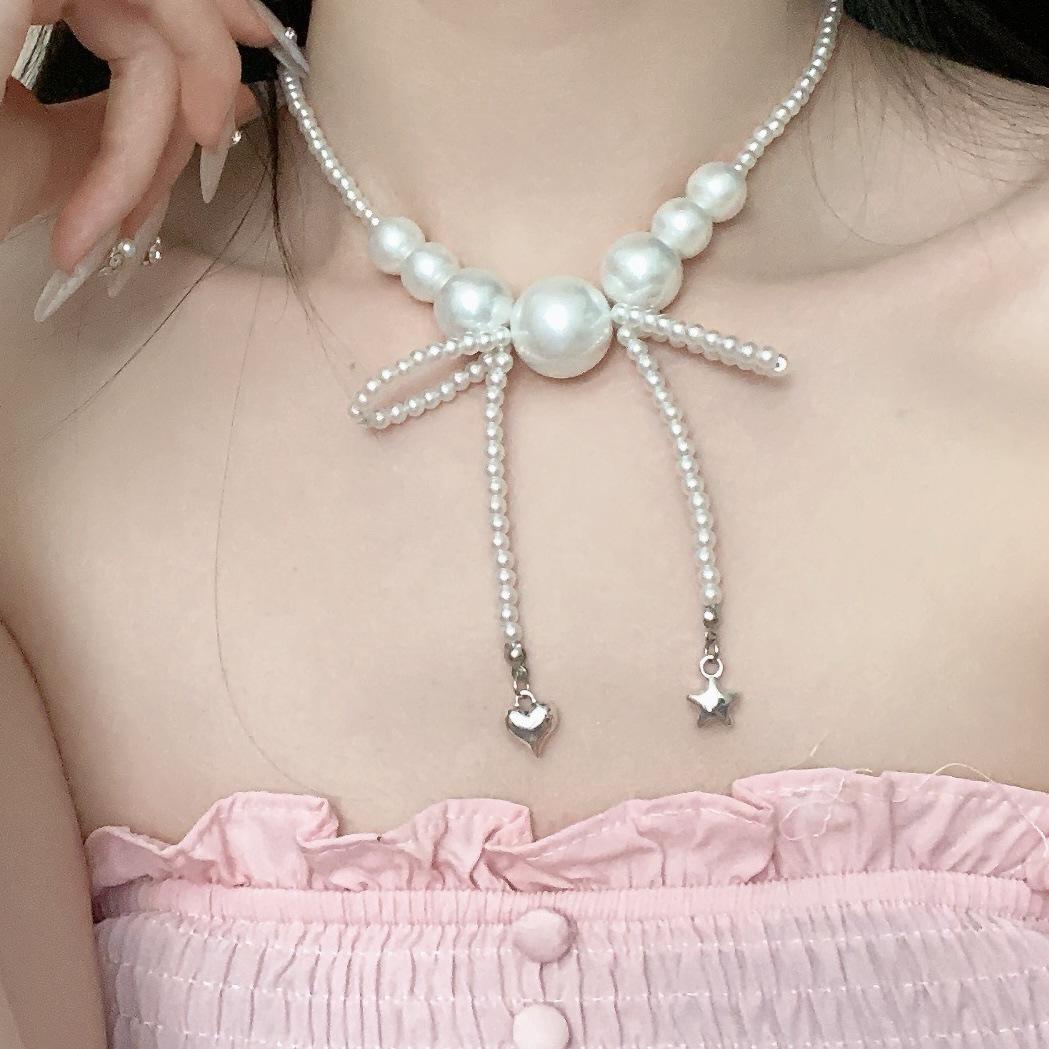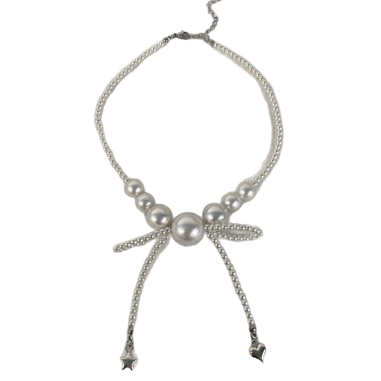 Collar de Perlas Lazo Amor Estrella Diseño de Alto Sentido Lujo Ligero Cadena Clavícula Collar de Moda Elegante Combinable