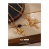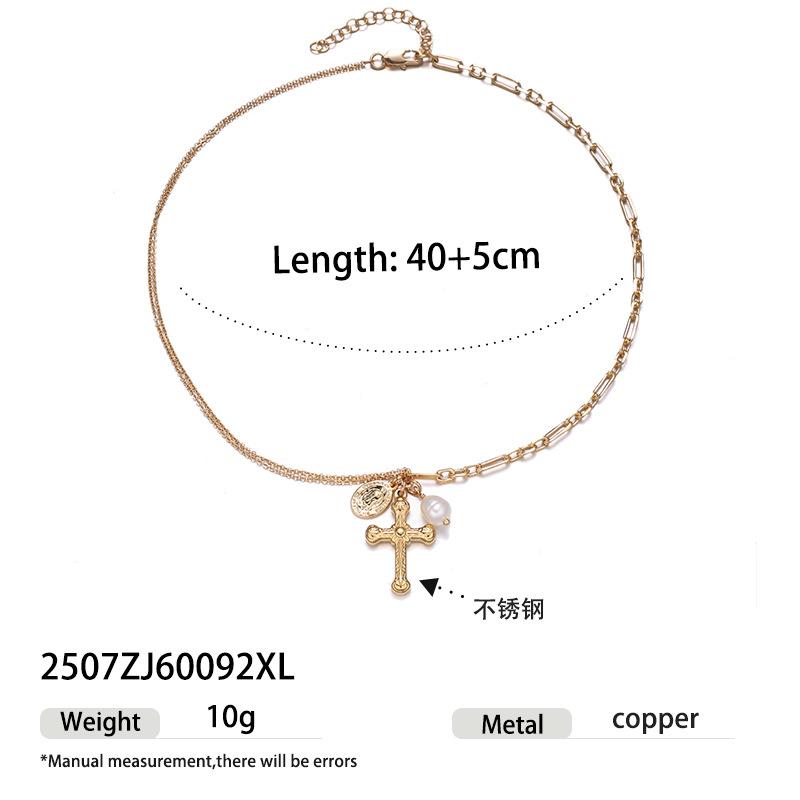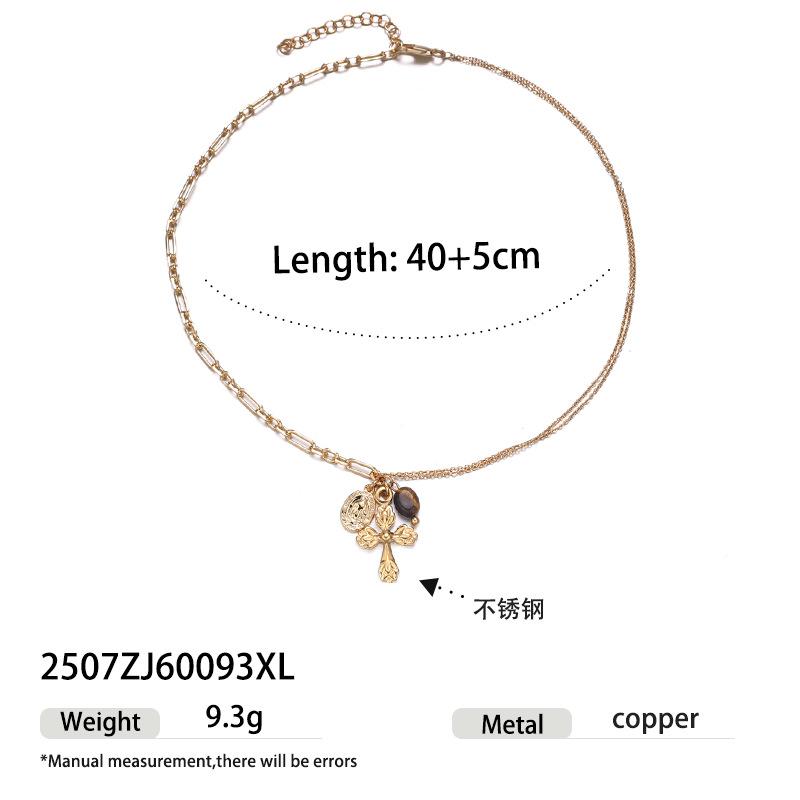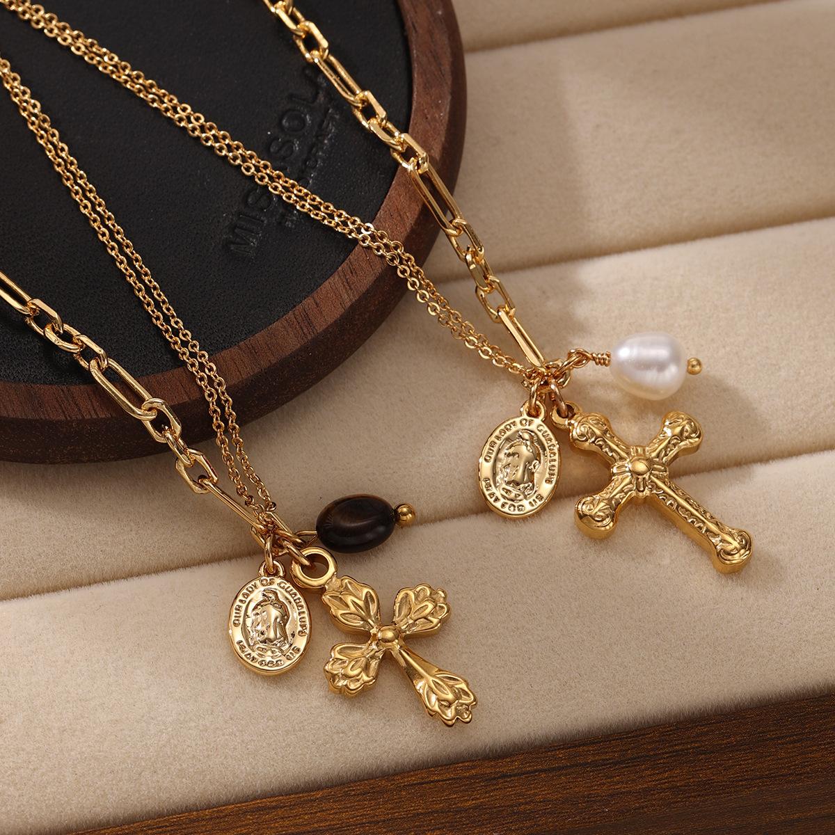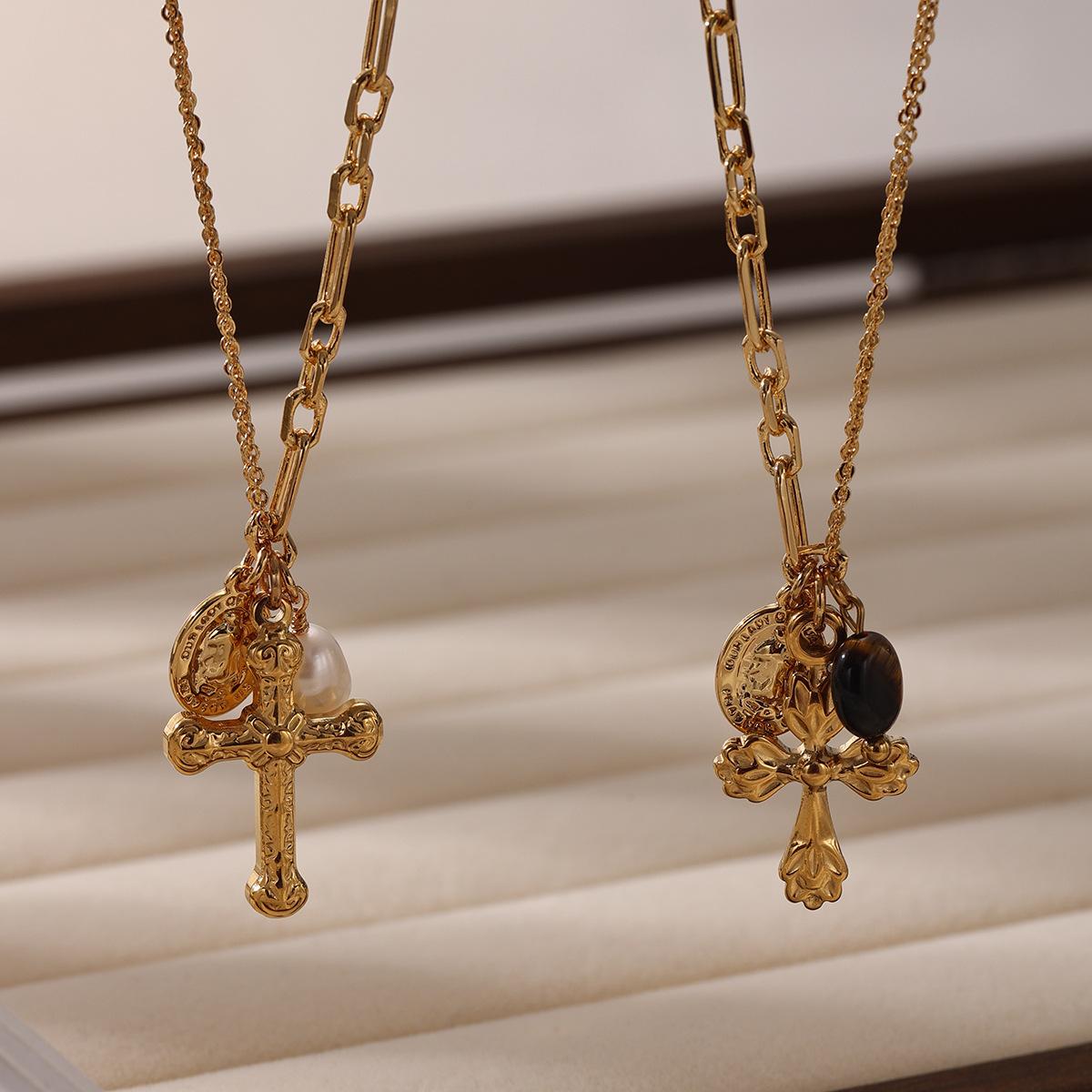 Colgante de cruz de estilo retro moderno chapado en oro de 18k con exquisito collar de perlas naturales ojo de tigre nuevo