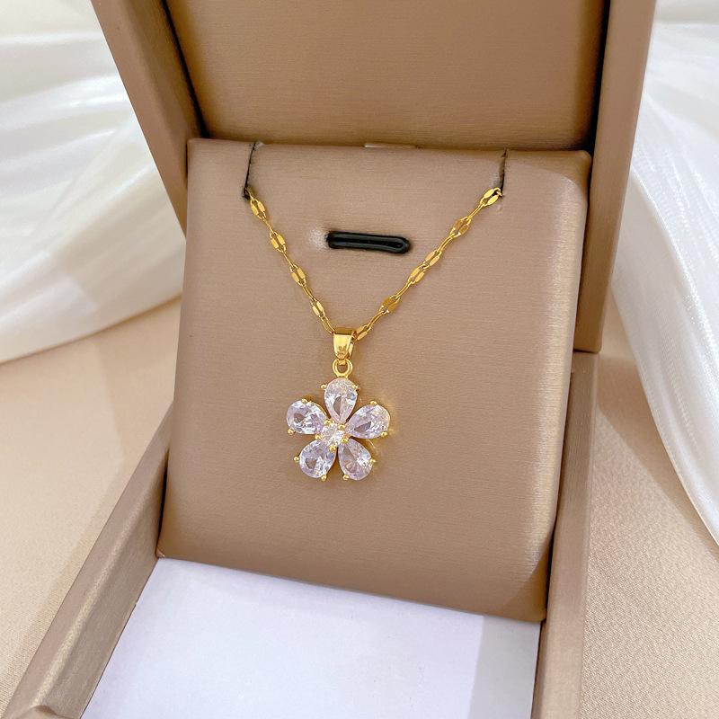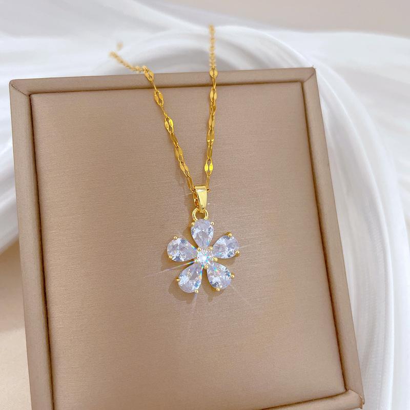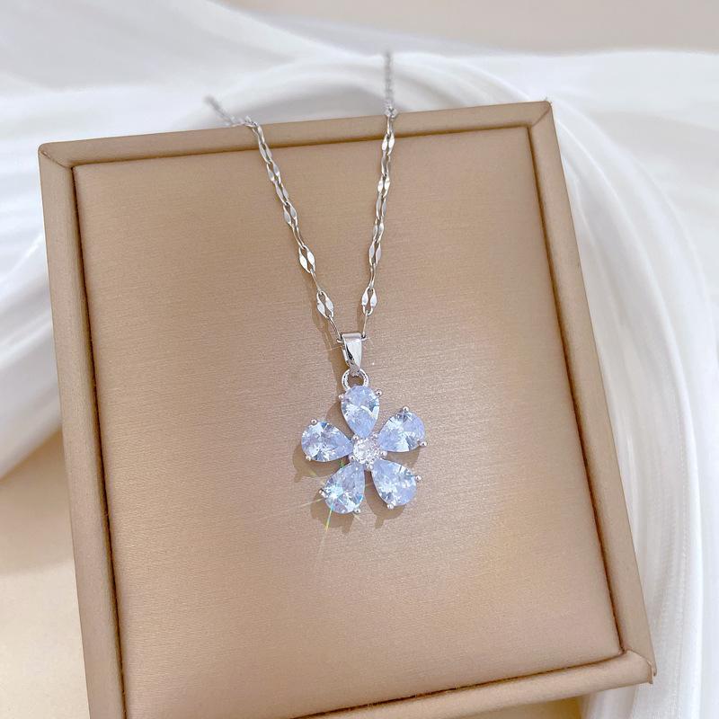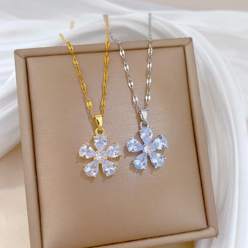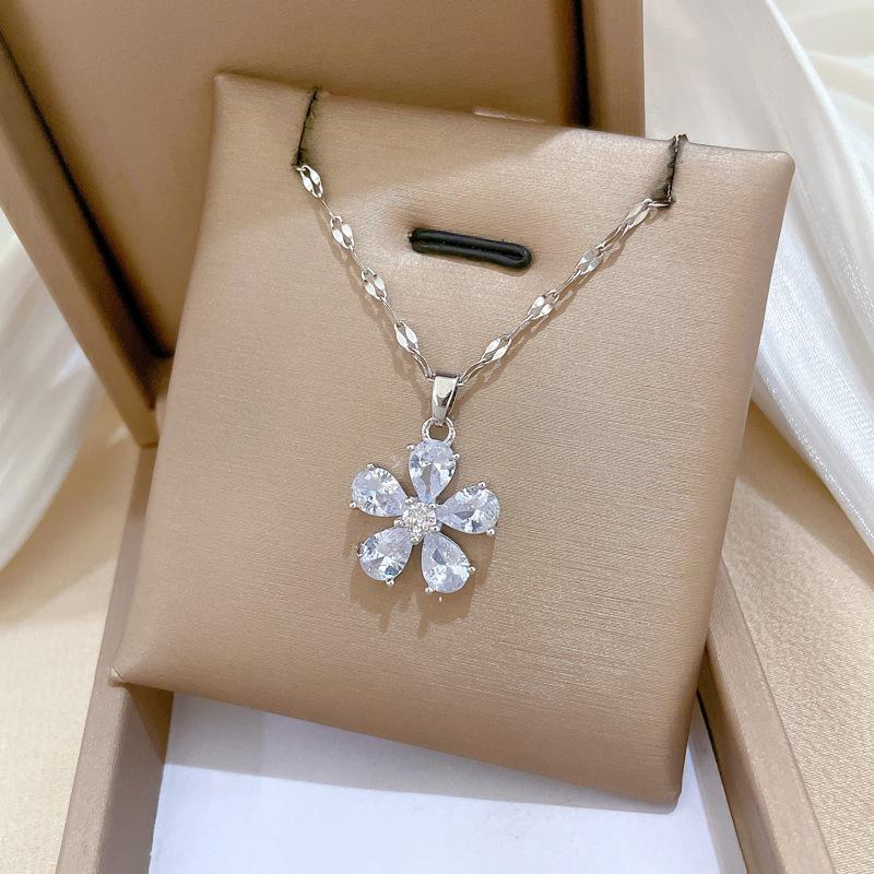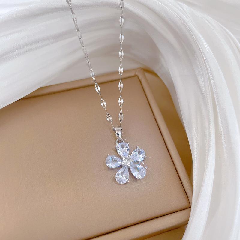[Acero de Titanio] Flor de Cinco Pétalos Lujo Accesible Elegante Precioso Collar de Diamantes Completos Femenino Celebridad de Internet Versátil Cadena para Clavícula Cadena de Acero de Titanio