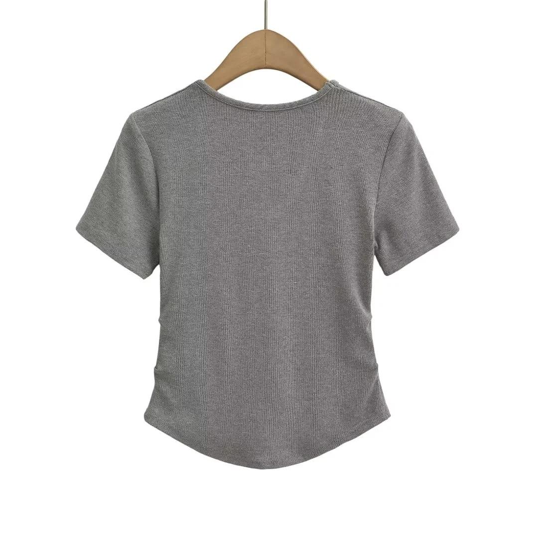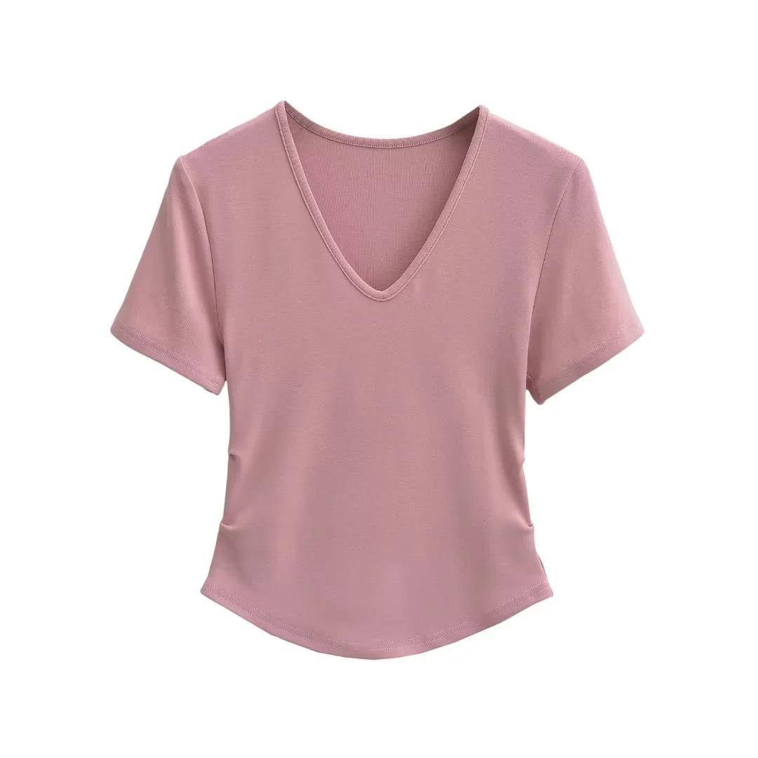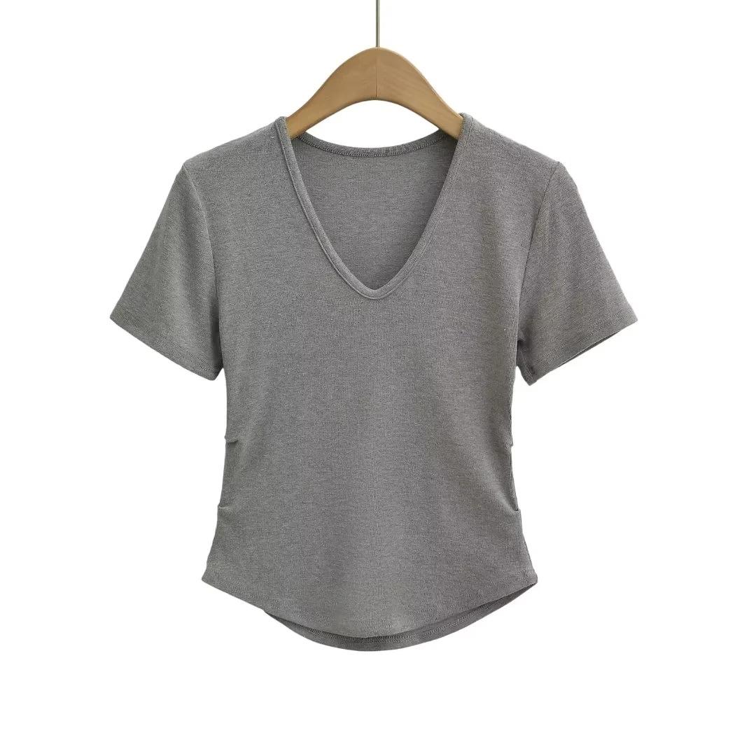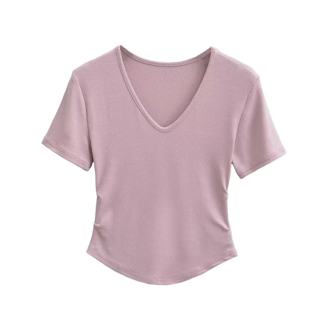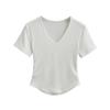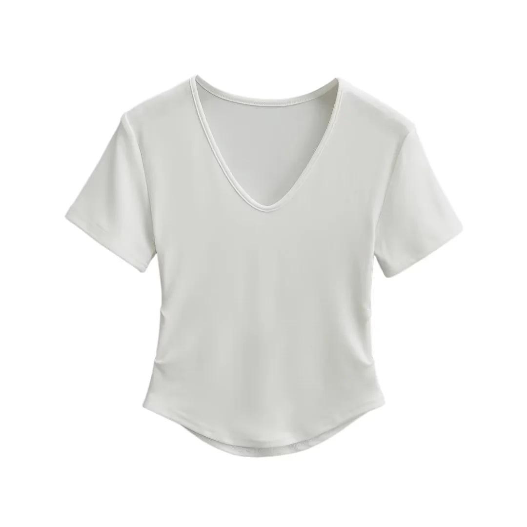 Verano Nuevo Chica Picante Dulce Sexy Hombro Top de Manga Corta para Mujer Cuello en V Cintura Alta Plisado Ajustado Corto Curvo Camiseta