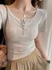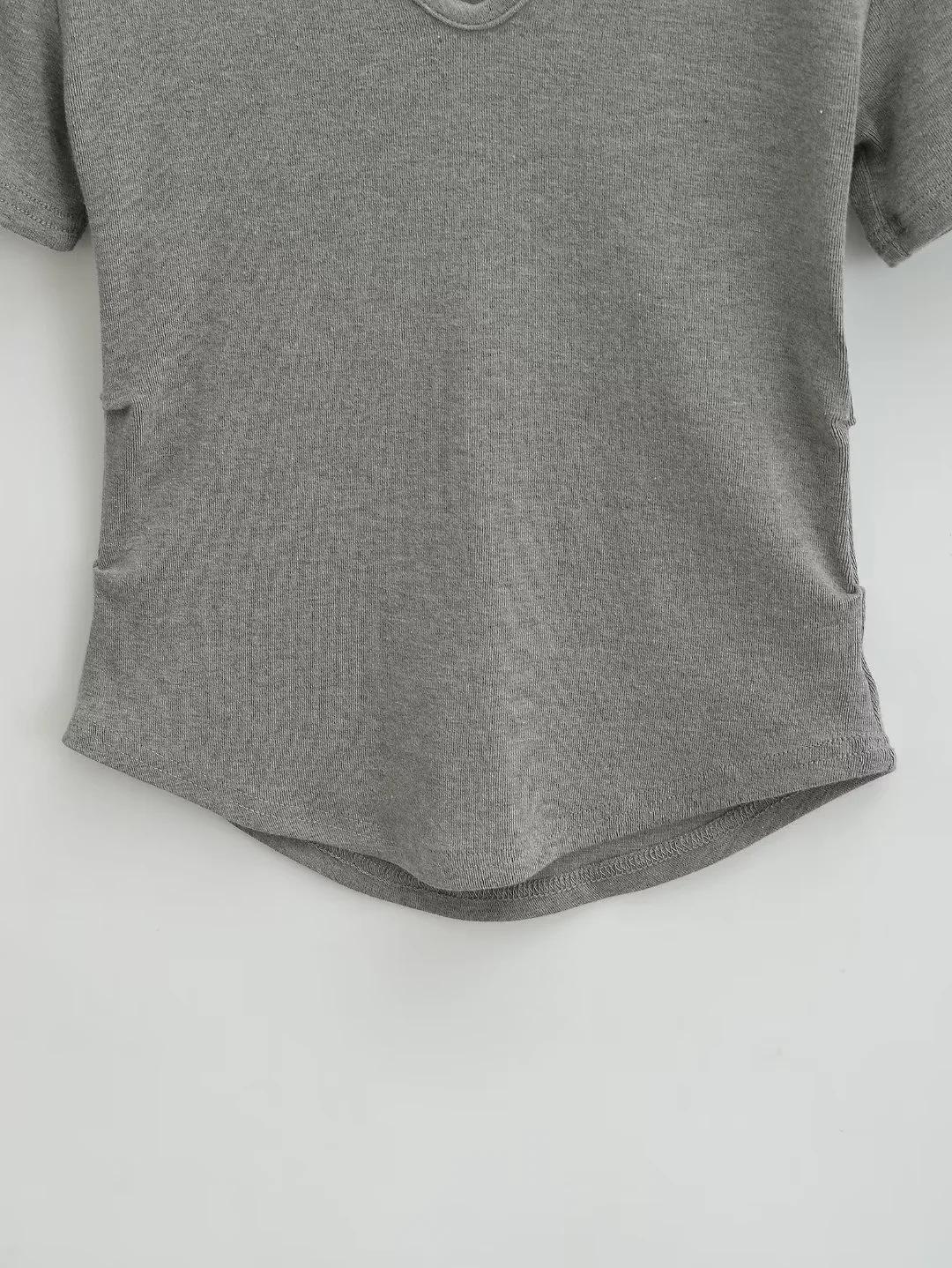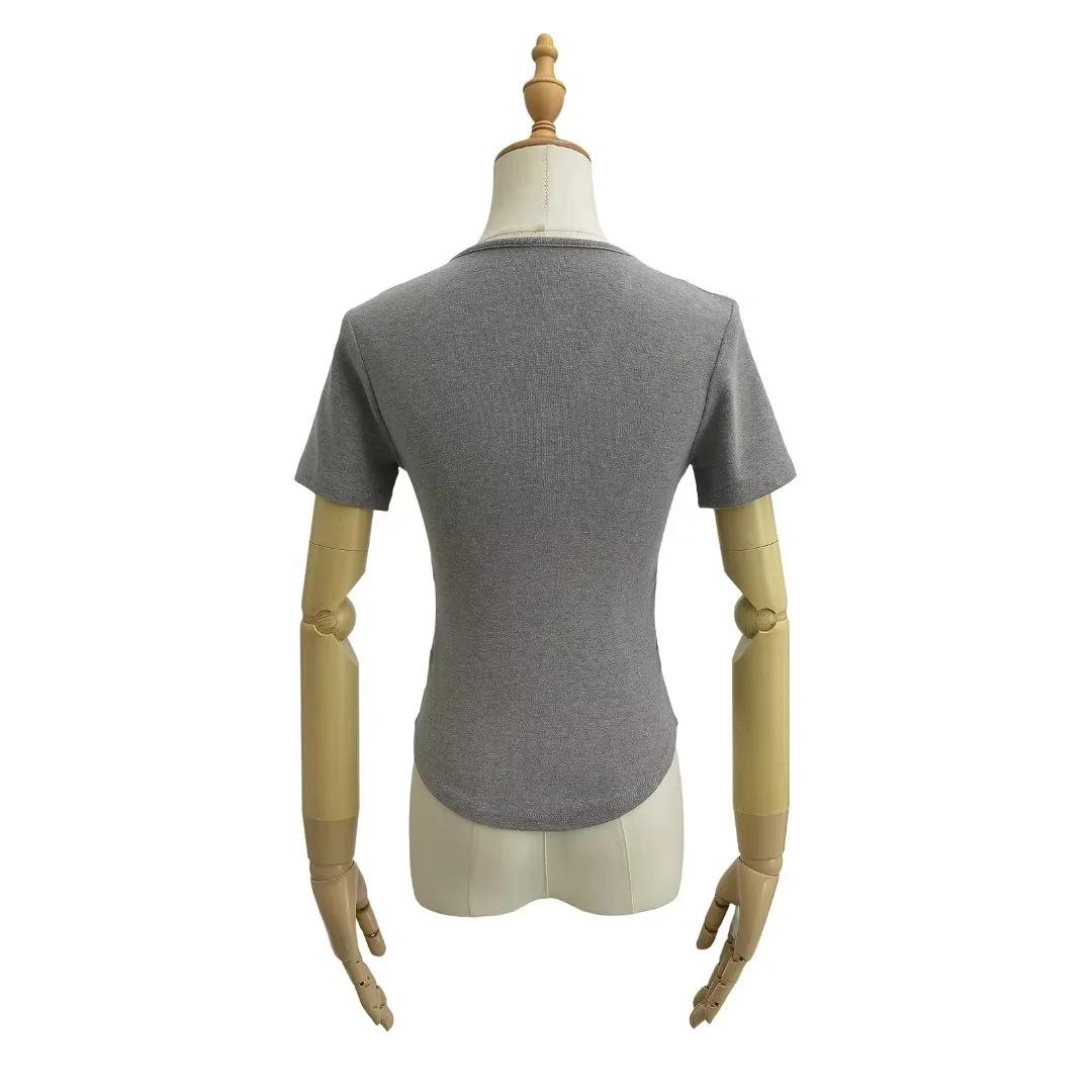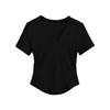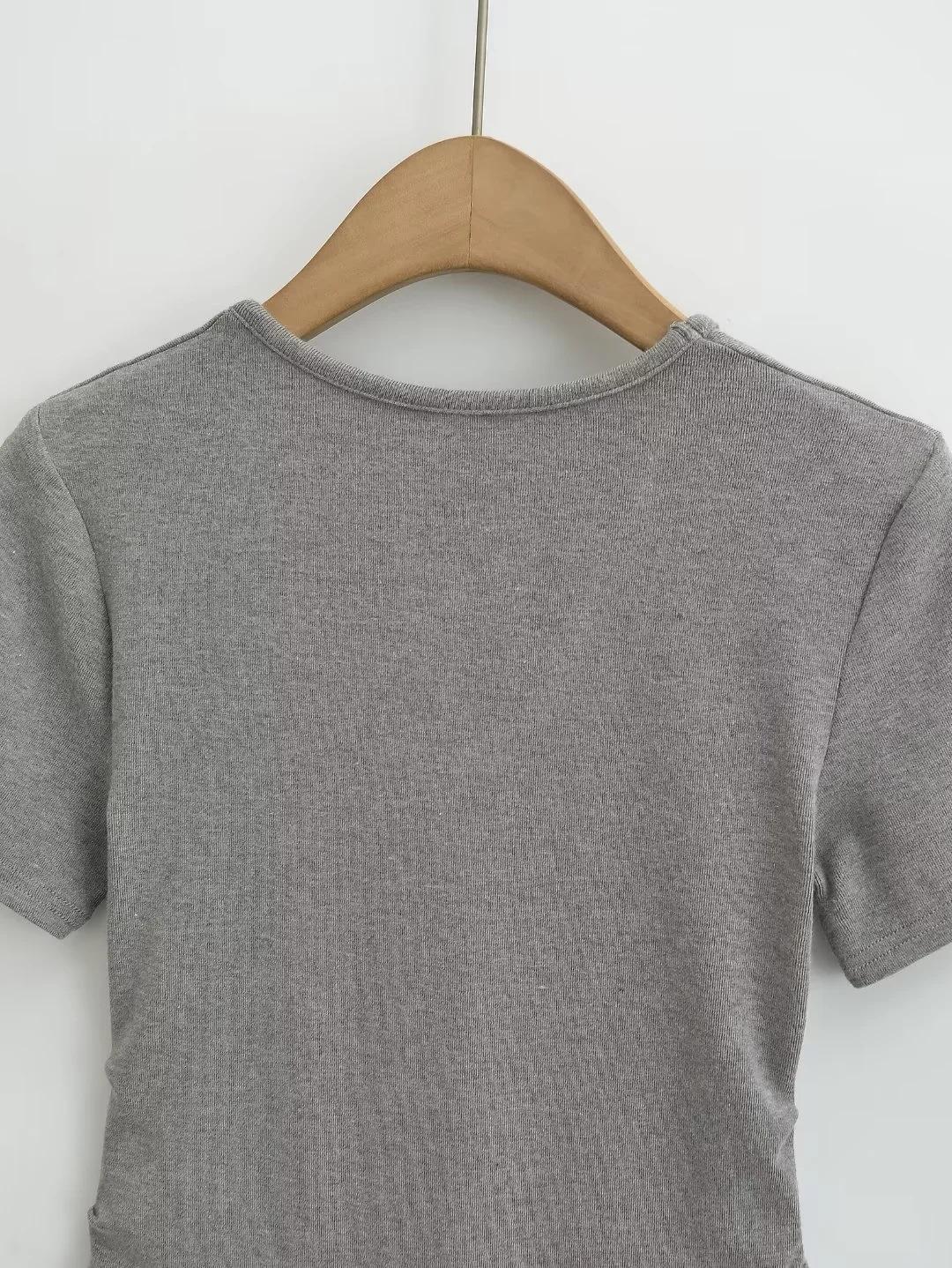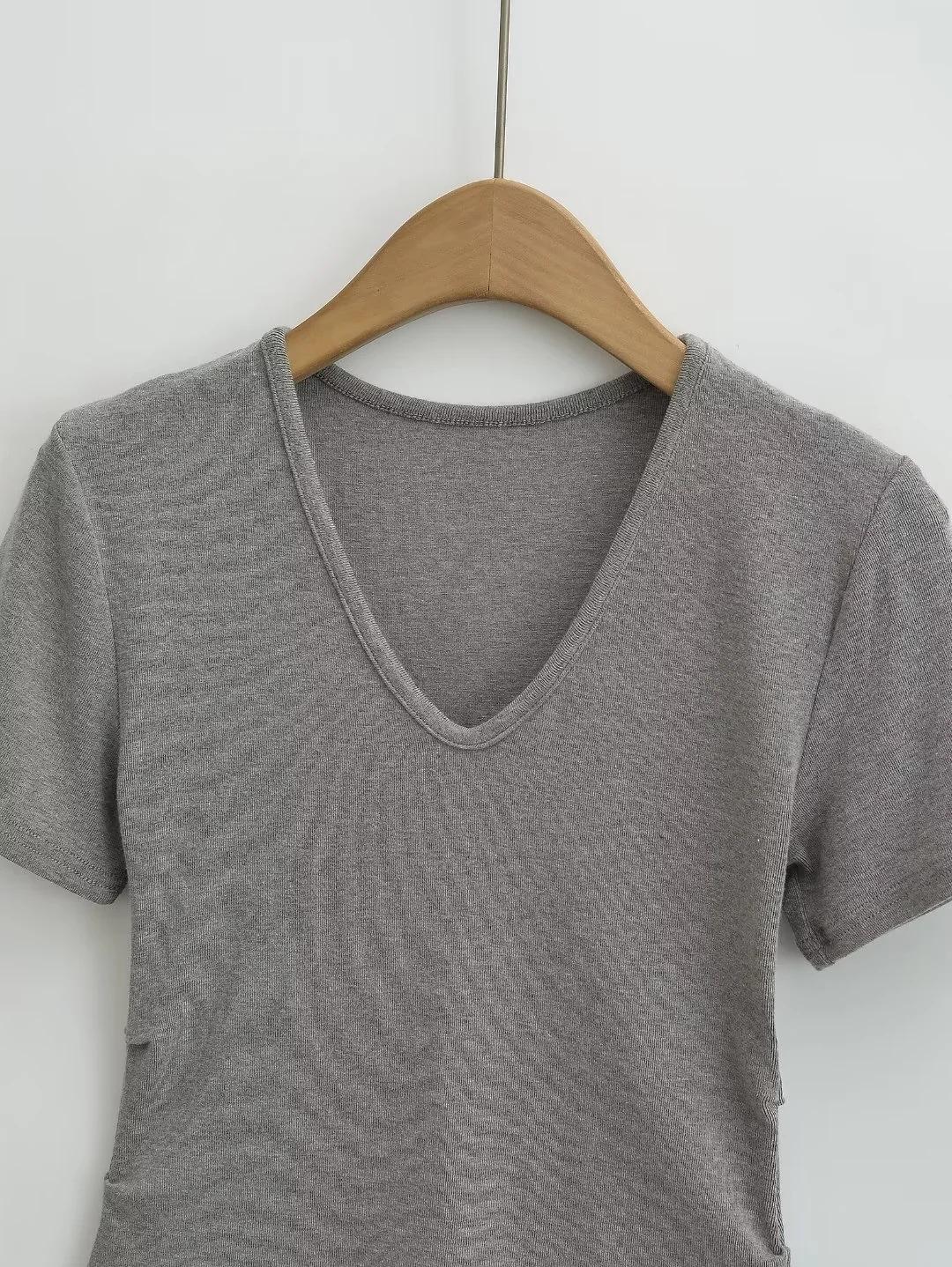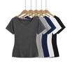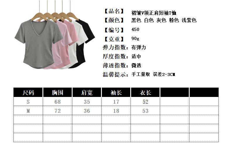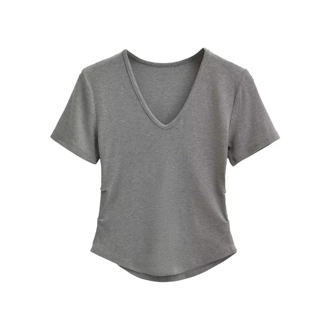Verano Nuevo Chica Picante Dulce Sexy Hombro Top de Manga Corta para Mujer Cuello en V Cintura Alta Plisado Ajustado Corto Curvo Camiseta
