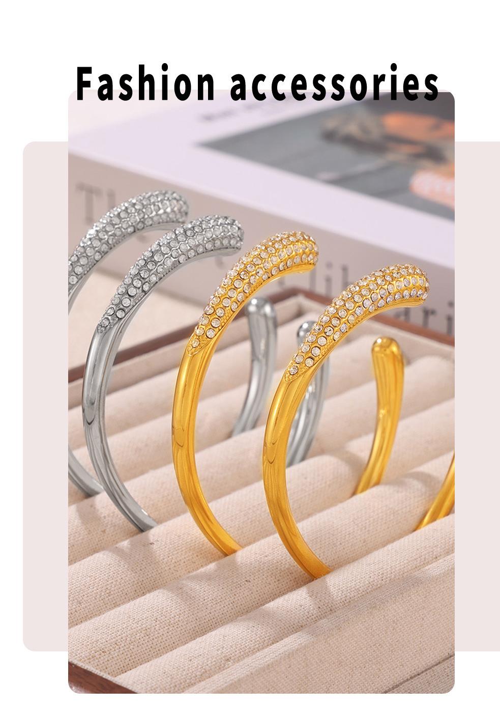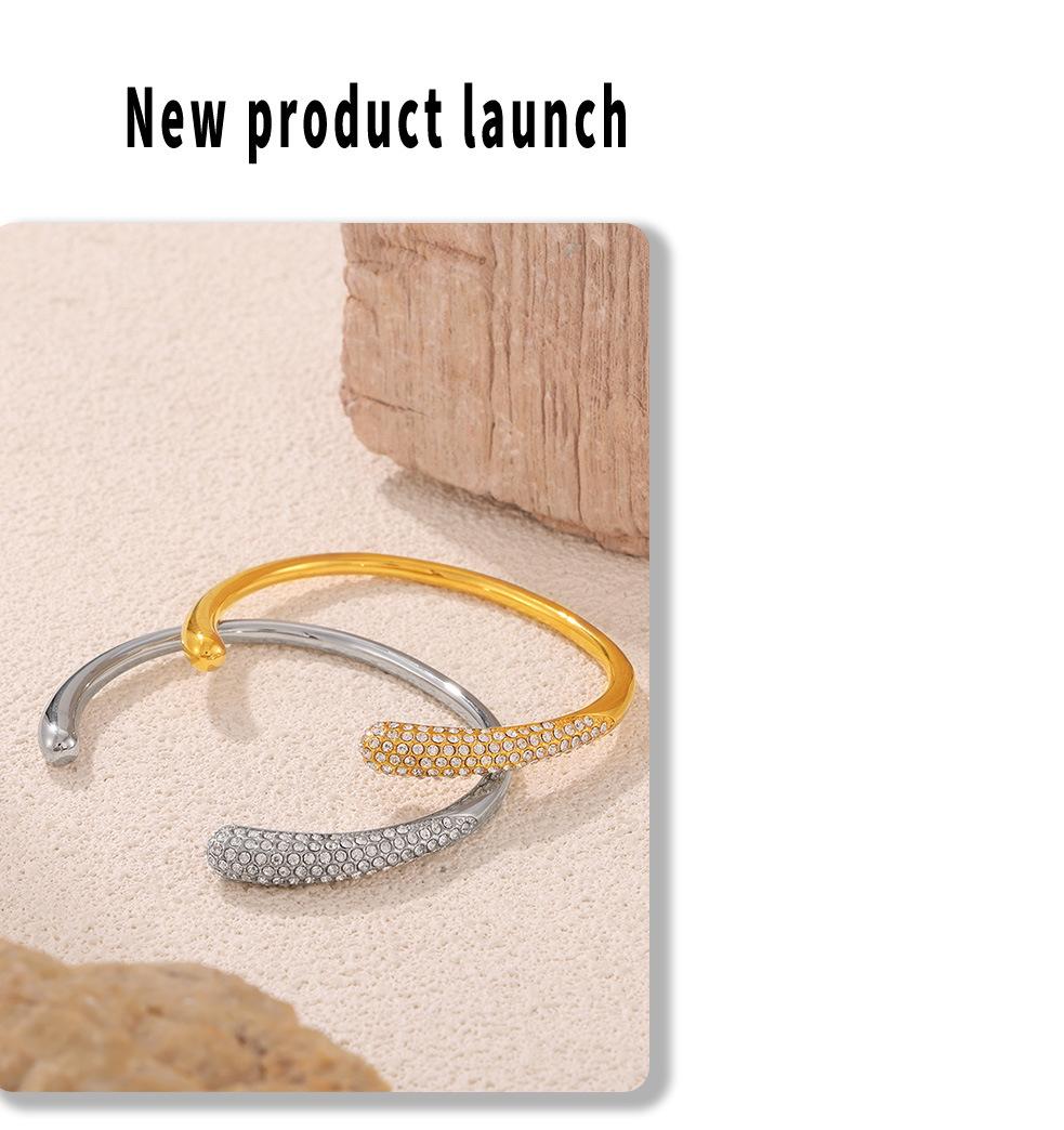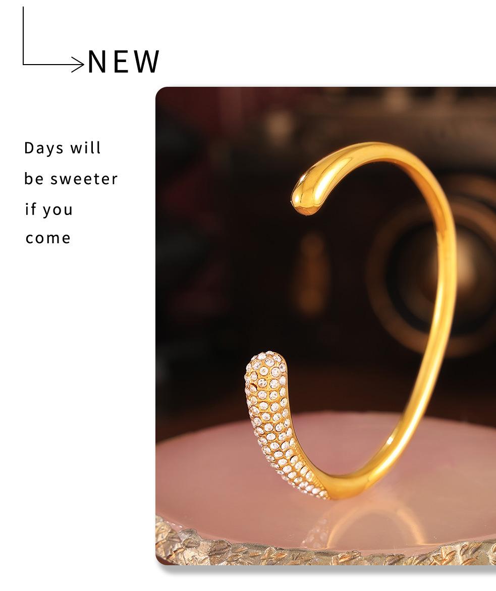 Pulsera abierta transfronteriza de moda de Europa y Estados Unidos con micro incrustaciones calientes de circonita, diseño de alta gama, acero de titanio chapado en oro de 18k.