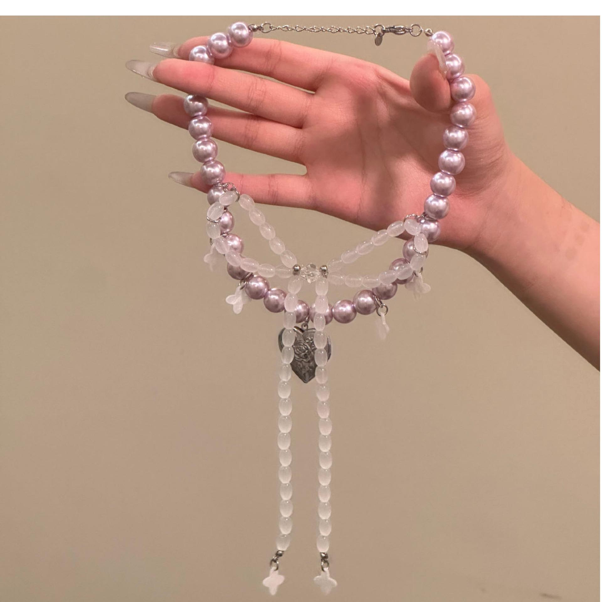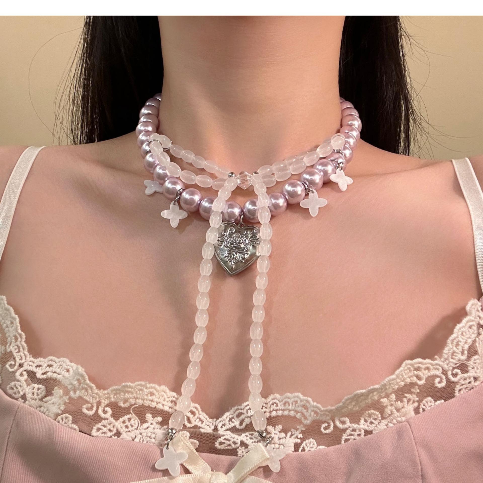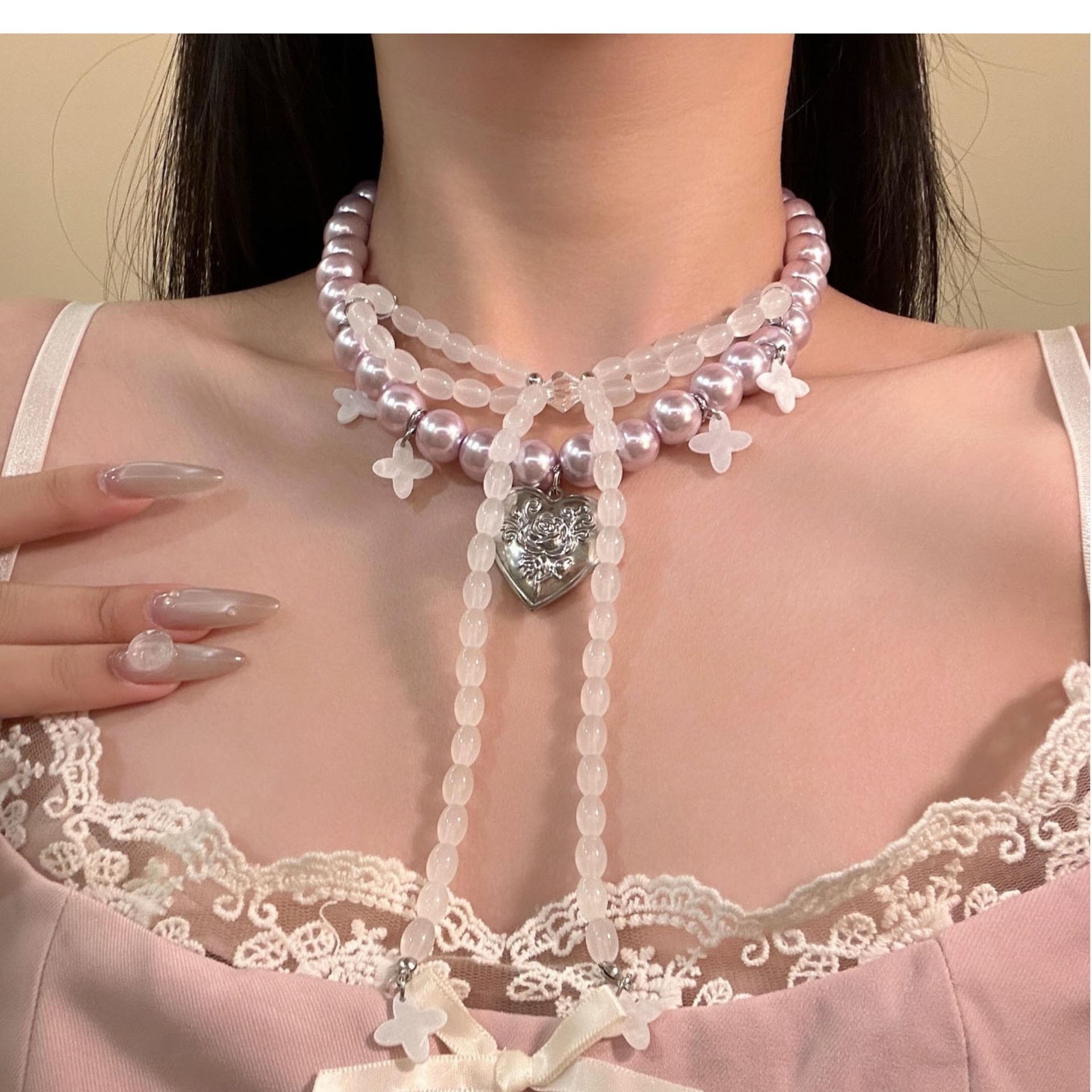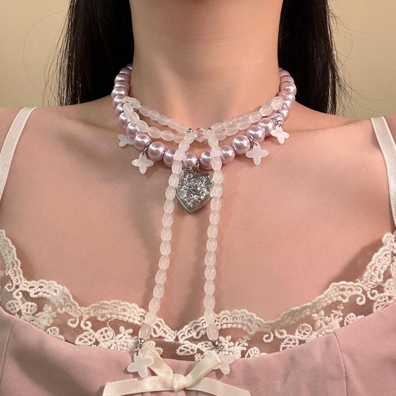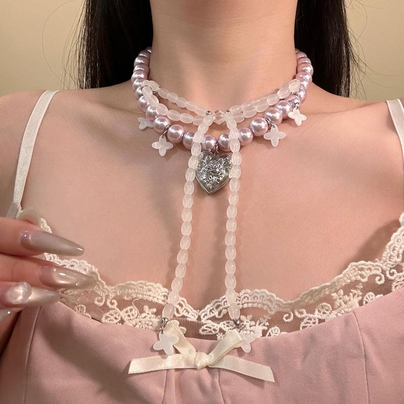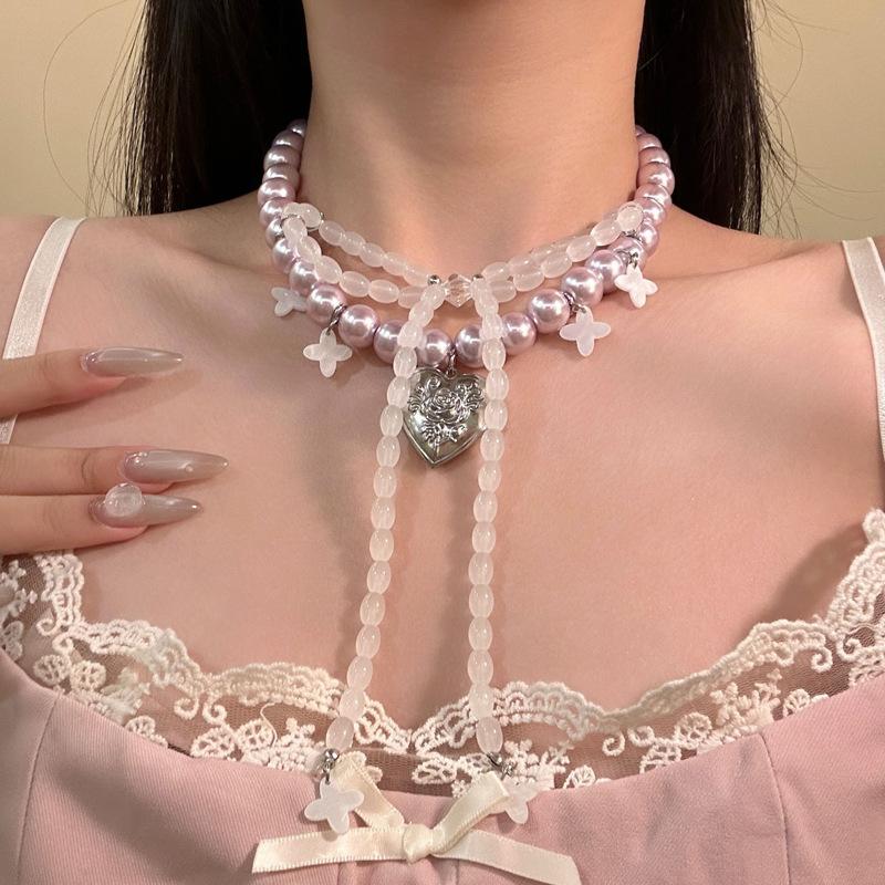 Collar de Perlas con Colgante de Corazón de Lazo Francés Nicho de Lujo Ligero Cadena Clavicular Temperamento Elegante Collar Mujer