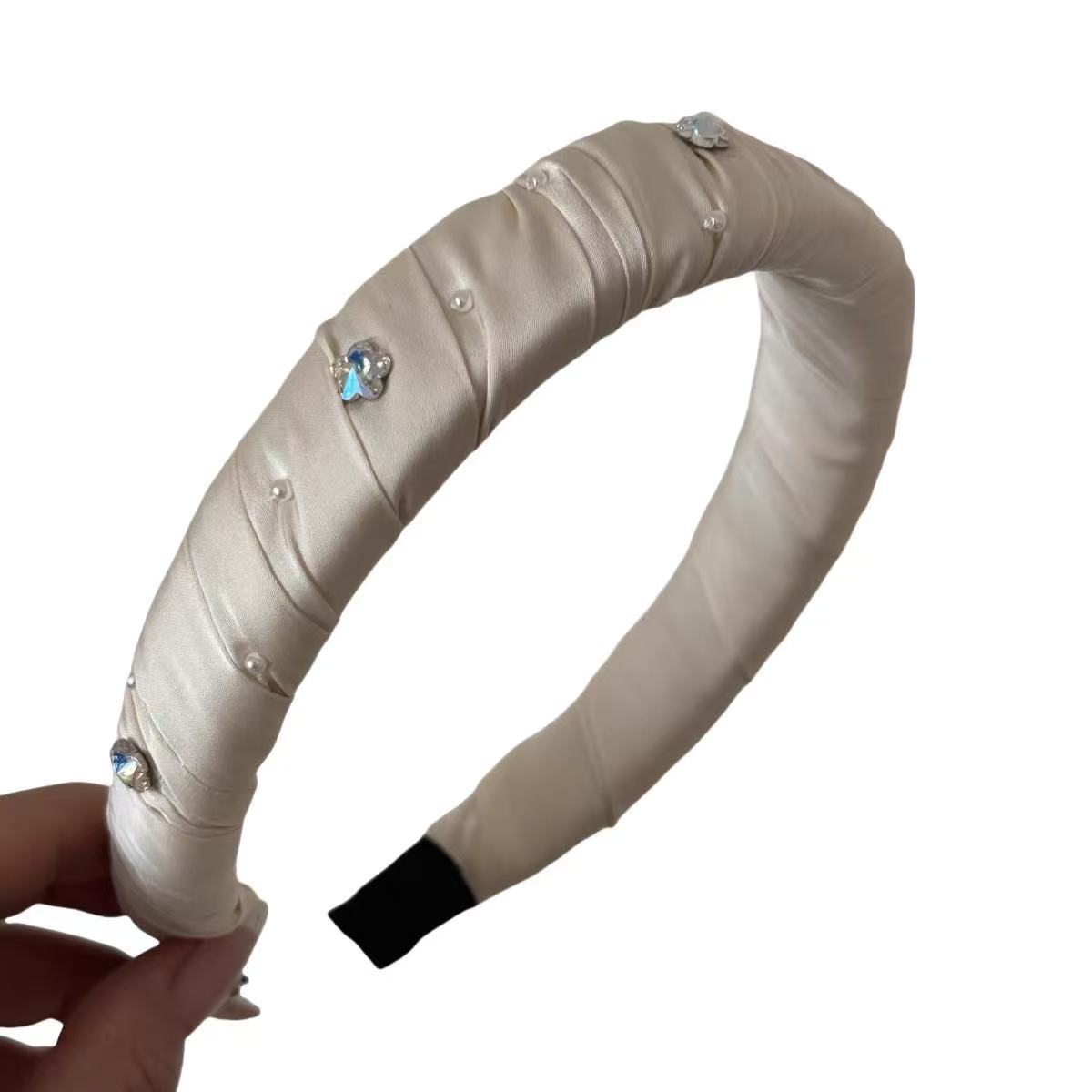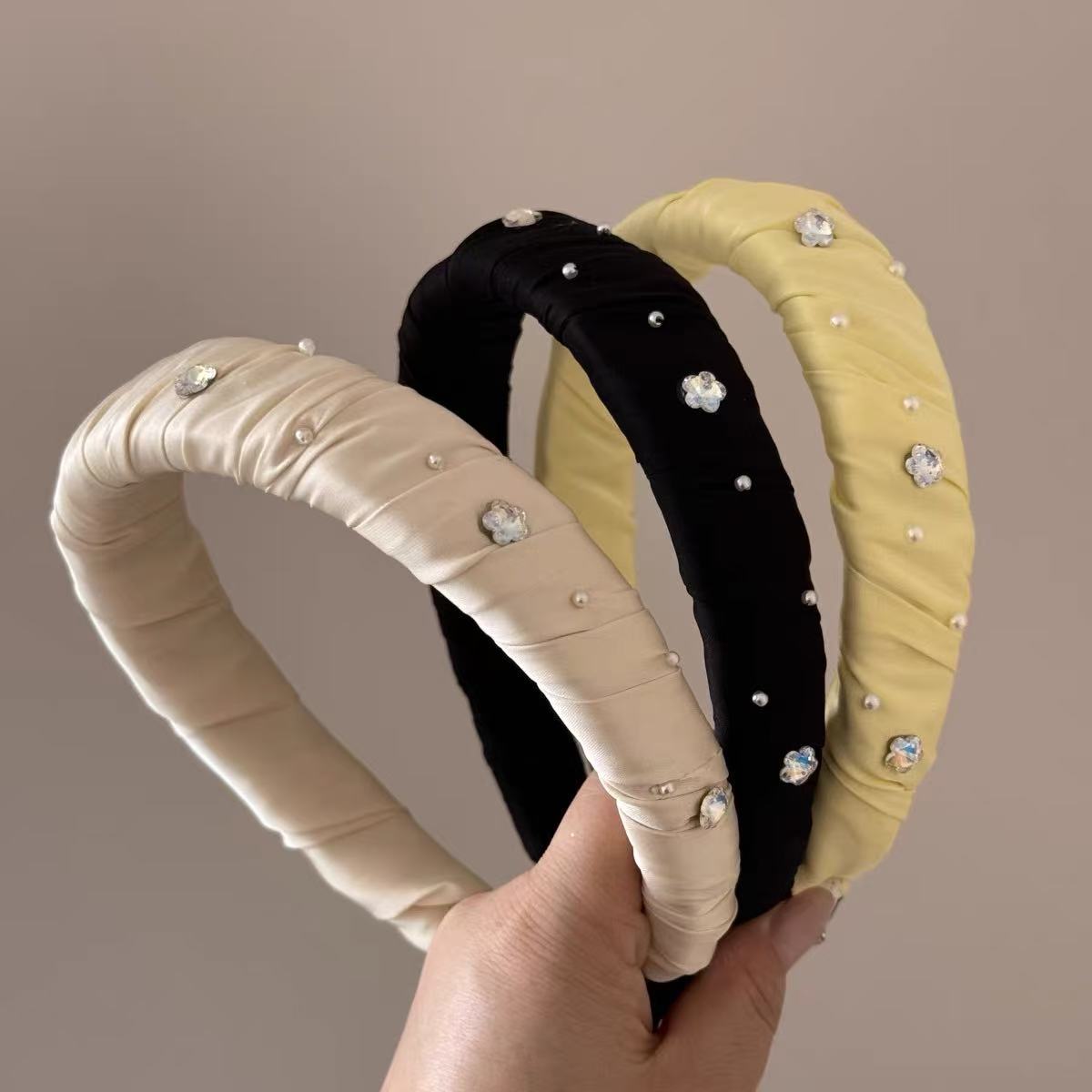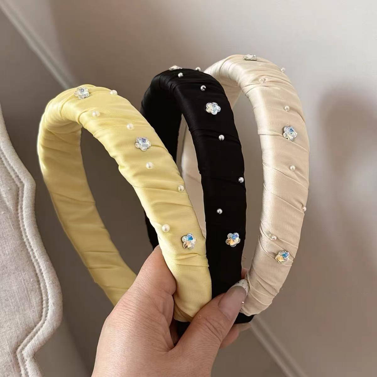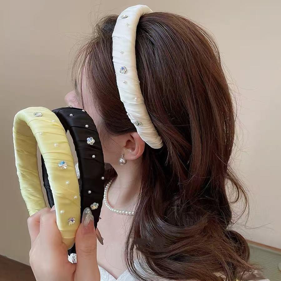 Diadema Ancha Forrada en Satén con Flor de Perla Estilo Coreano y Diamantes Brillantes, Elegante, de Alta Gama, Pasador Fresco