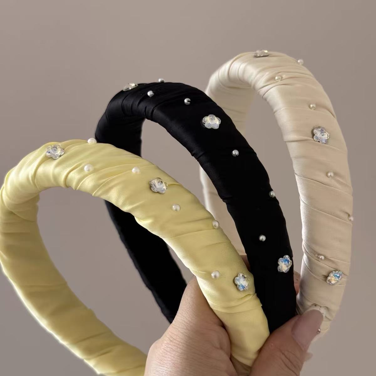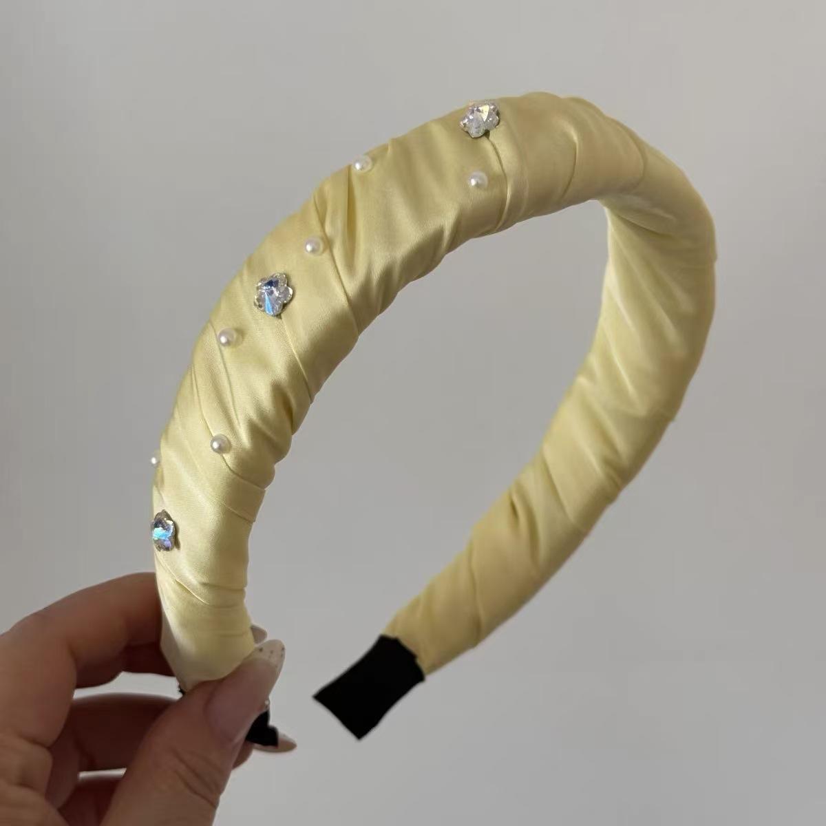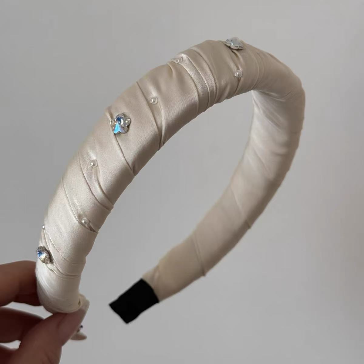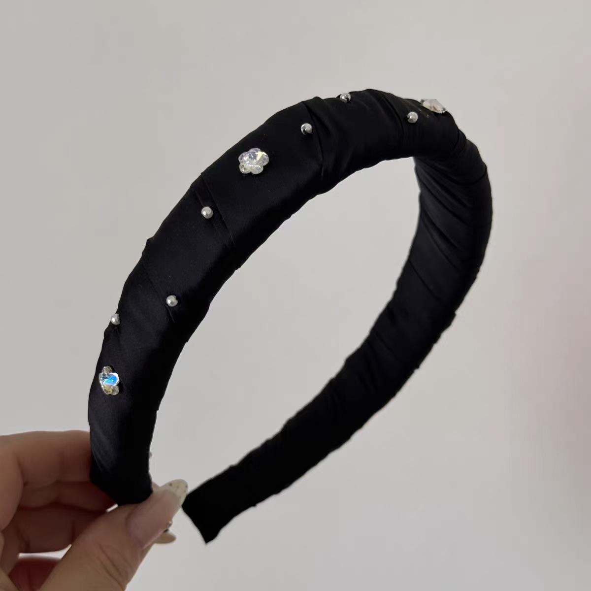 Diadema Ancha Forrada en Satén con Flor de Perla Estilo Coreano y Diamantes Brillantes, Elegante, de Alta Gama, Pasador Fresco