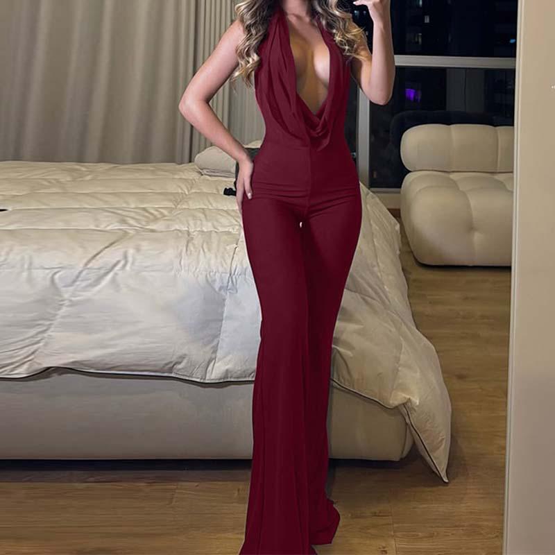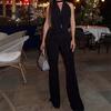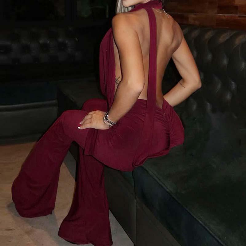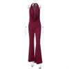 Moda transfronteriza ropa de mujer cuello caído muestra temperamento de chica hot pantalones largos microacampanados color sólido espalda descubierta halter atado mono