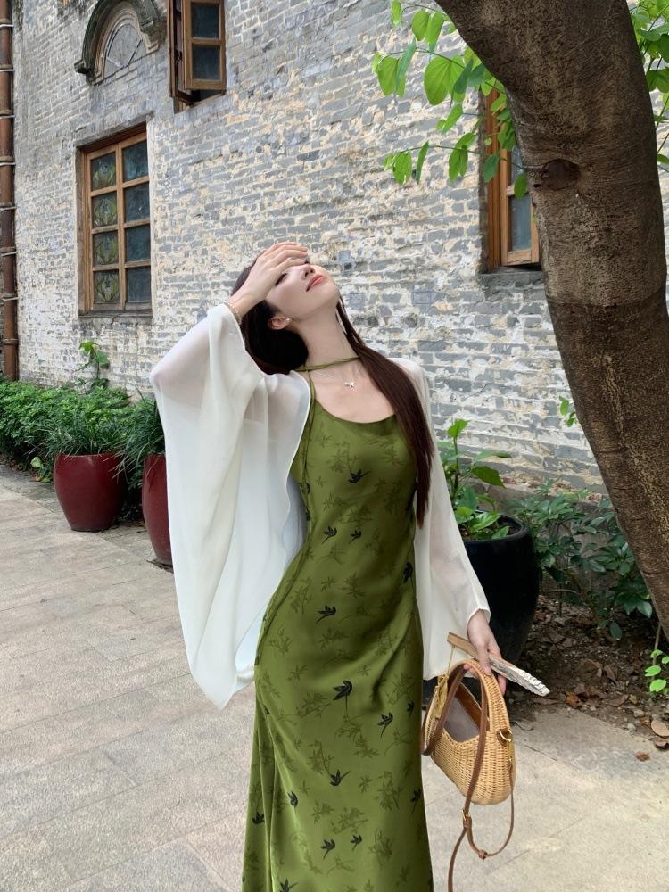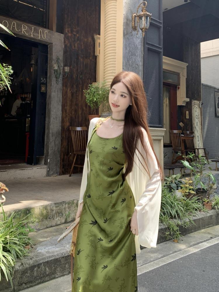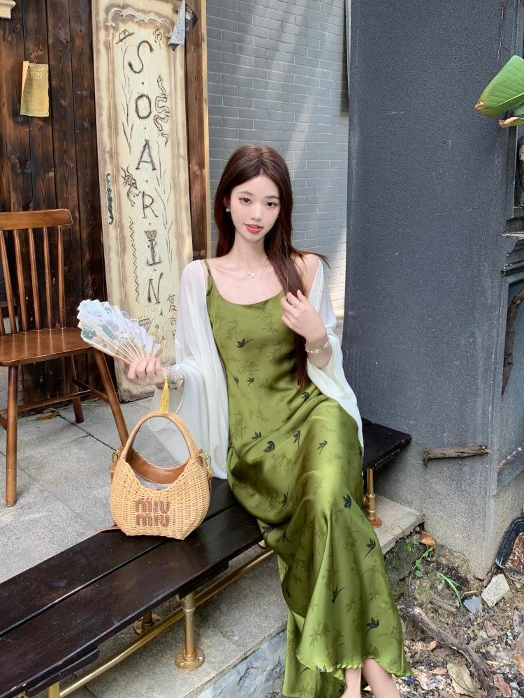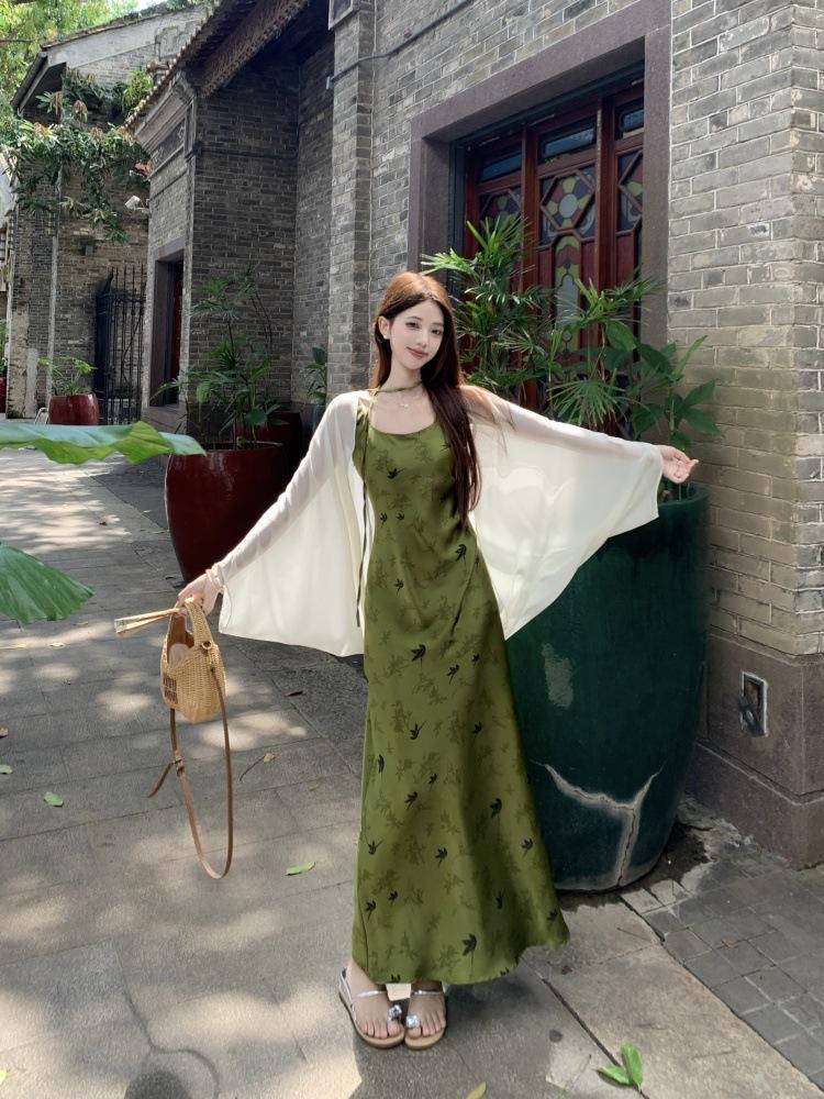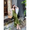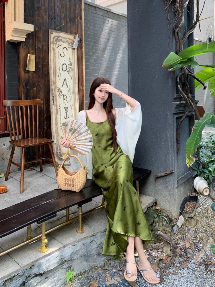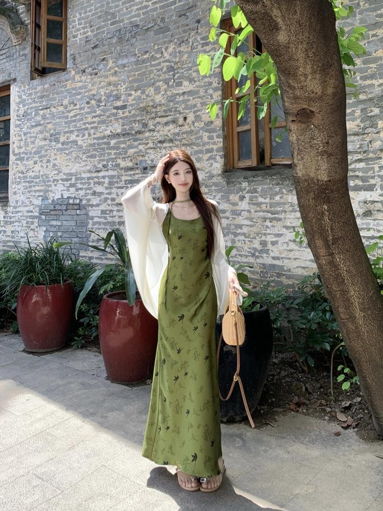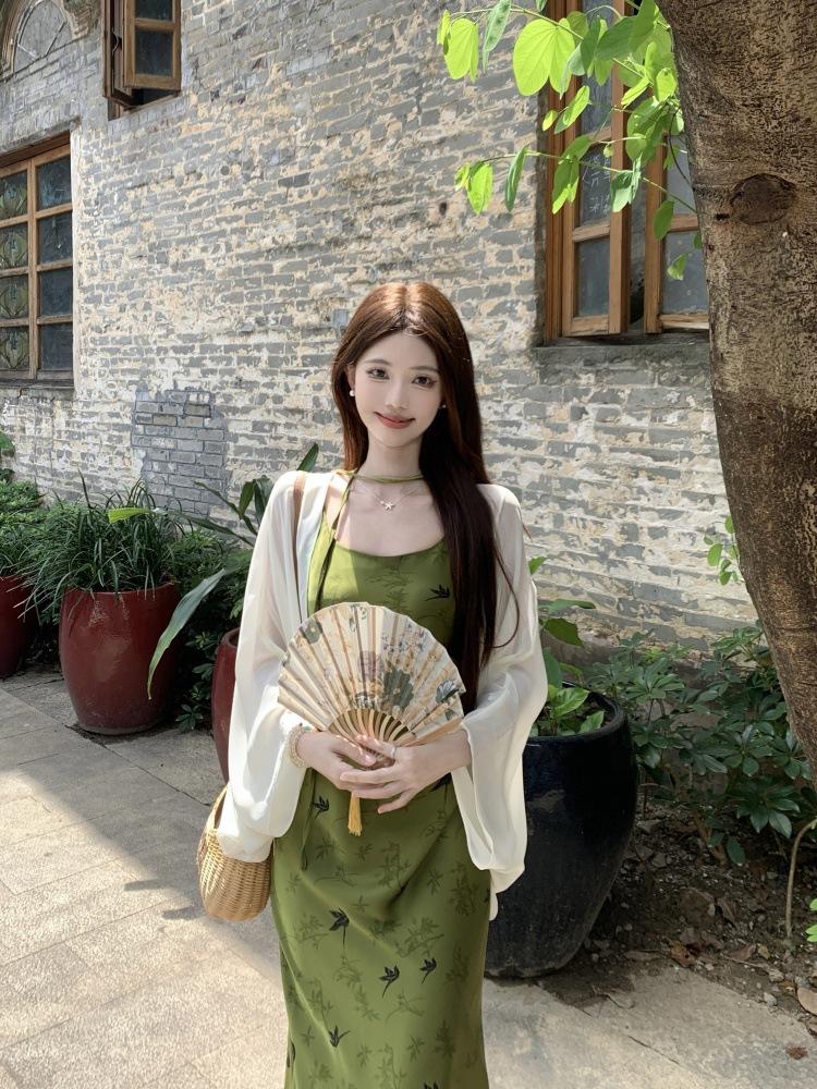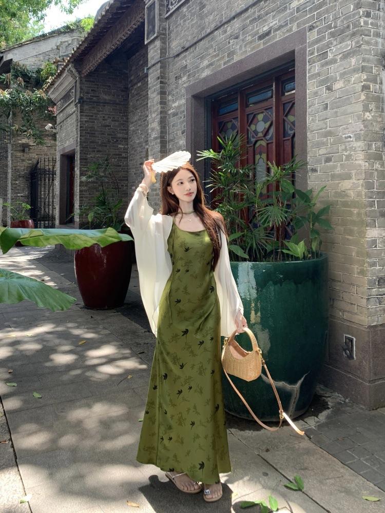 Nuevo Vestido Verde de Tirantes Espagueti Estilo Chino para Mujer Verano 2025 Nuevo Temperamento de Alta Gama Conjunto de Dos Piezas Vestido Largo