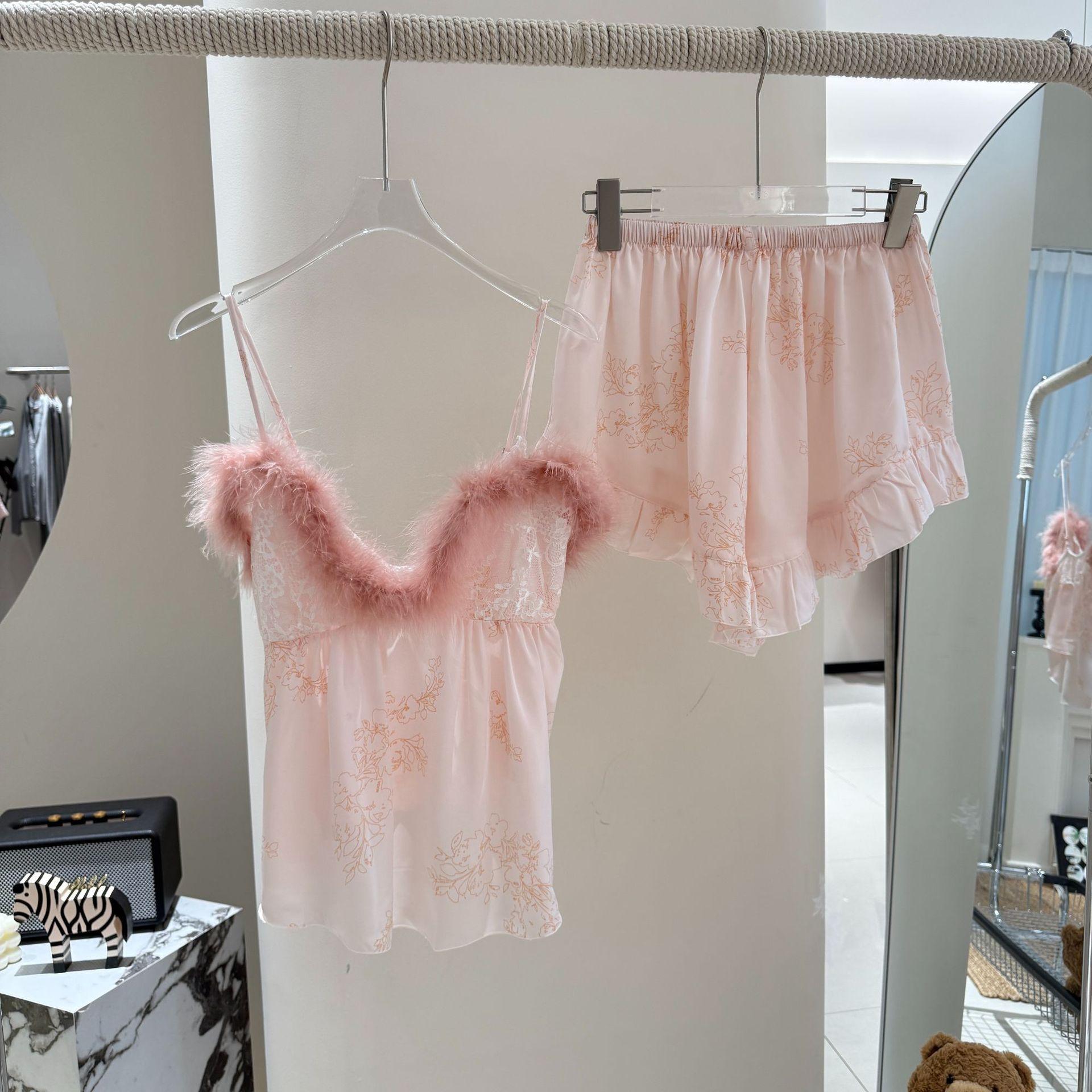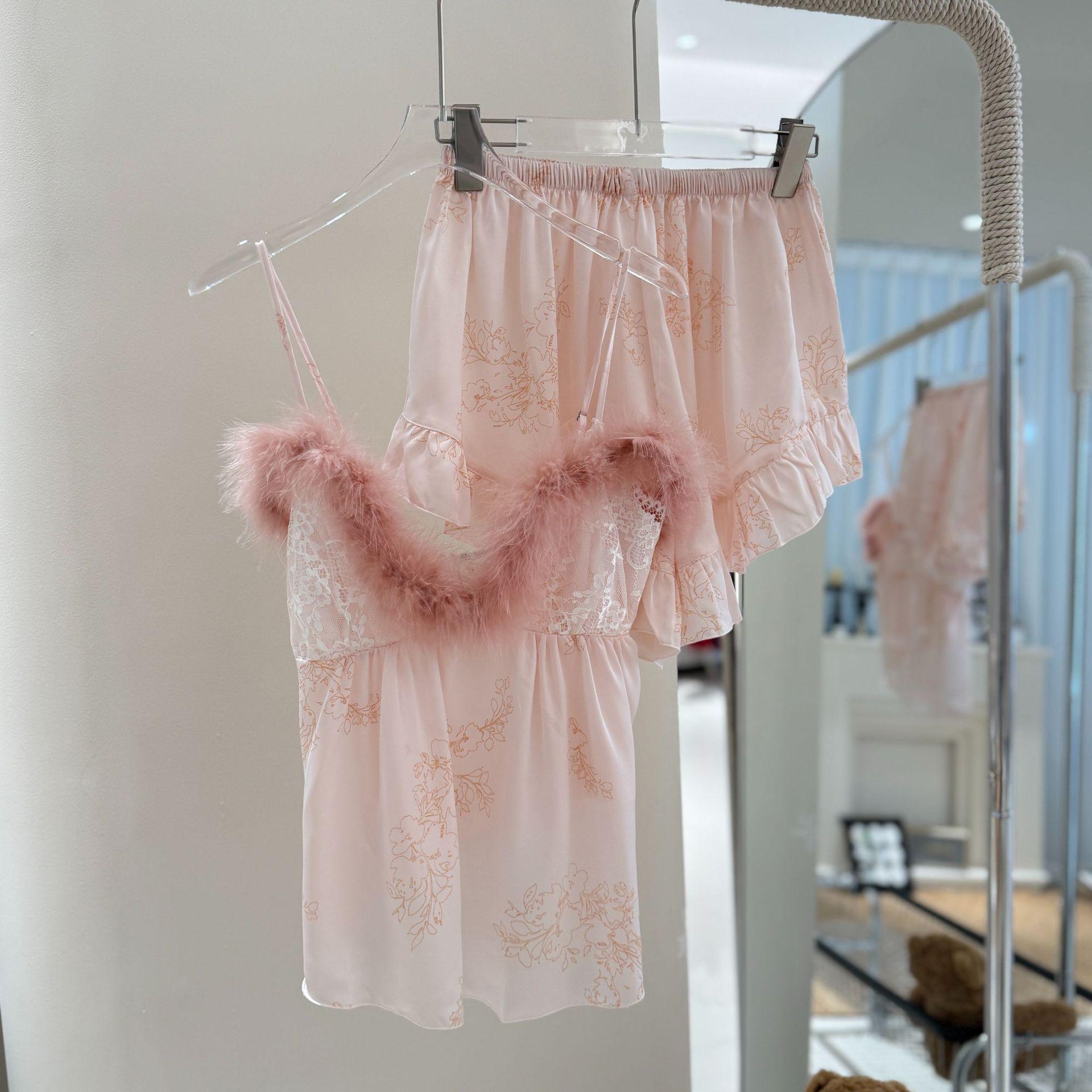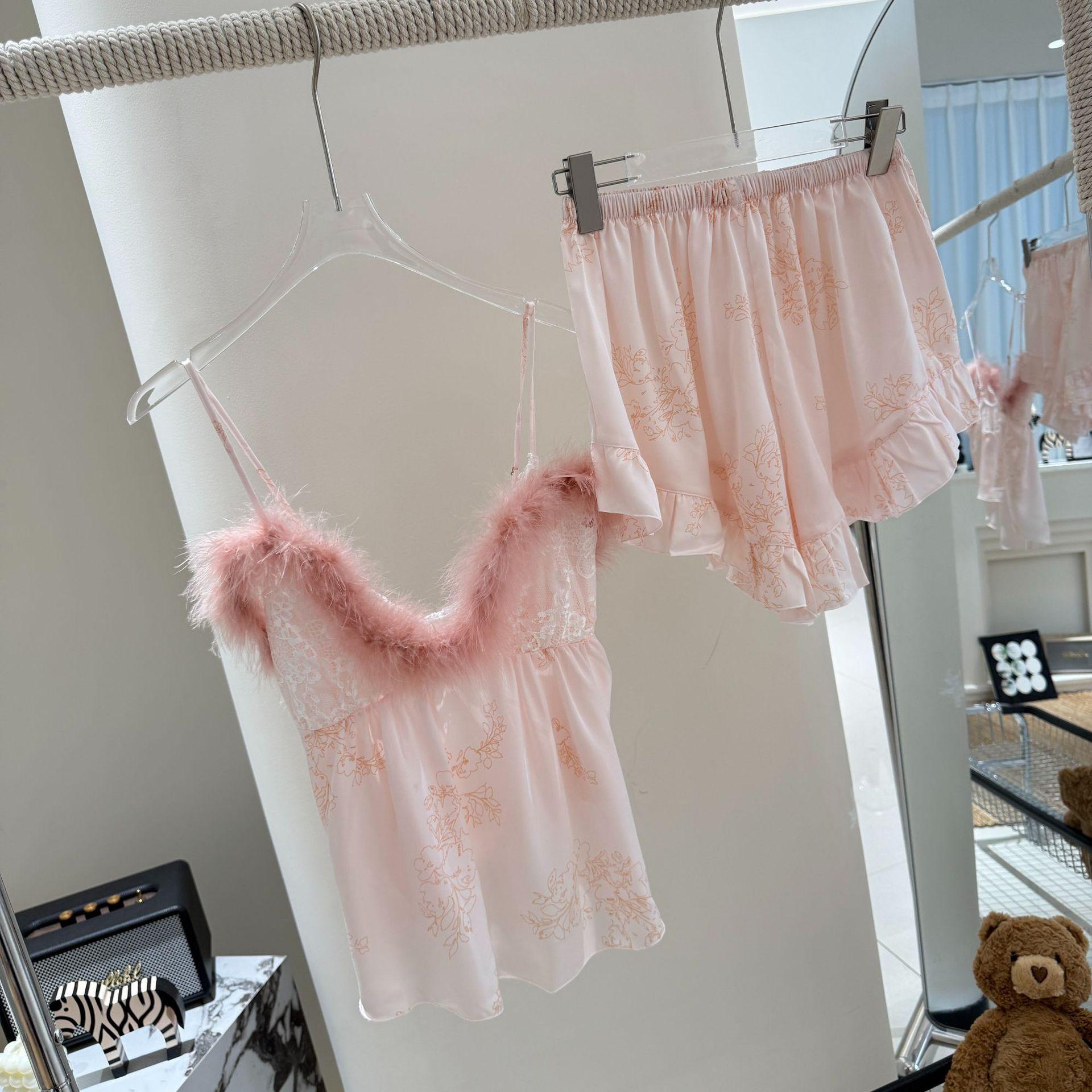 Pijama Rosa para Mujer Verano Seda de Hielo Tirantes Shorts Traje Sexy Peludo Delgado Seda Estilo Femenino Ropa para el Hogar