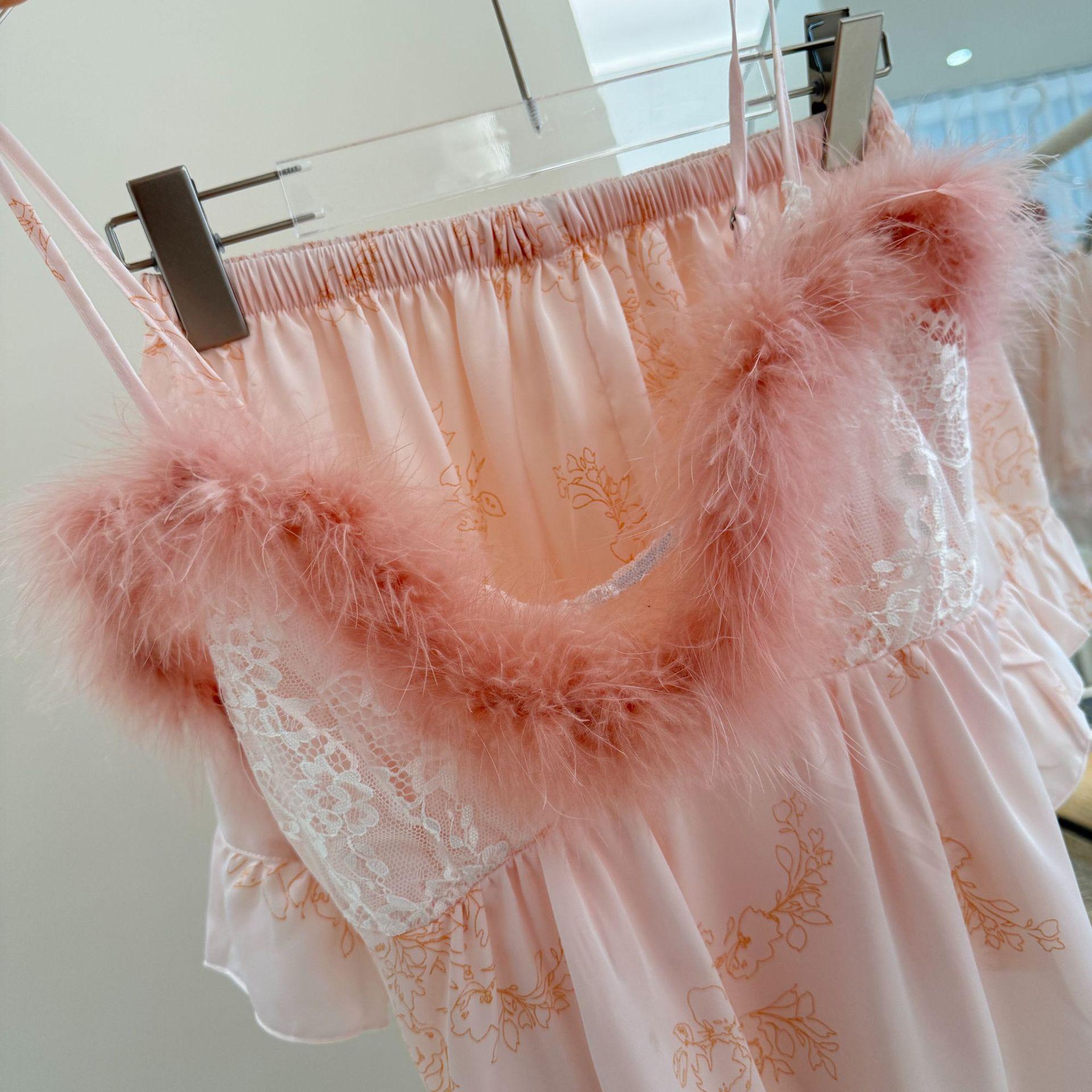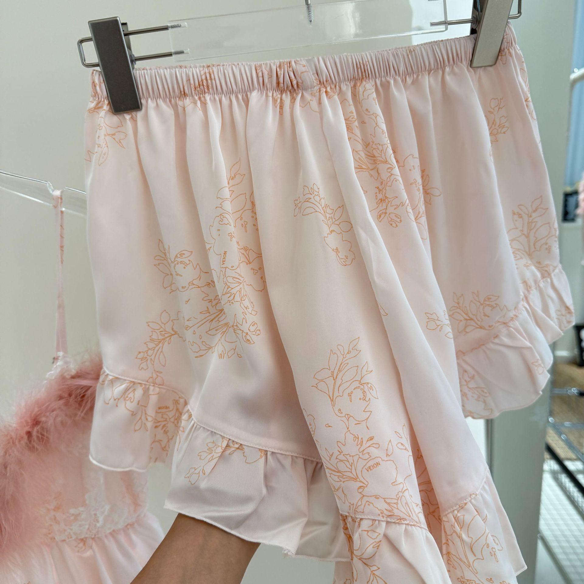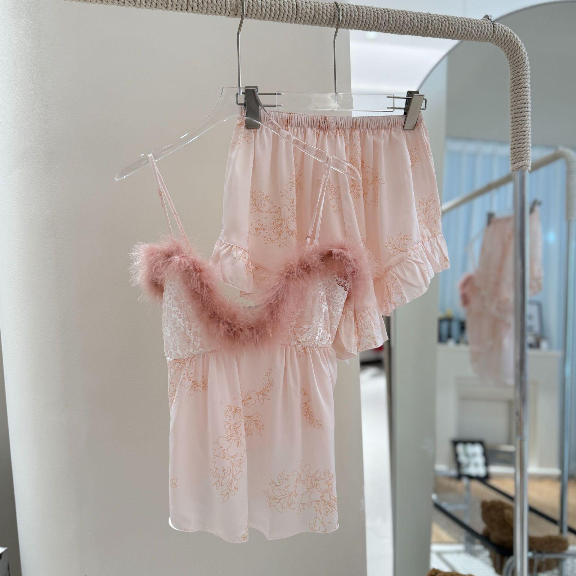 Pijama Rosa para Mujer Verano Seda de Hielo Tirantes Shorts Traje Sexy Peludo Delgado Seda Estilo Femenino Ropa para el Hogar