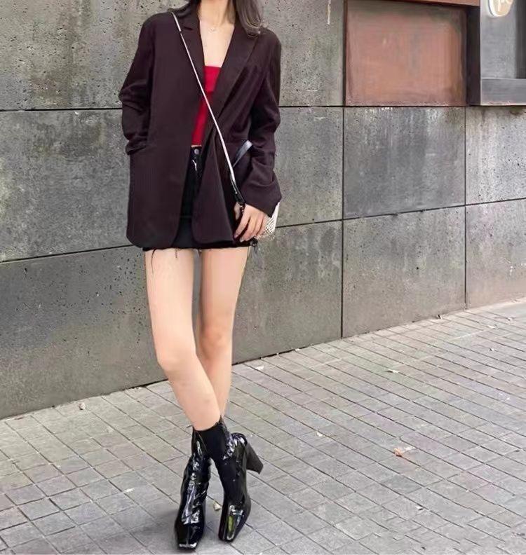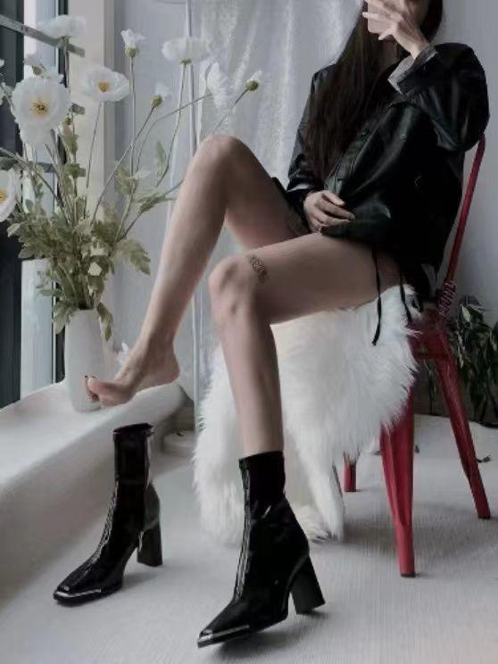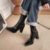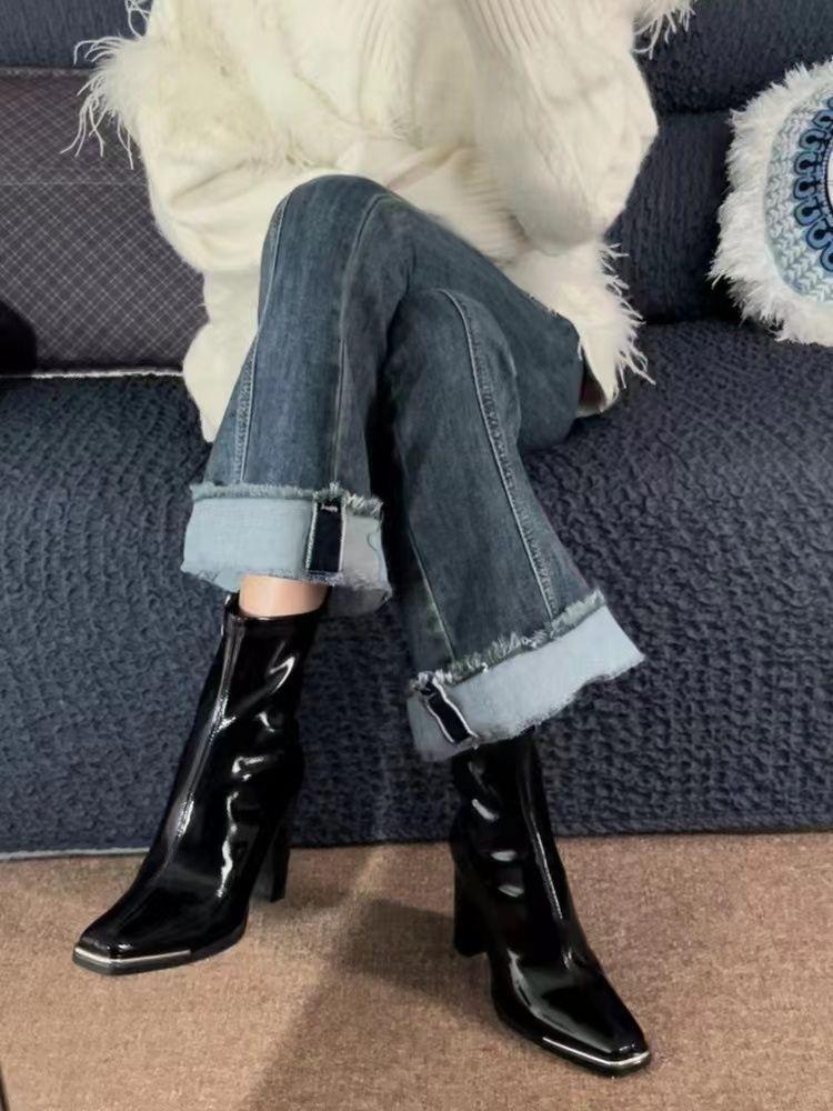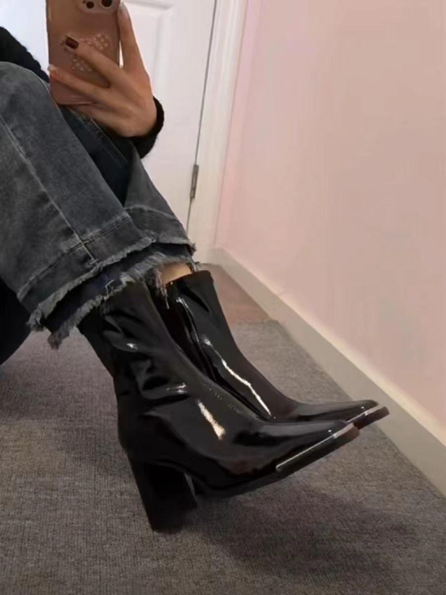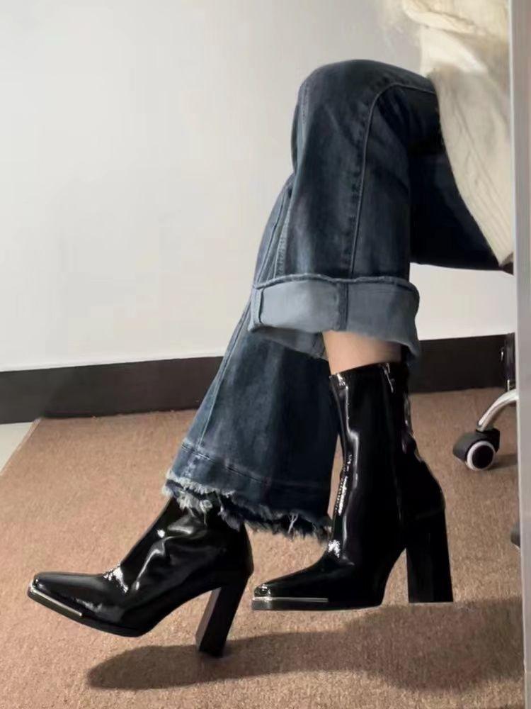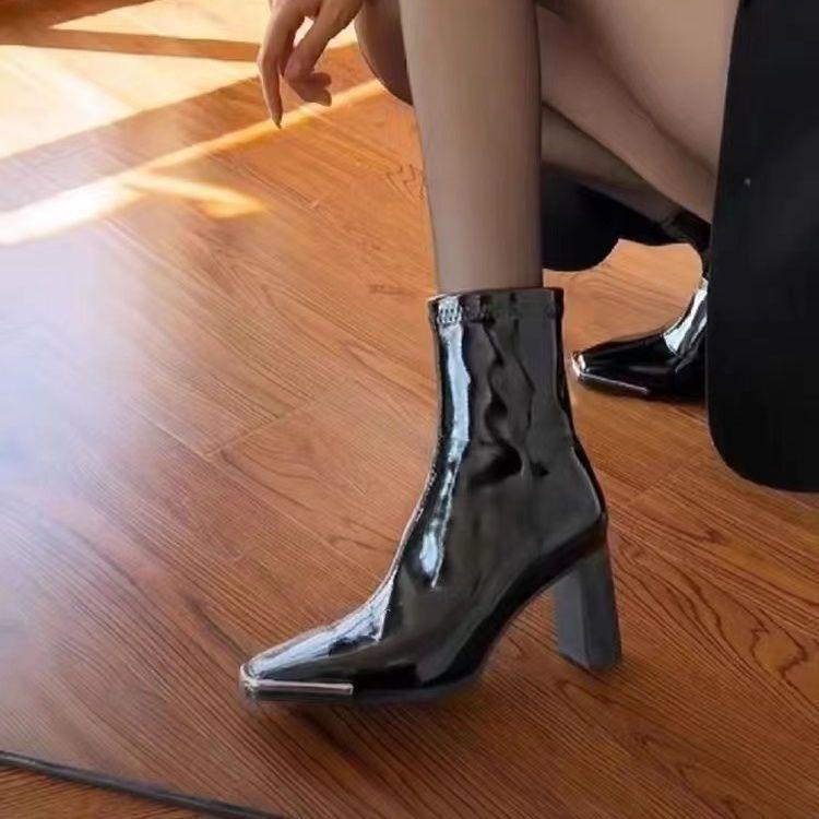 Botas Skinny de Tacón Alto Botas de Media Caña de Tacón Grueso Botas de Tobillo de Punta Cuadrada de Cuero Patentado Versátiles de Moda Nueva para Otoño/Invierno 2025 para Mujer