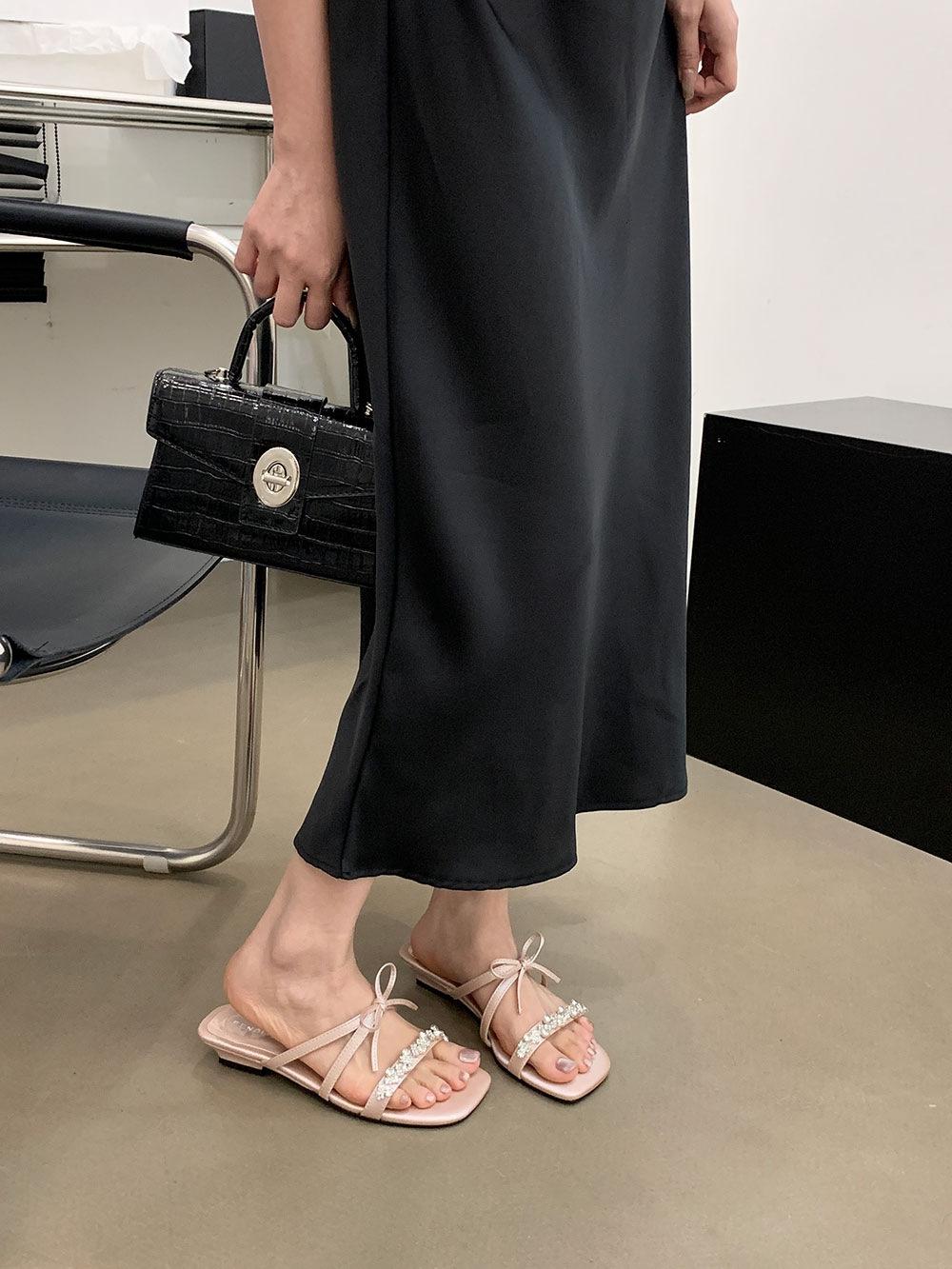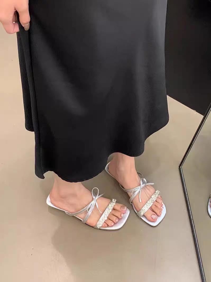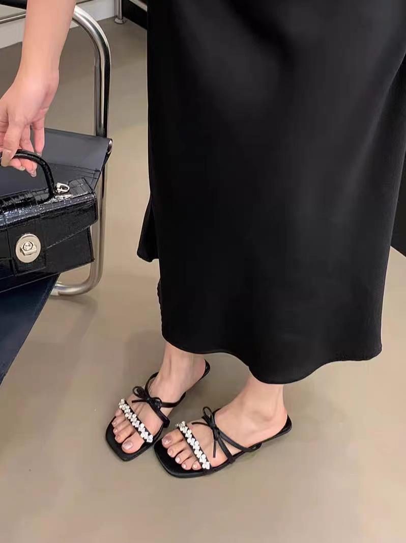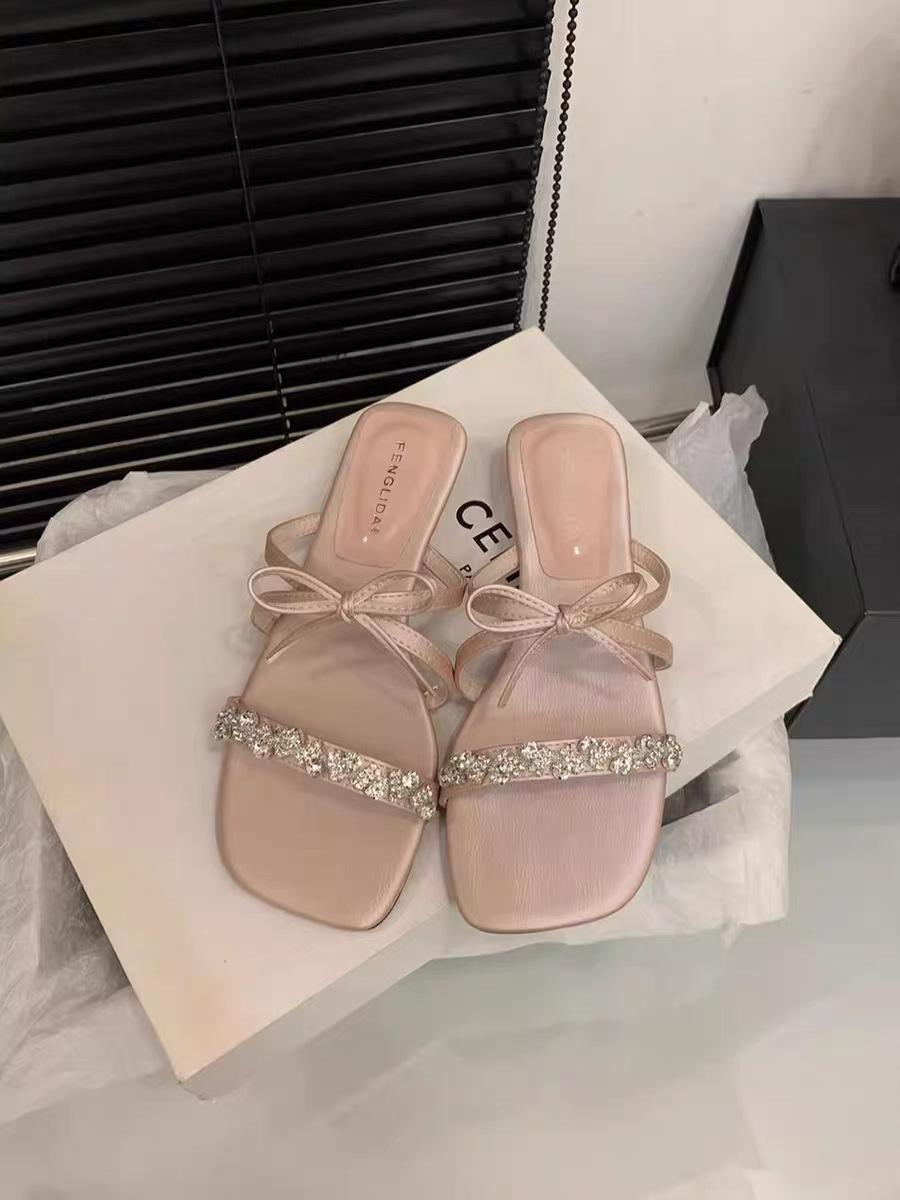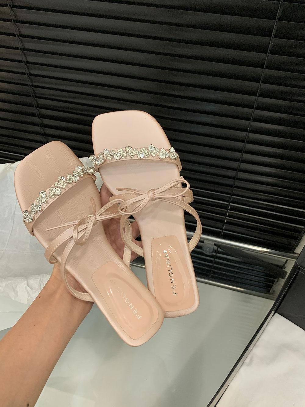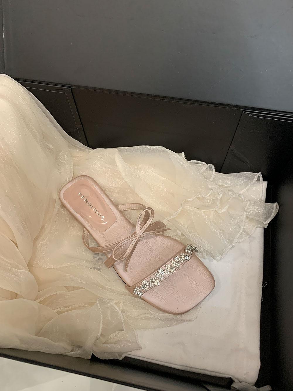 Pantuflas Francesas de Tacón Plano con Pedrería Zapatos de Hada para Exterior Verano 2025 Rosa Falda Lazo Sandalias