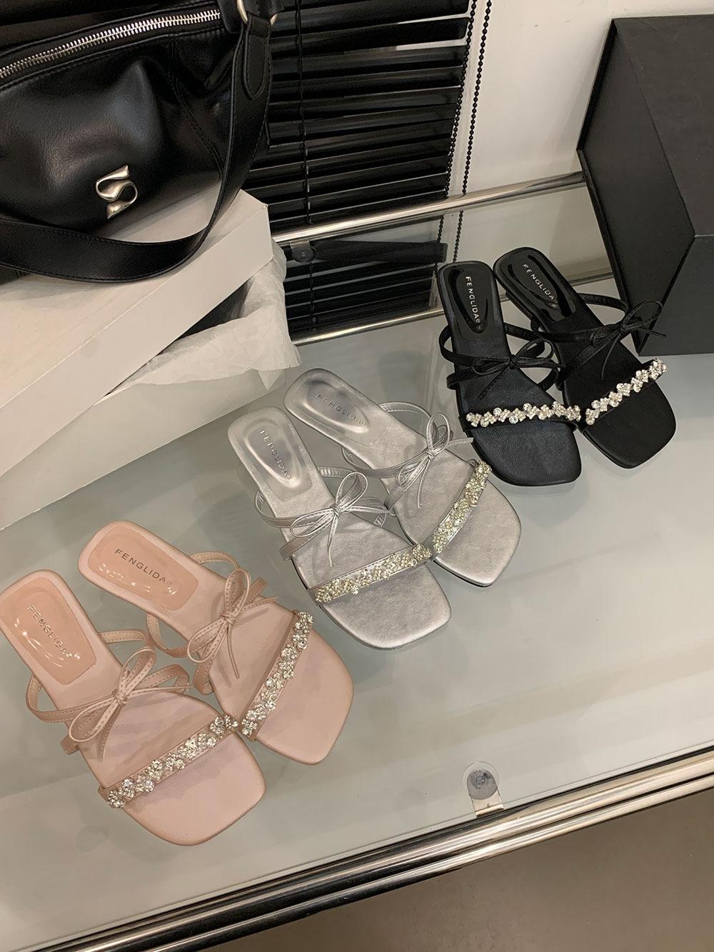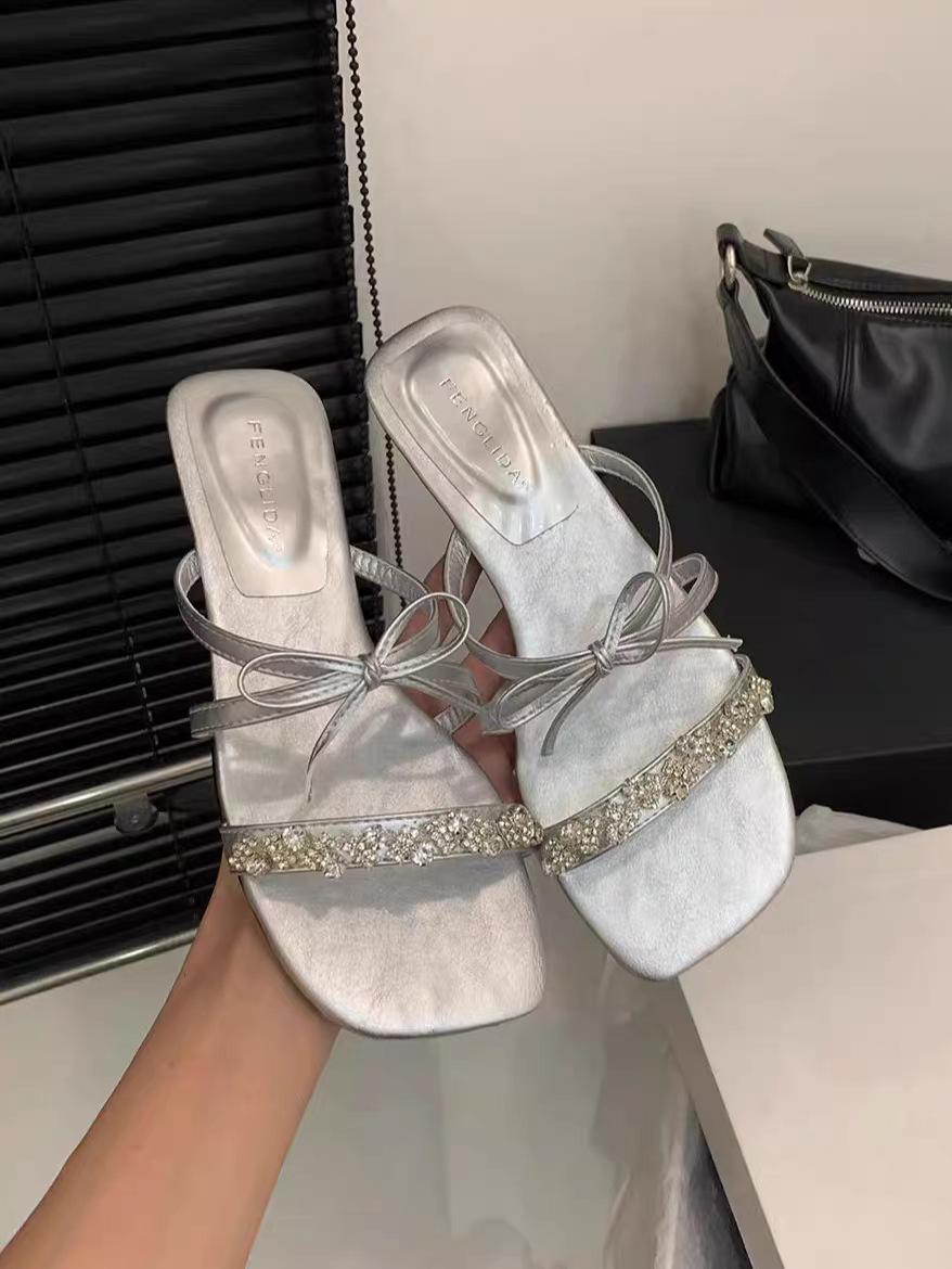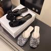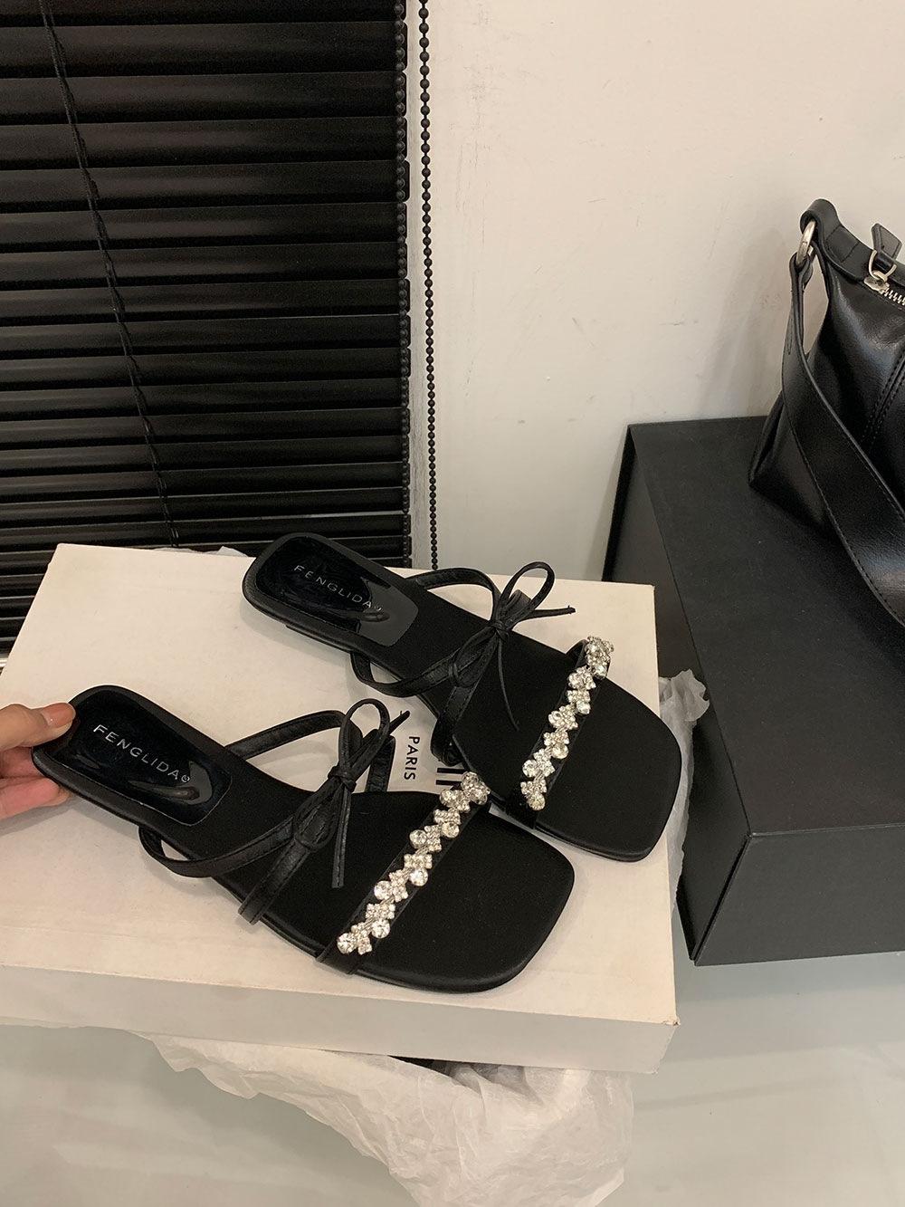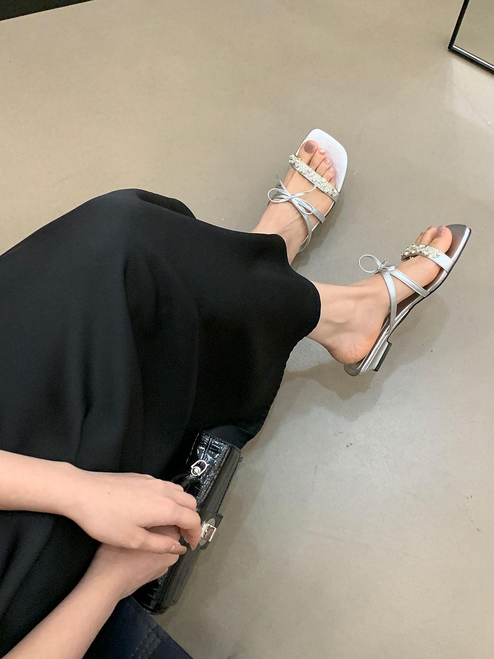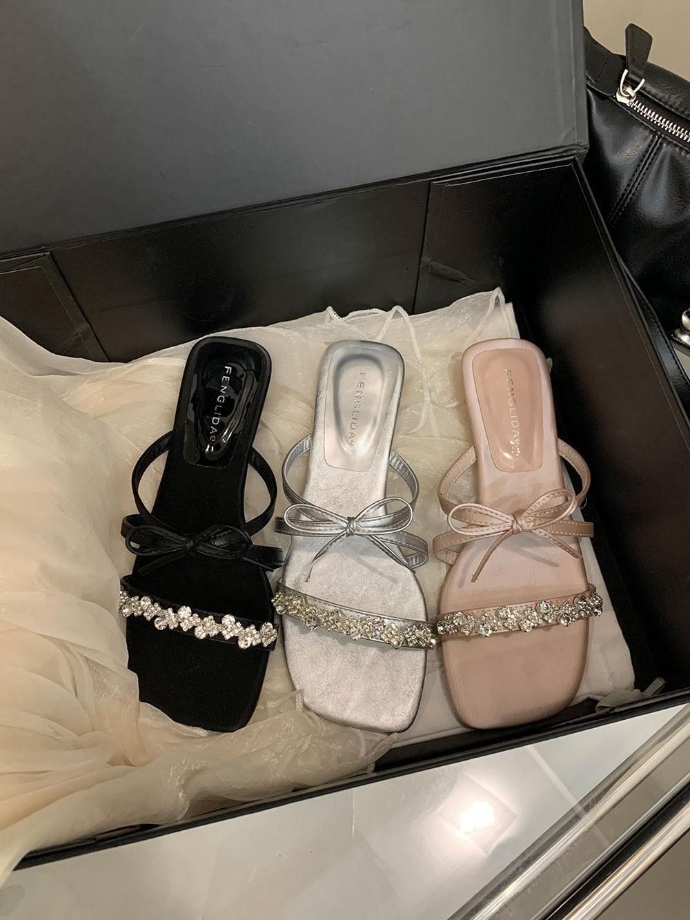 Pantuflas Francesas de Tacón Plano con Pedrería Zapatos de Hada para Exterior Verano 2025 Rosa Falda Lazo Sandalias