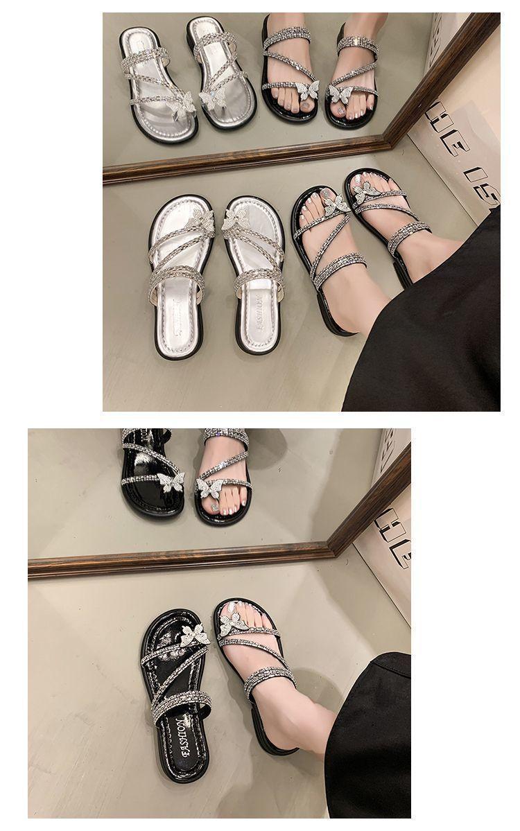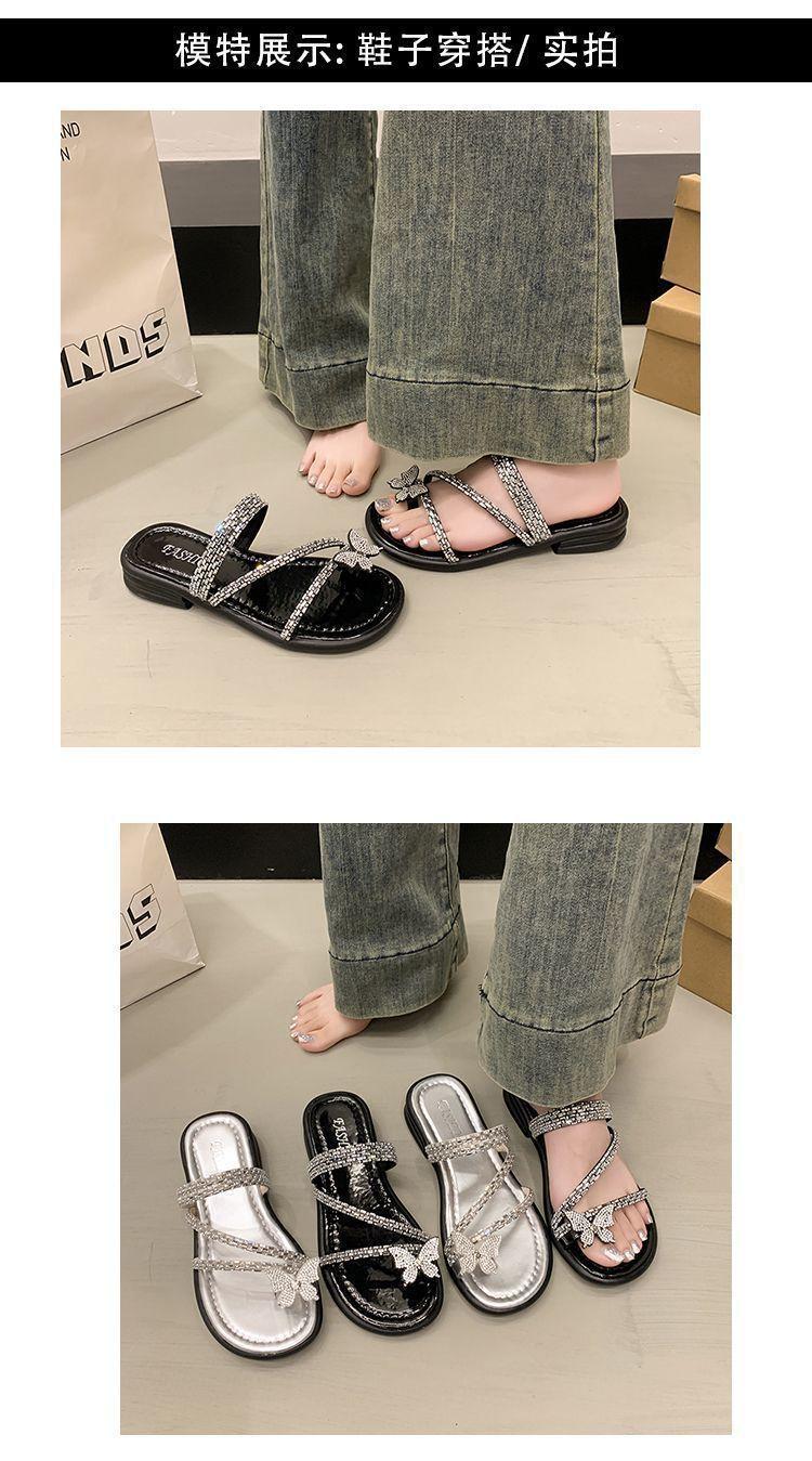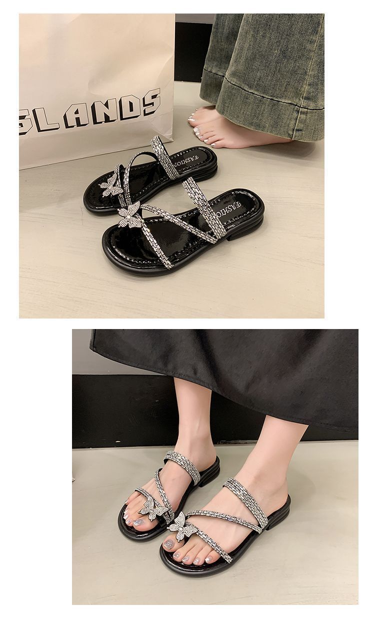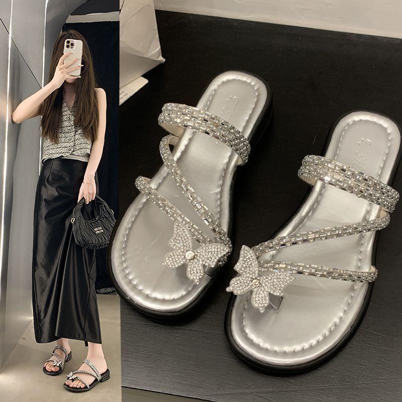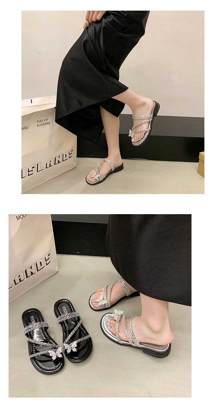 Anillo de Dedo Mariposa de Pedrería Plana Exquisitas Pantuflas Mujer 2025 Nuevo Dos Usos Pantuflas de Playa Mujer Verano para Salir