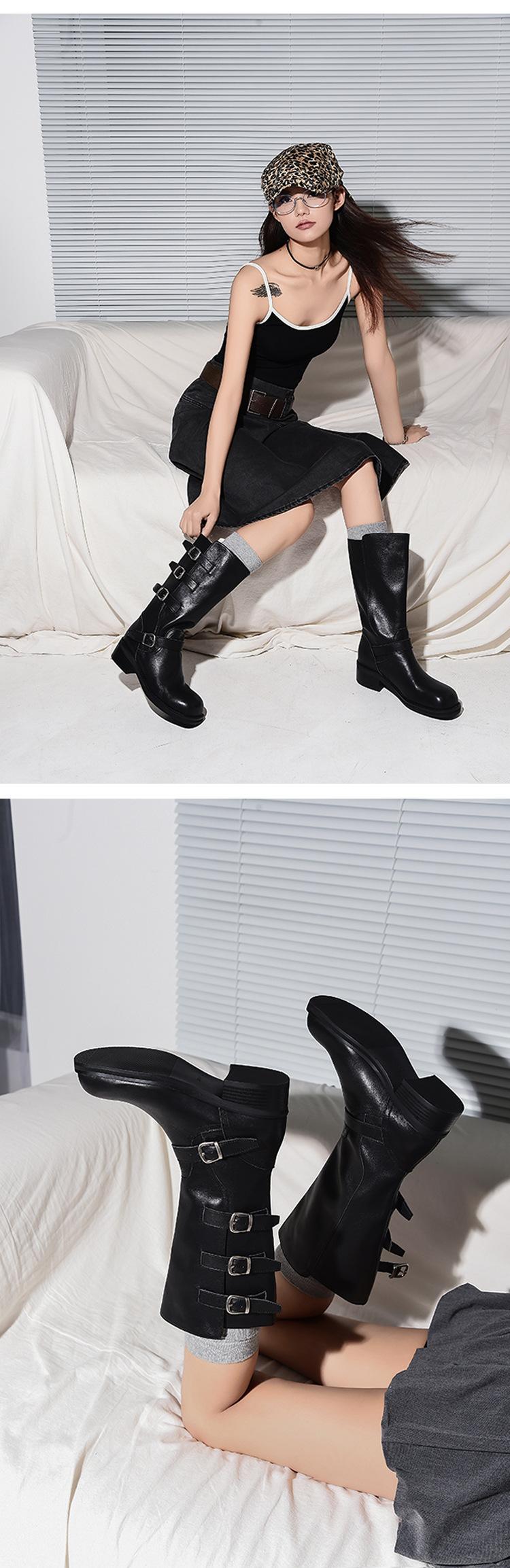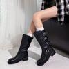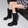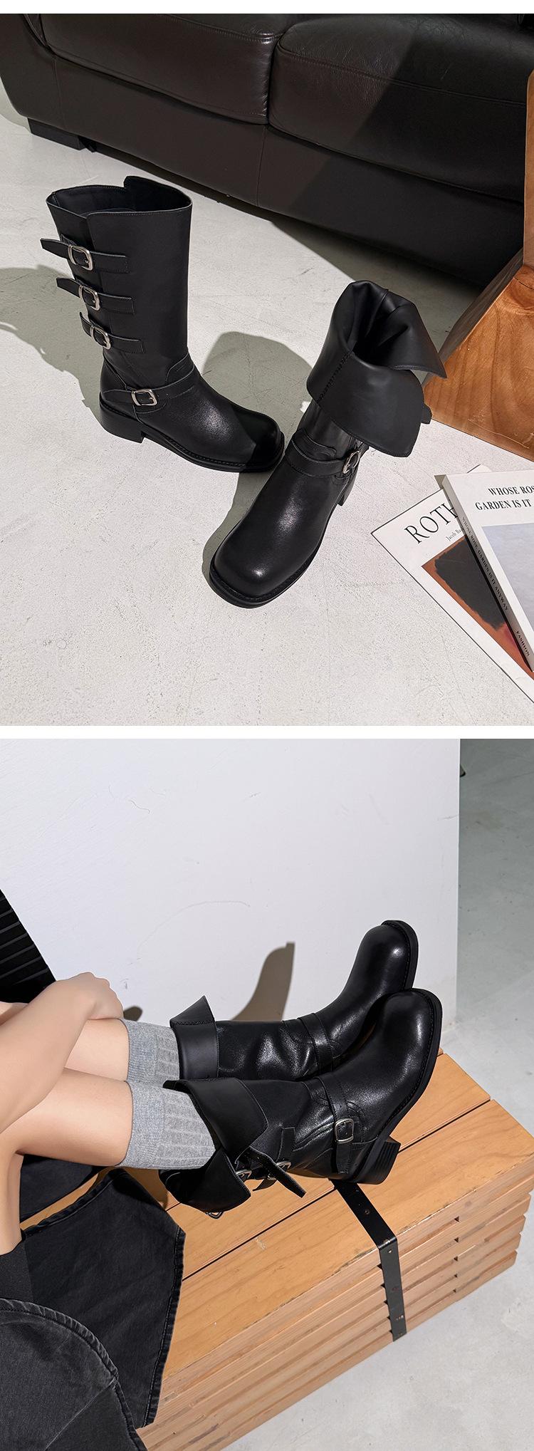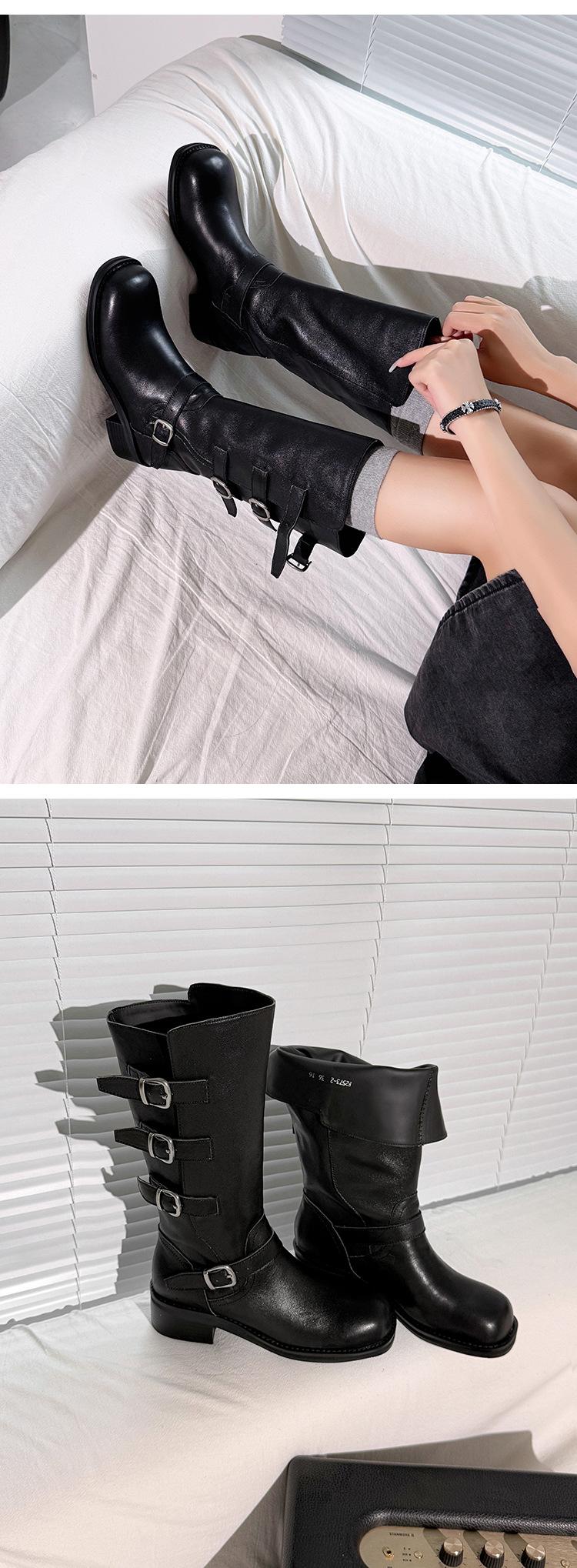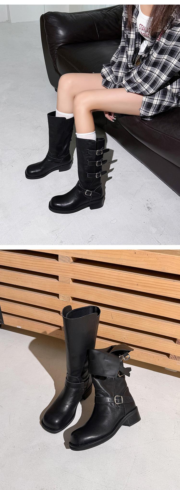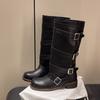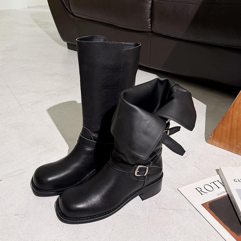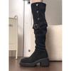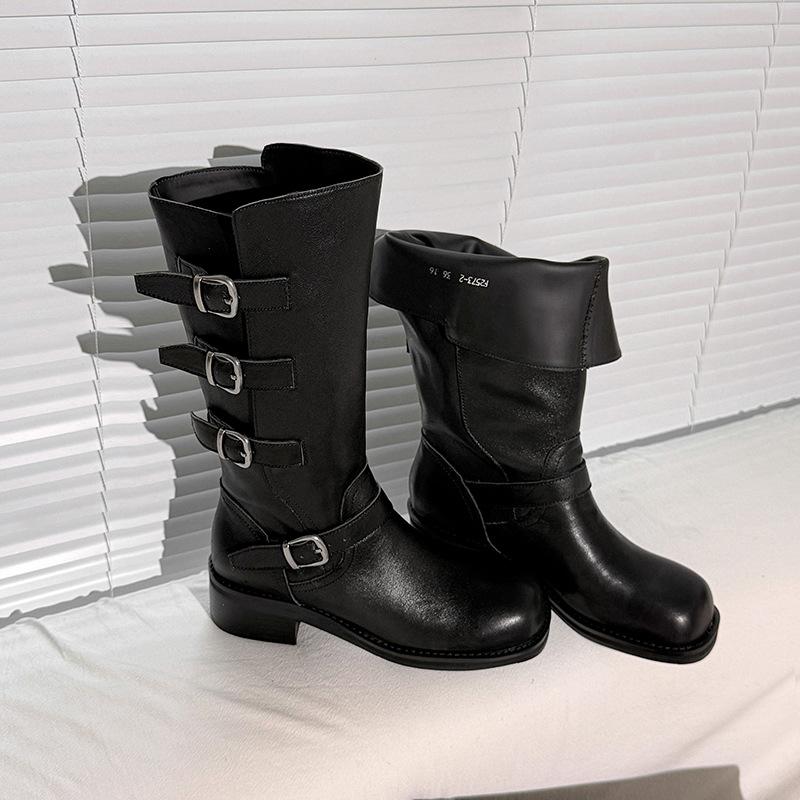 2025 Nuevas Botas Altas de Caballero Oscuro de Otoño e Invierno para Mujer, Cuero Completo Tacón Medio Hebilla de Cinturón Dos Usos Botas Dulces y Geniales por Encima de la Rodilla