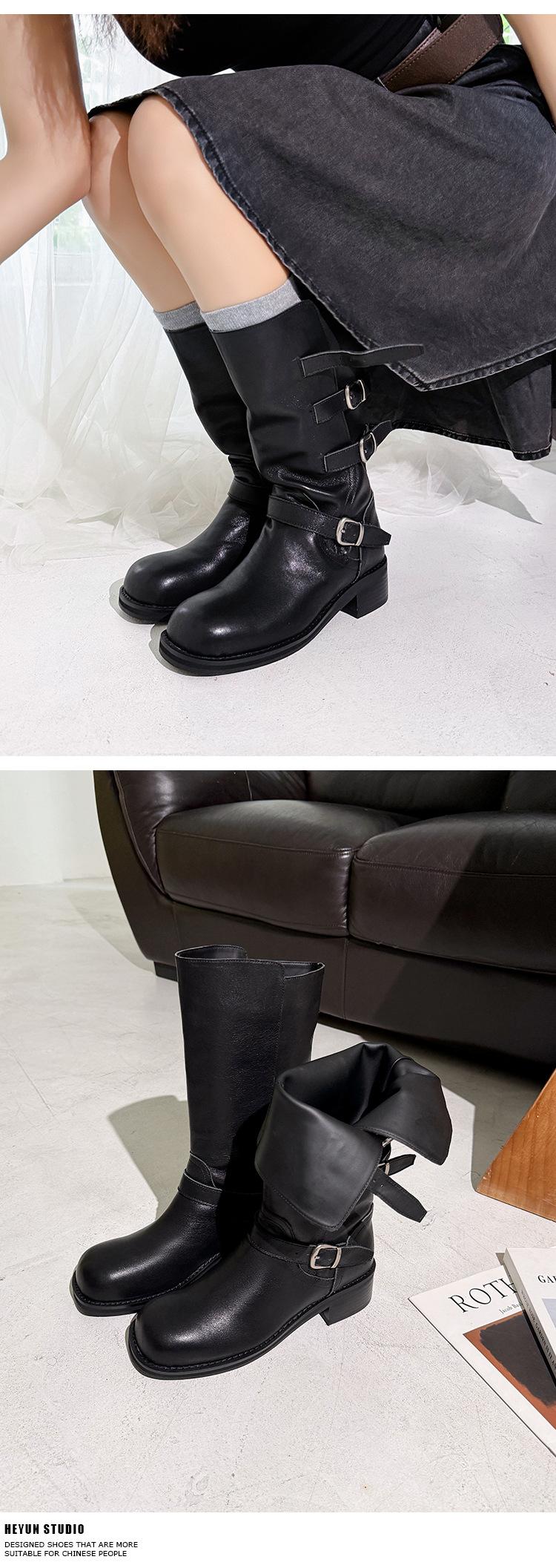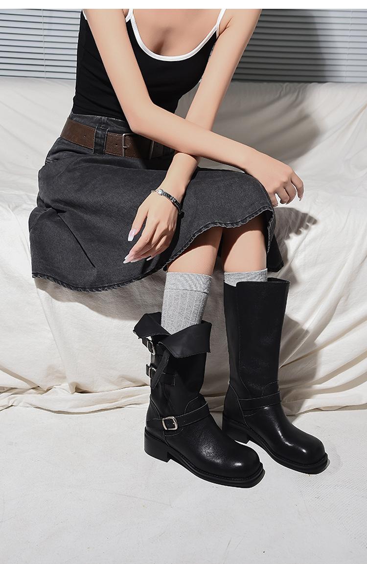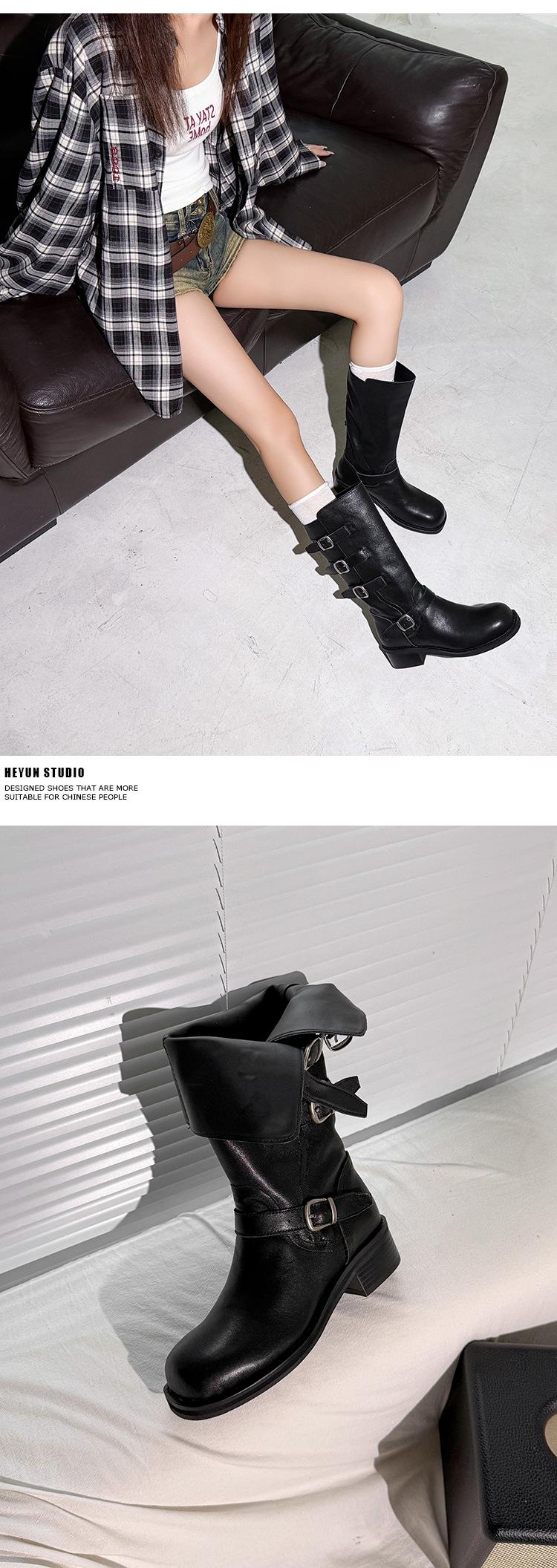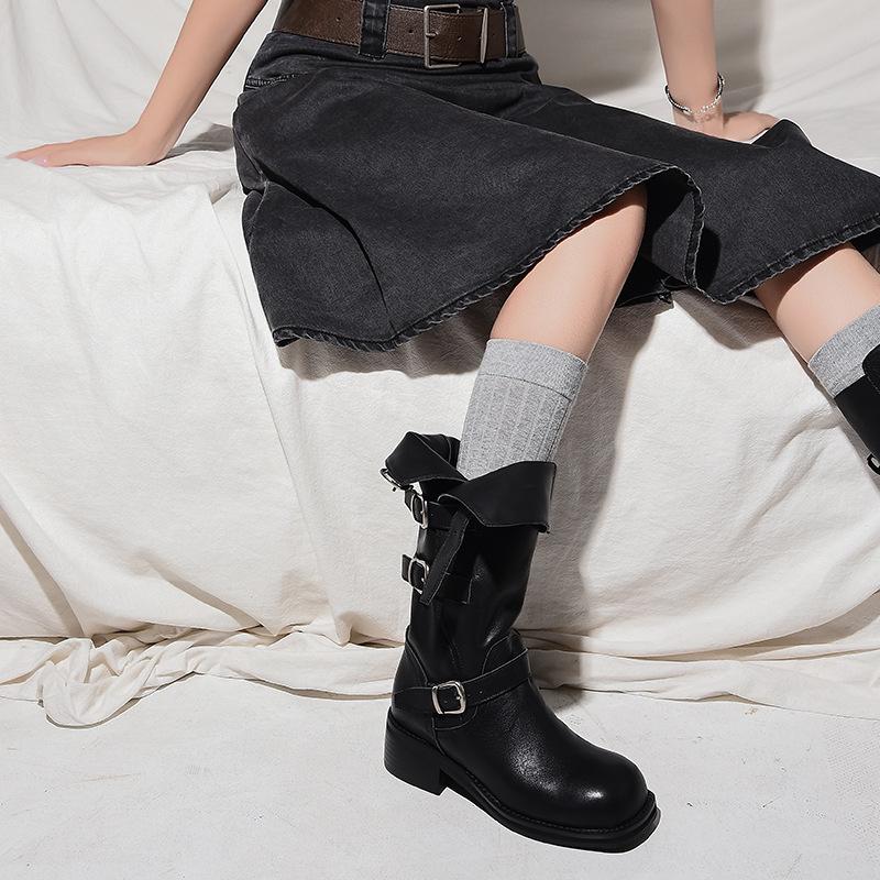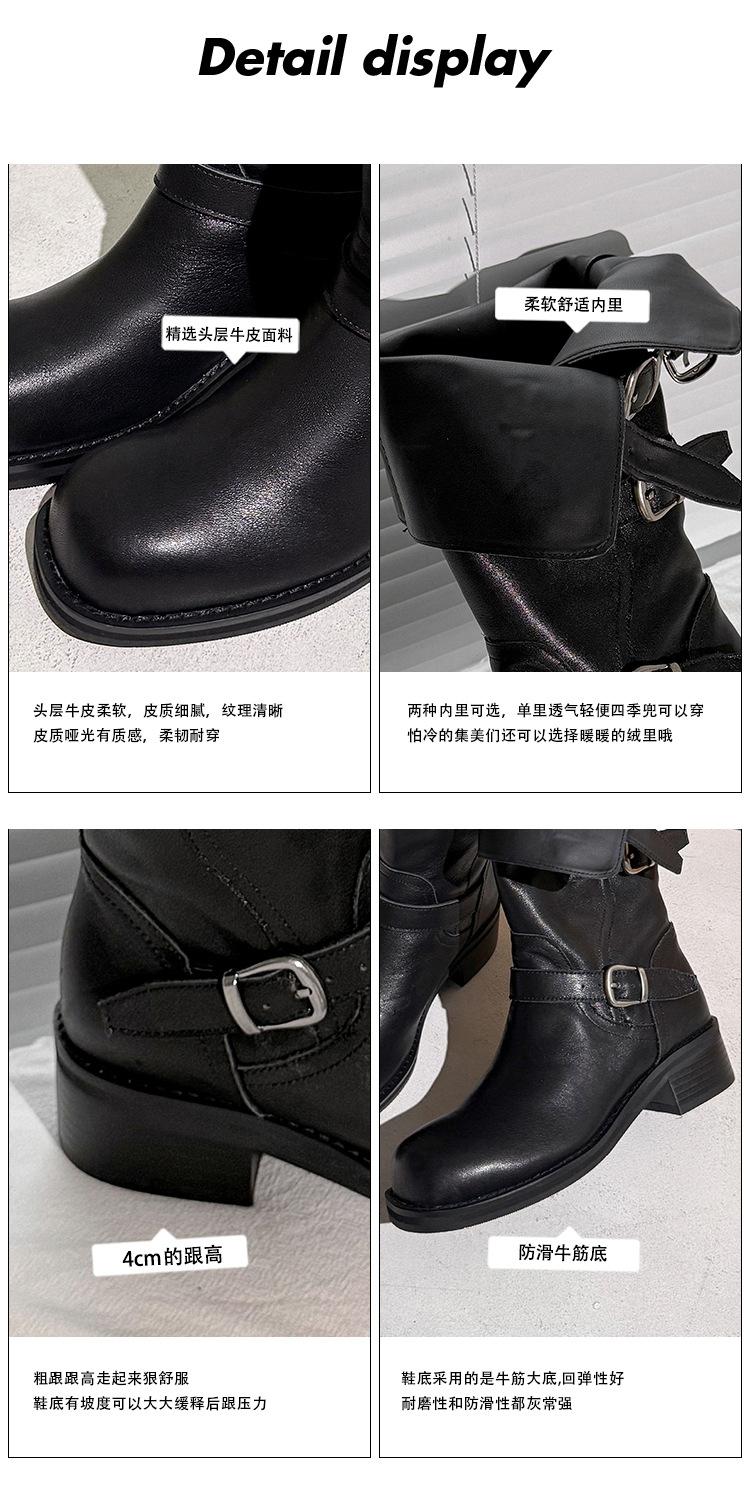 2025 Nuevas Botas Altas de Caballero Oscuro de Otoño e Invierno para Mujer, Cuero Completo Tacón Medio Hebilla de Cinturón Dos Usos Botas Dulces y Geniales por Encima de la Rodilla