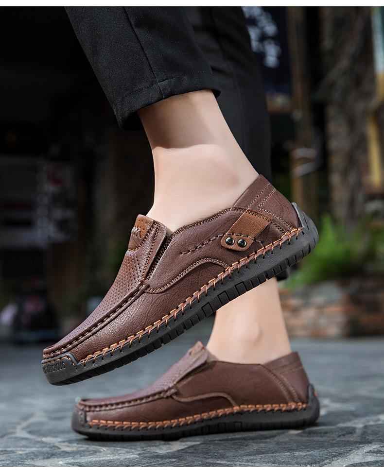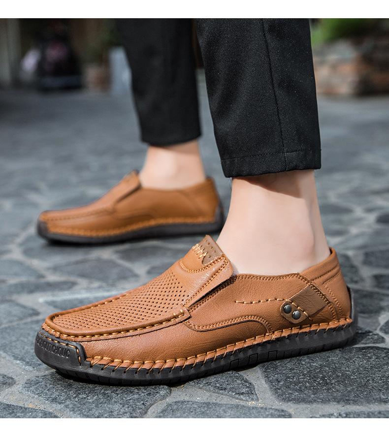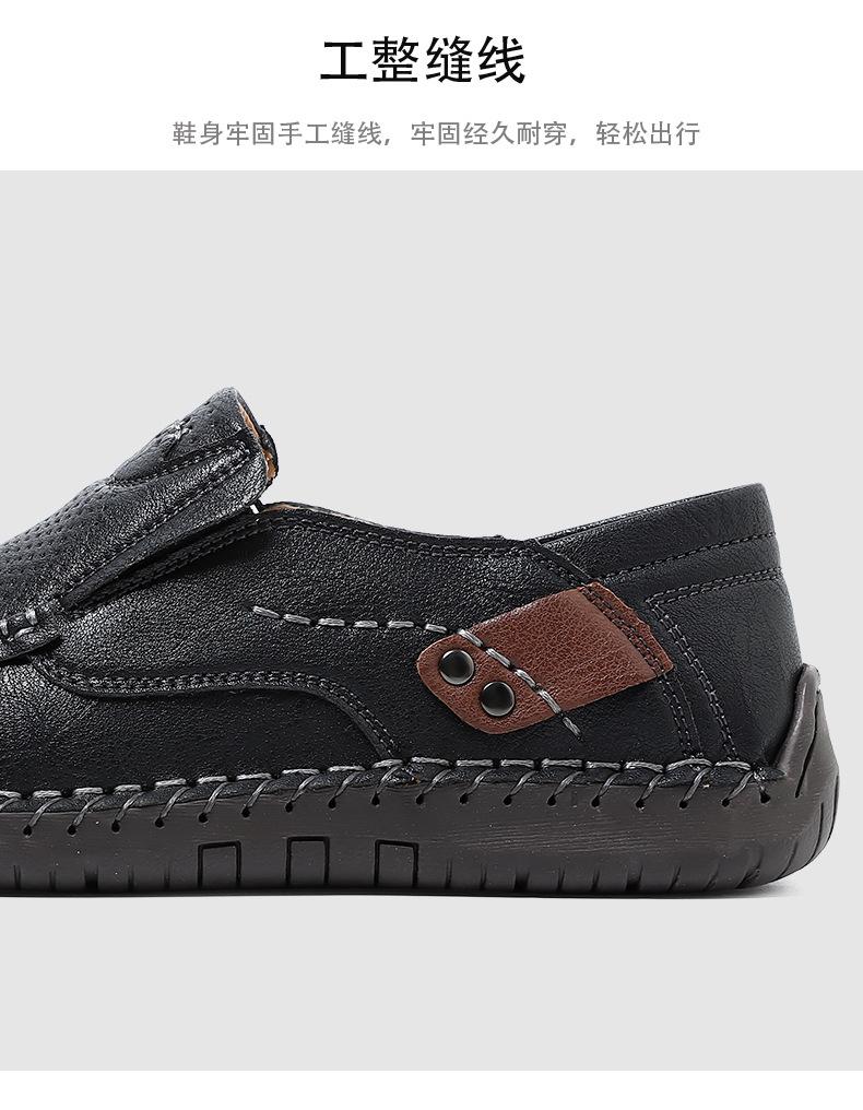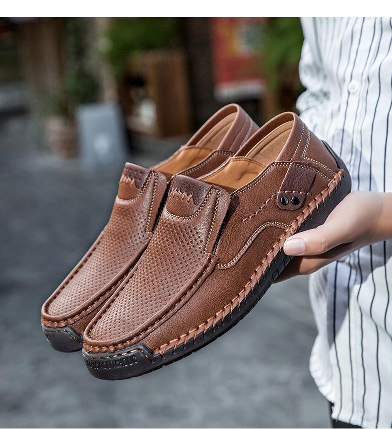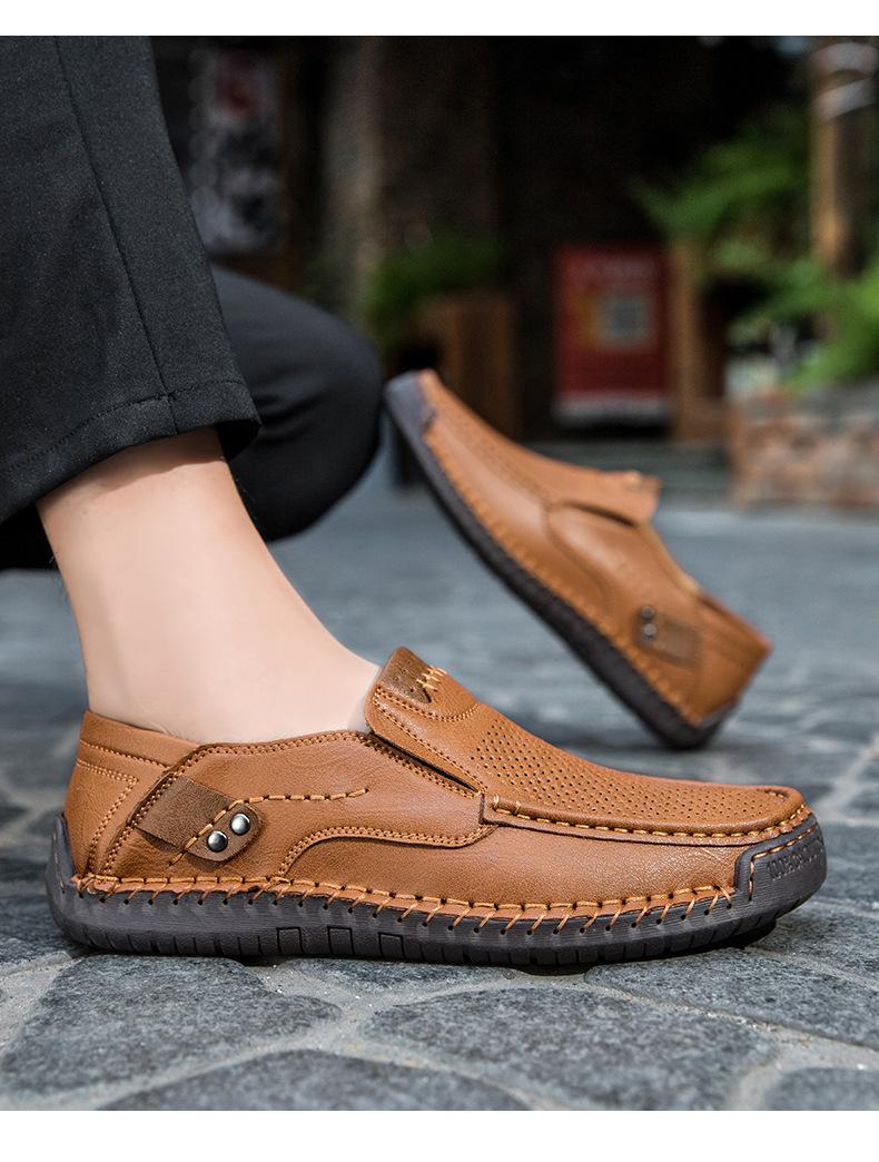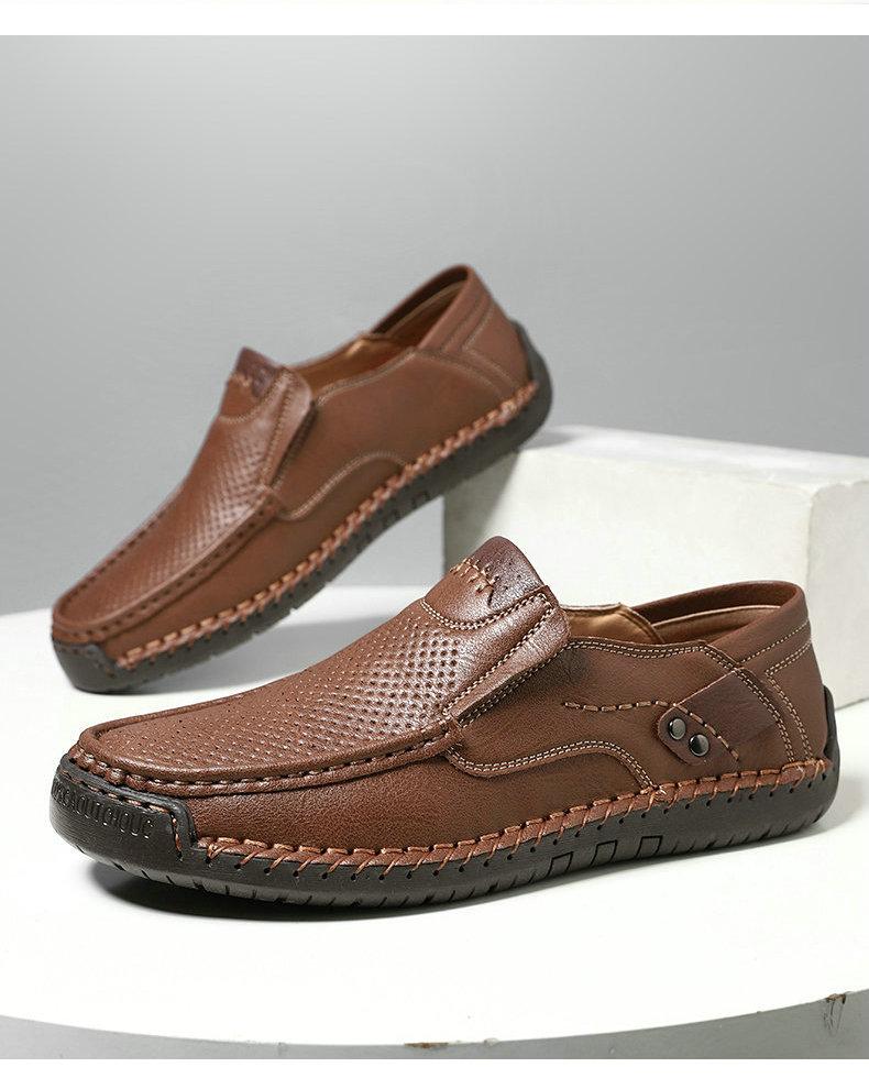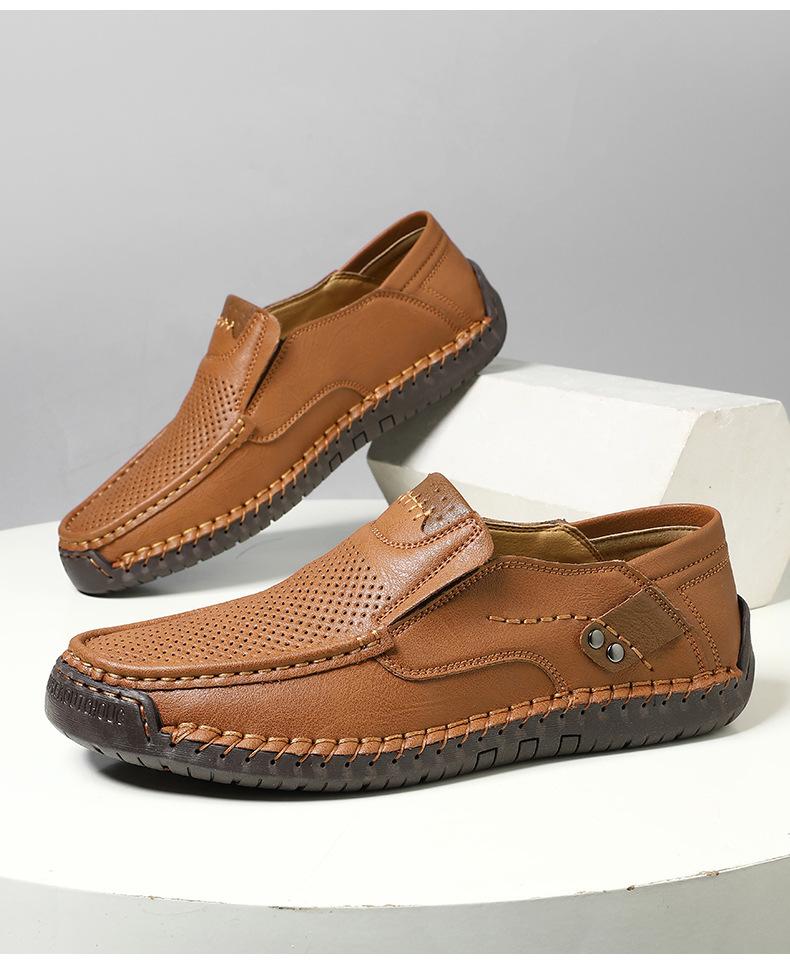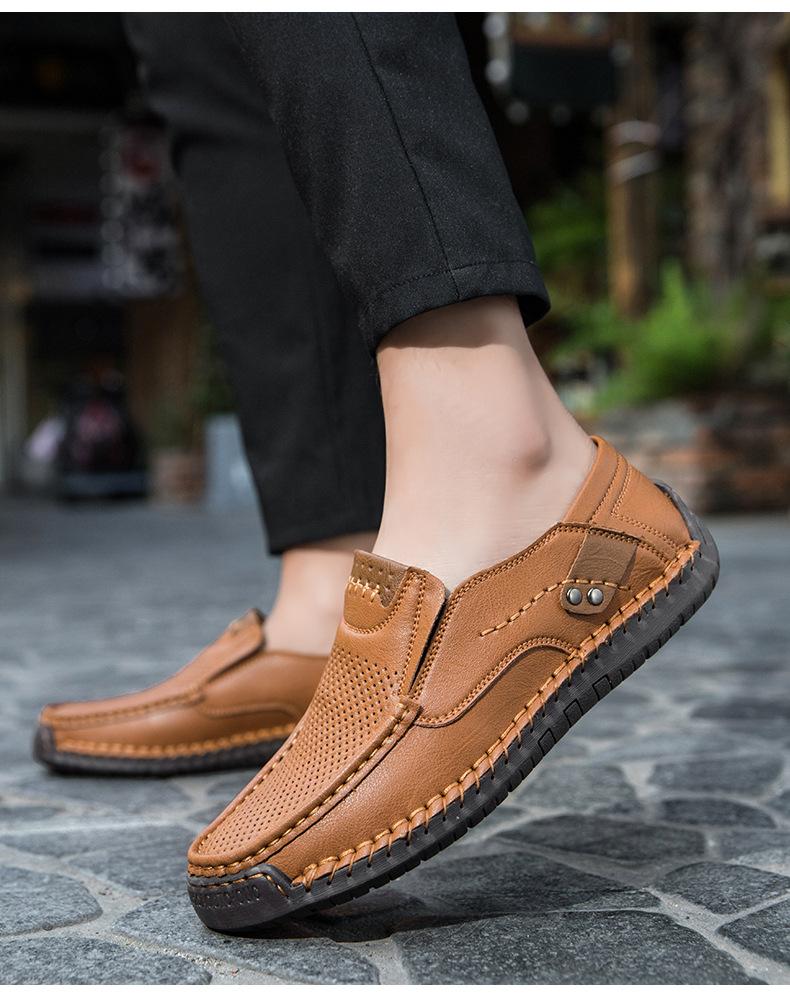 Zapatos de hombre huecos cosidos a mano, zapatos casuales para exteriores, zapatos planos de cuero sin cordones, mocasines cruzados de talla grande y caña baja