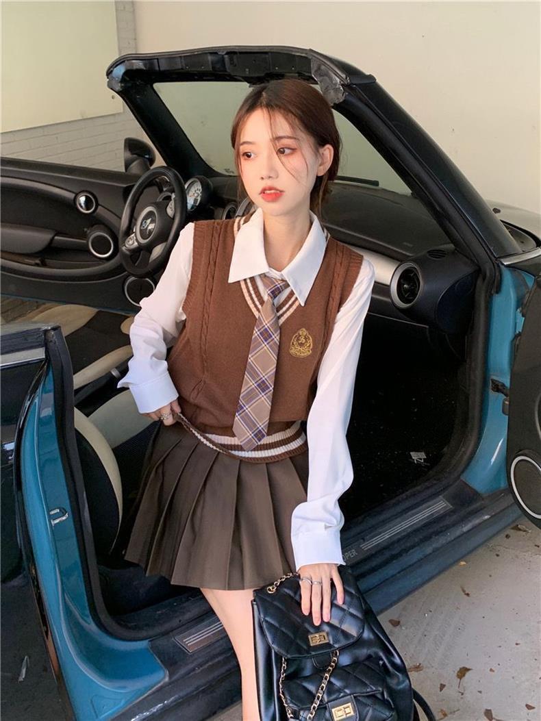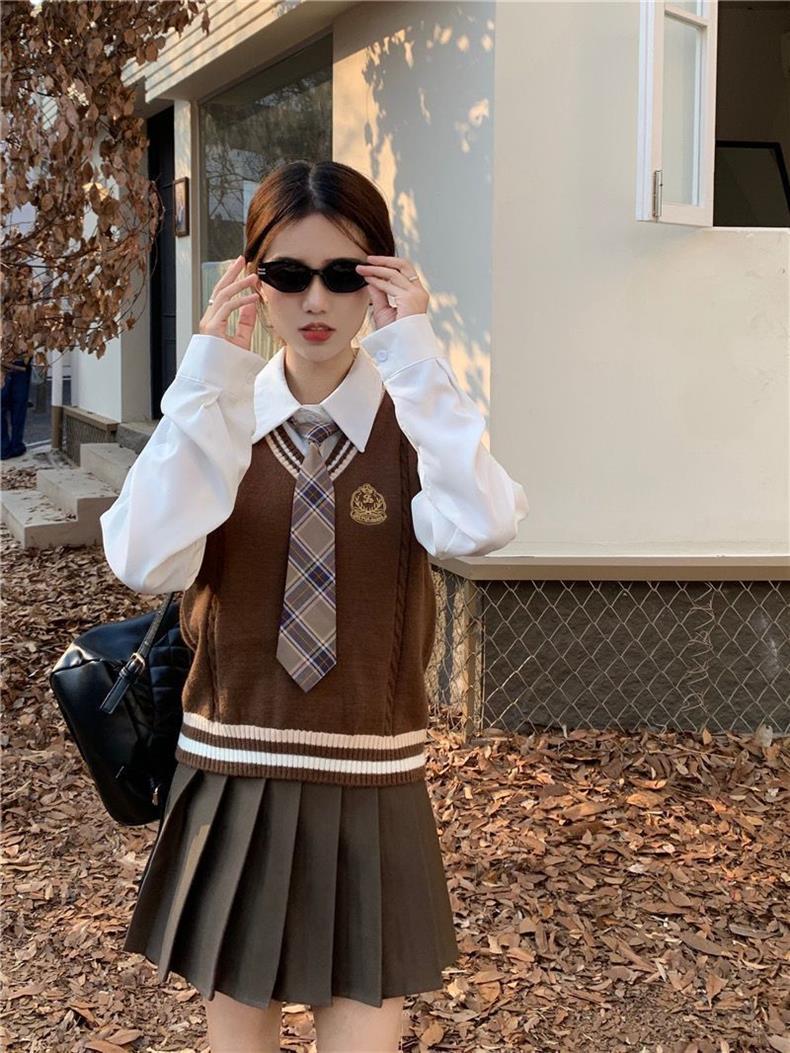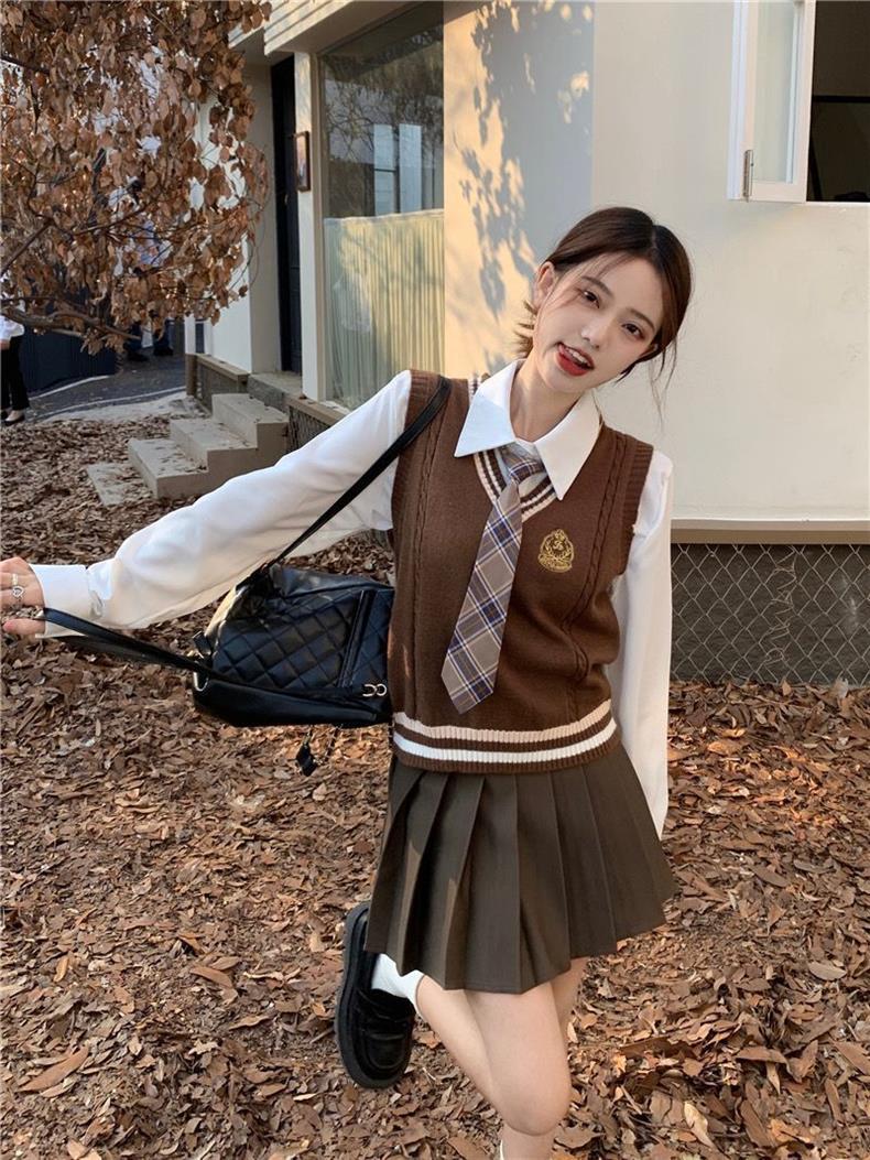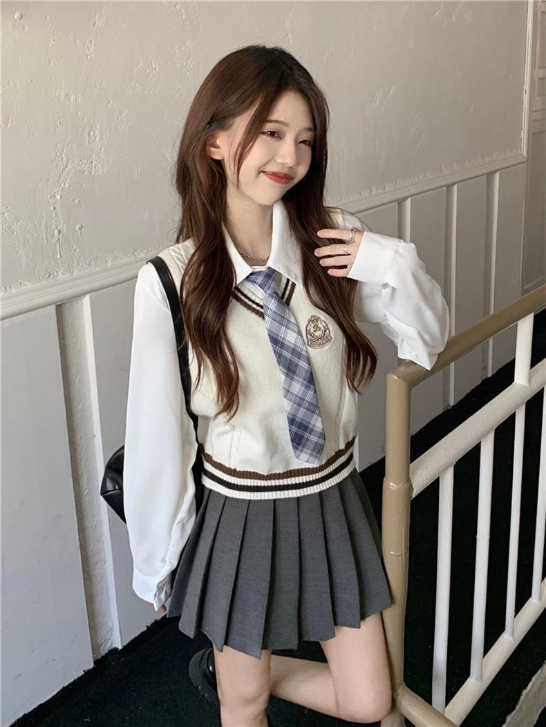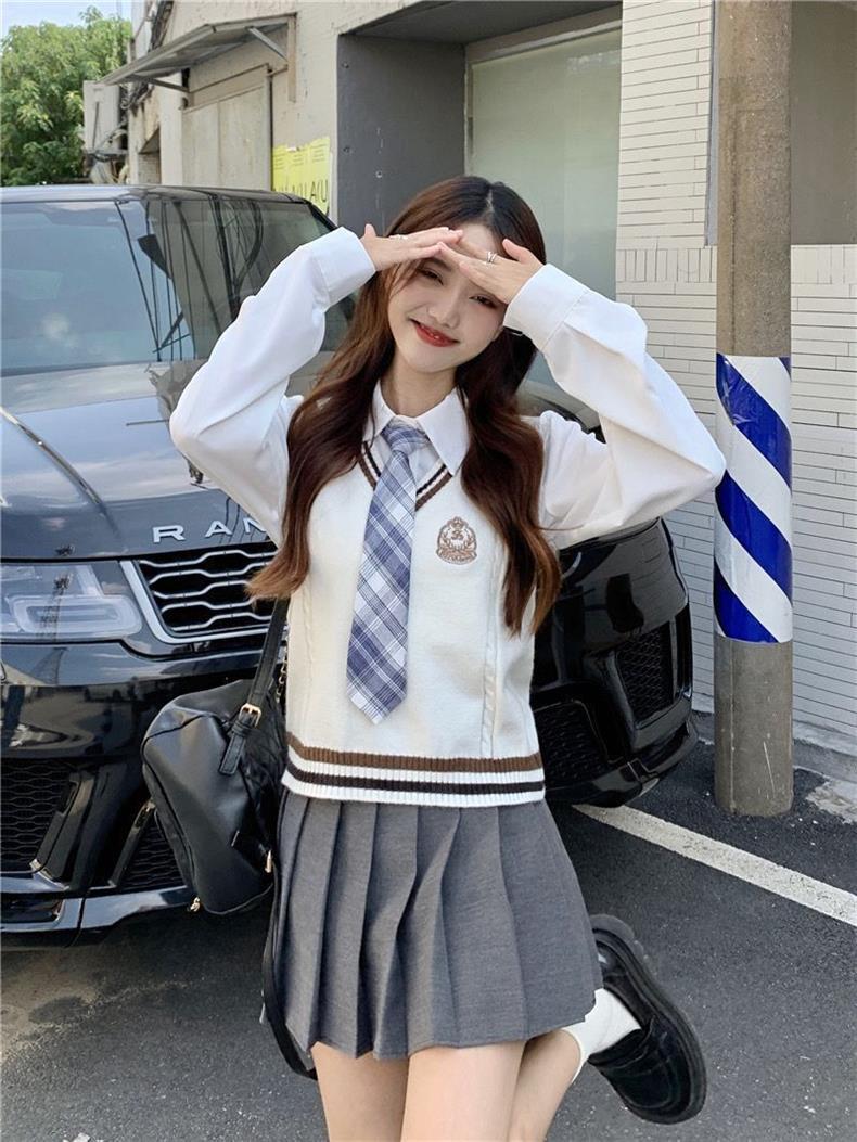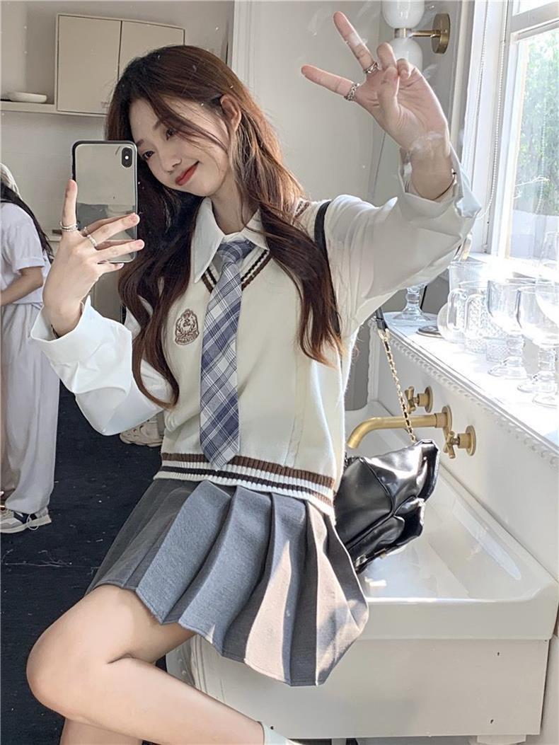 Traje de uniforme jk americano falda estilo universitario para mujer otoño que reduce la edad chaleco de punto camisa falda plisada traje de tres piezas
