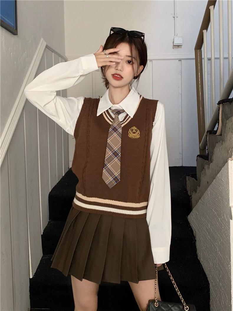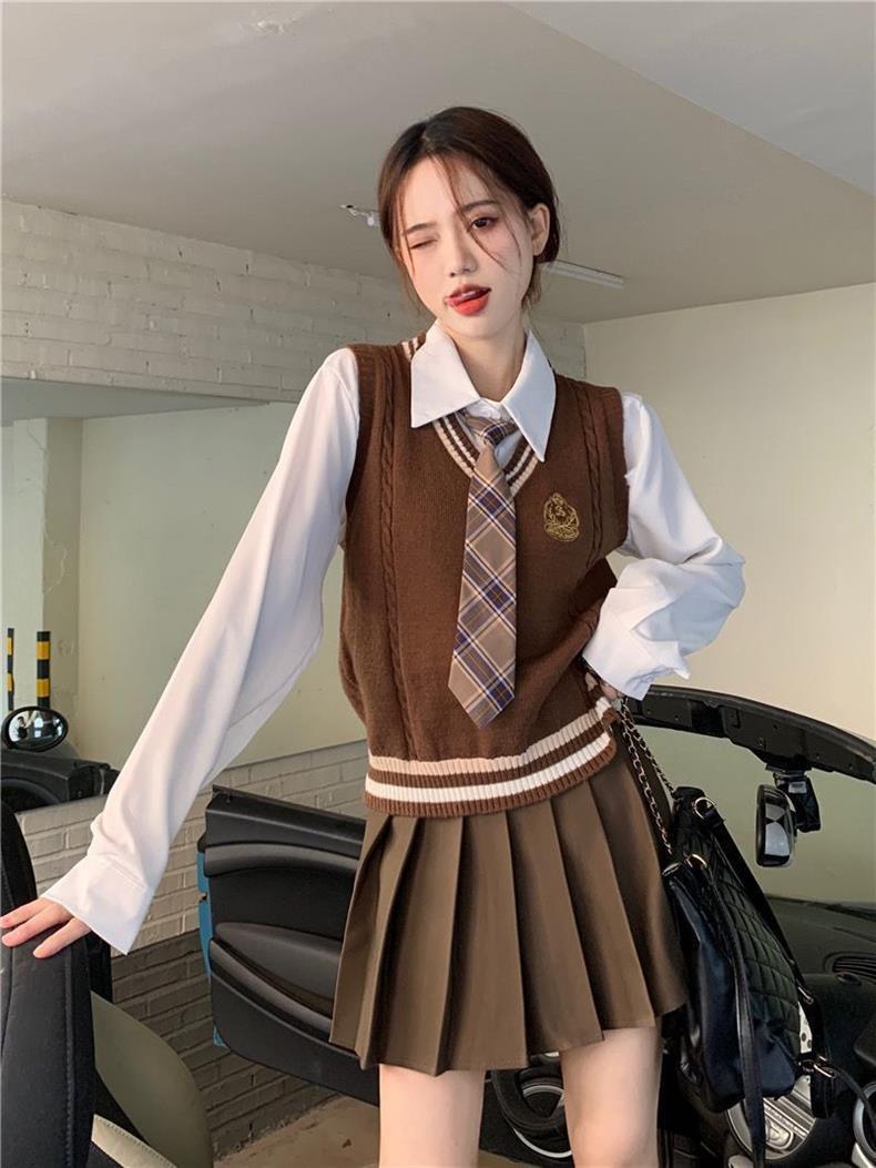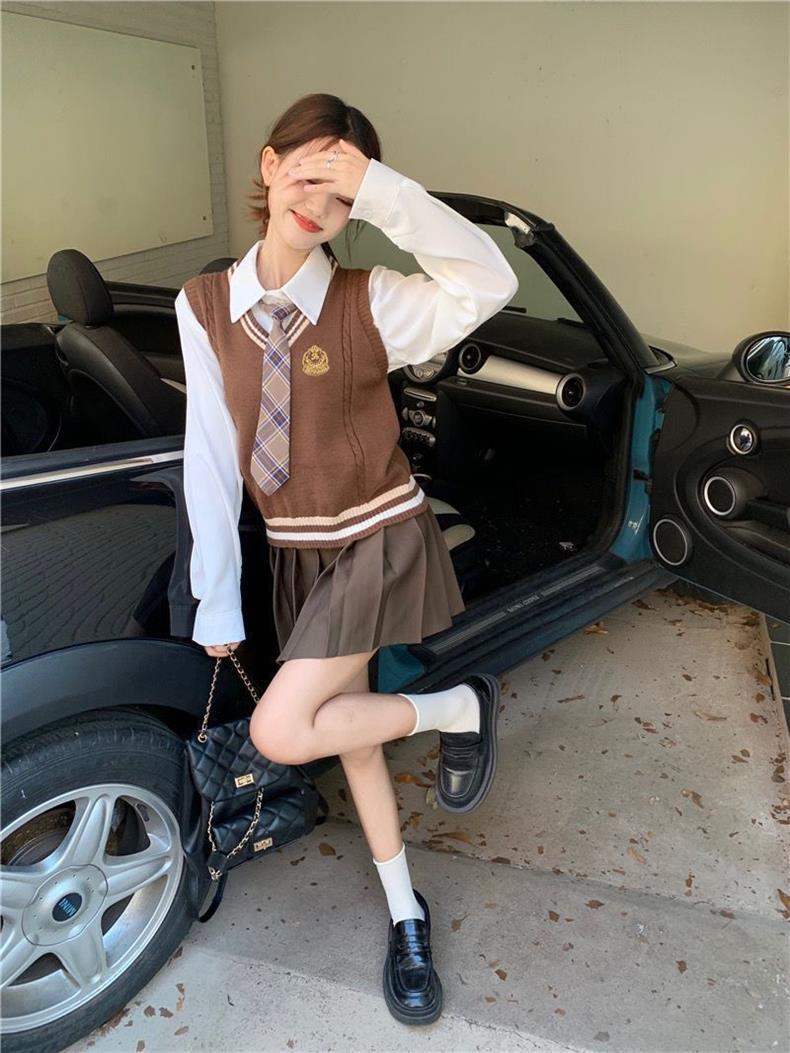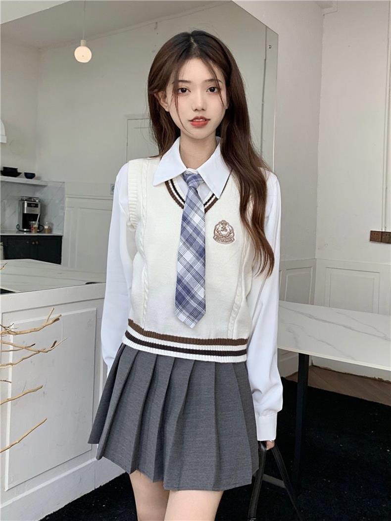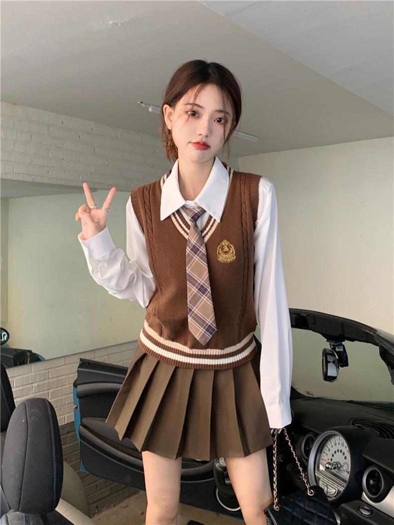 Traje de uniforme jk americano falda estilo universitario para mujer otoño que reduce la edad chaleco de punto camisa falda plisada traje de tres piezas