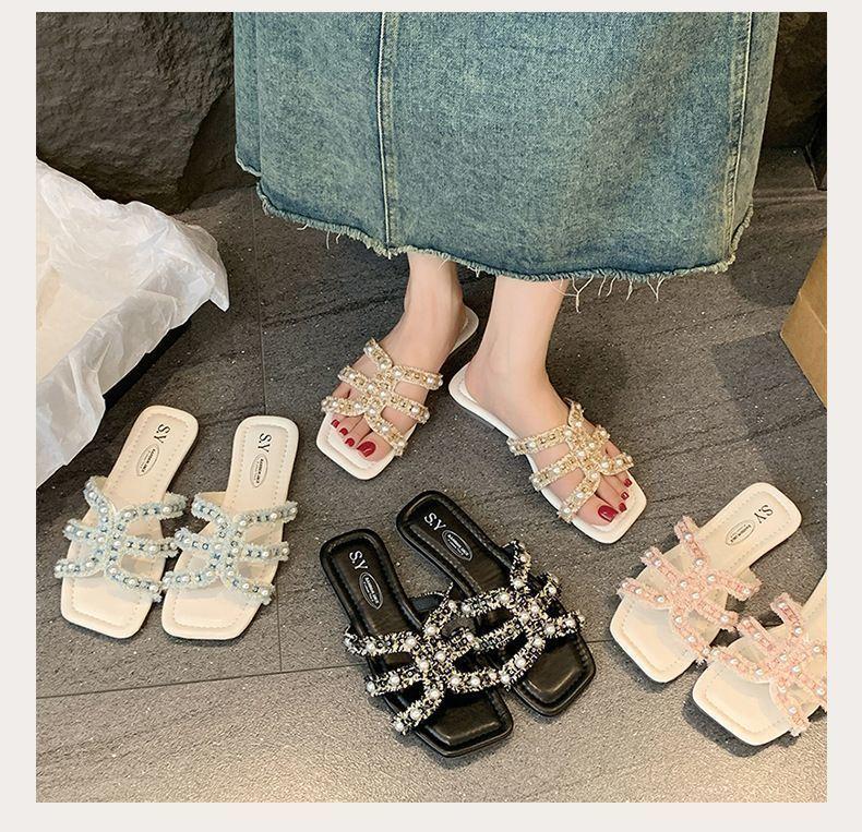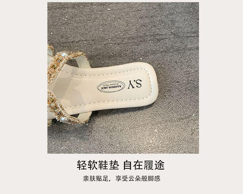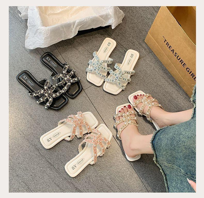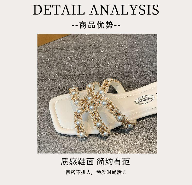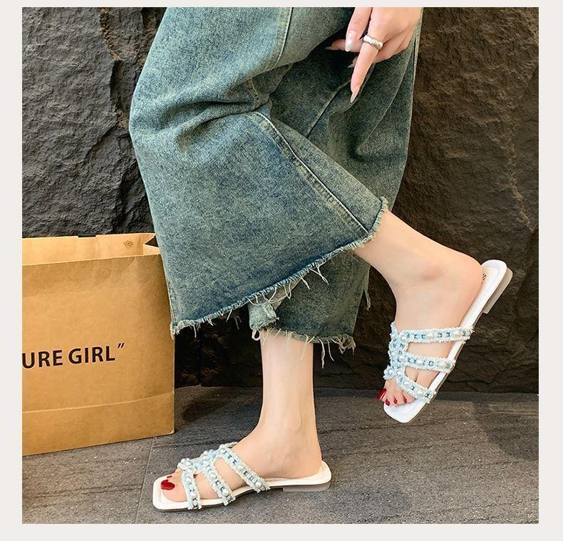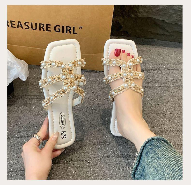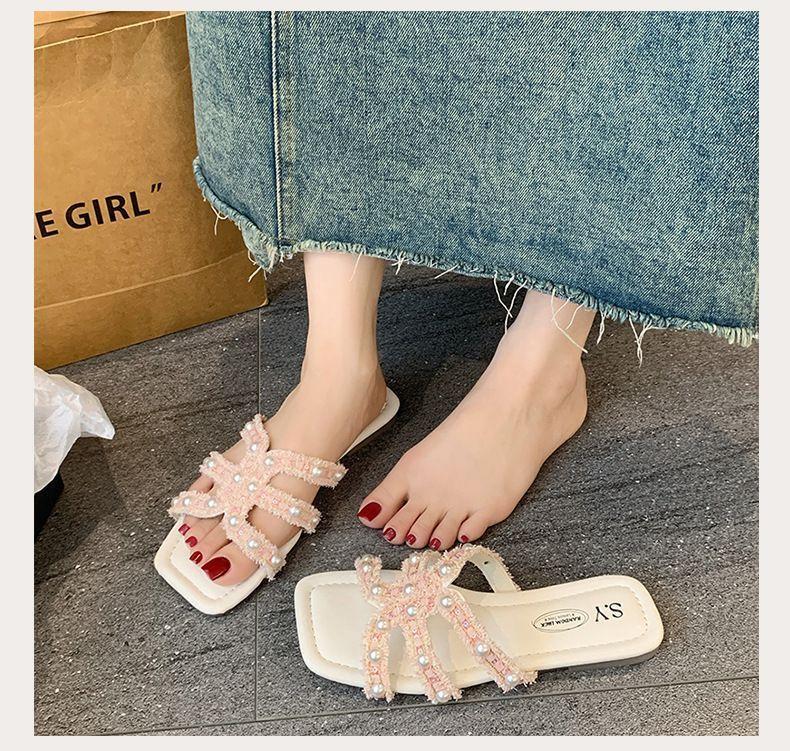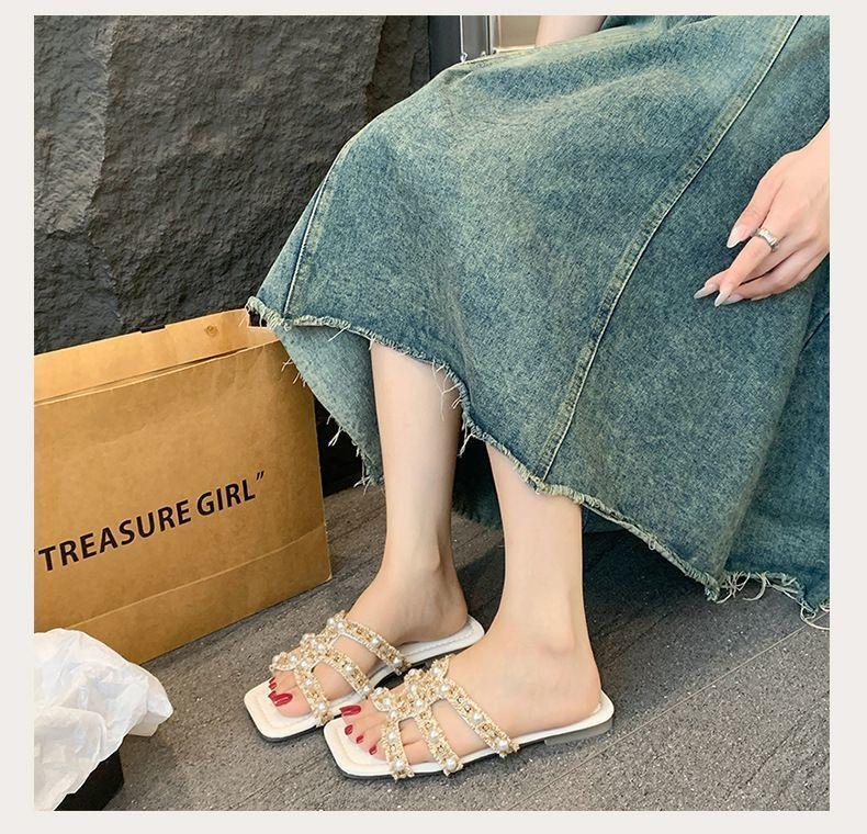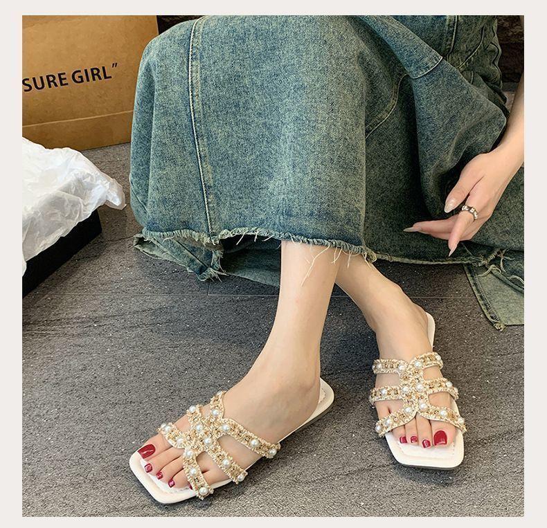 2025 Verano Nuevo Estilo Pequeño Chanel Zapatillas Planas para Mujer para Exterior Suela Suave Estilo Hada Versátiles Perlas Sandalias de Playa Mujer